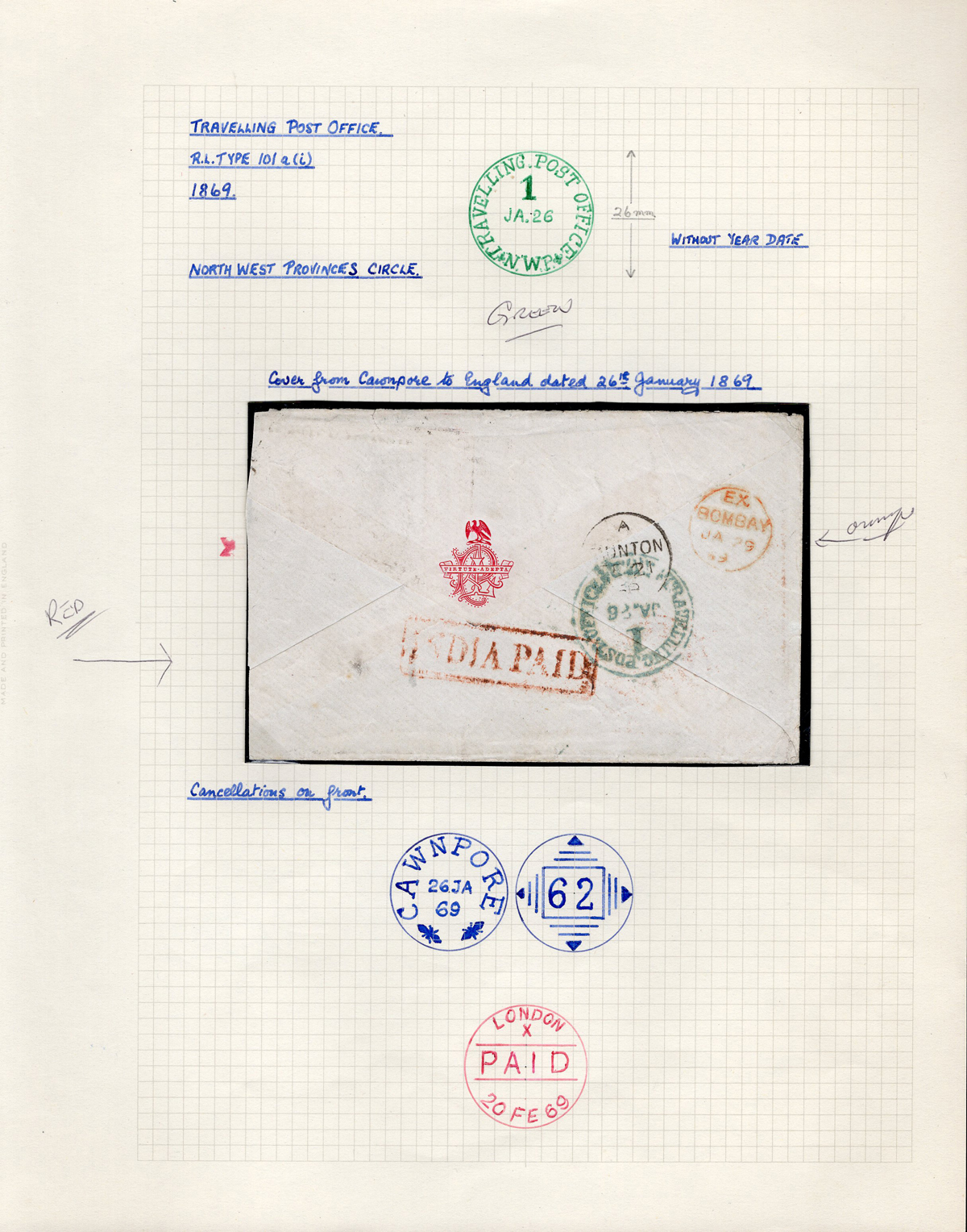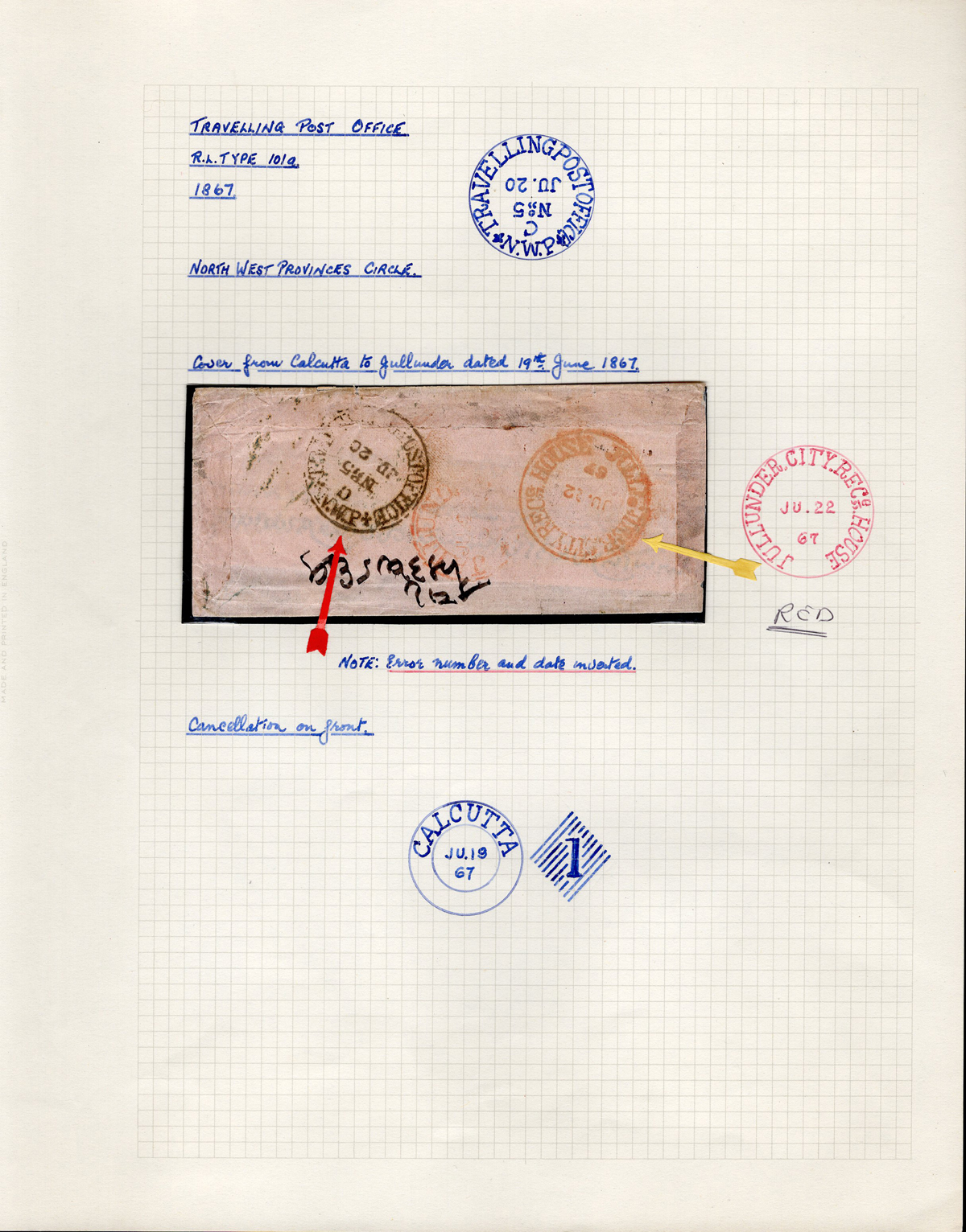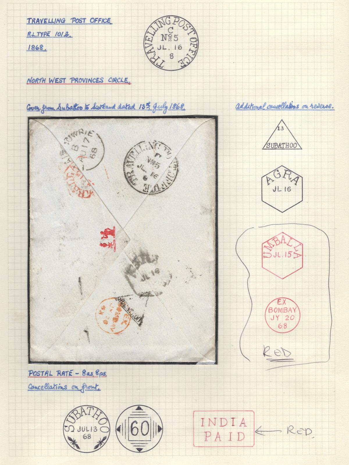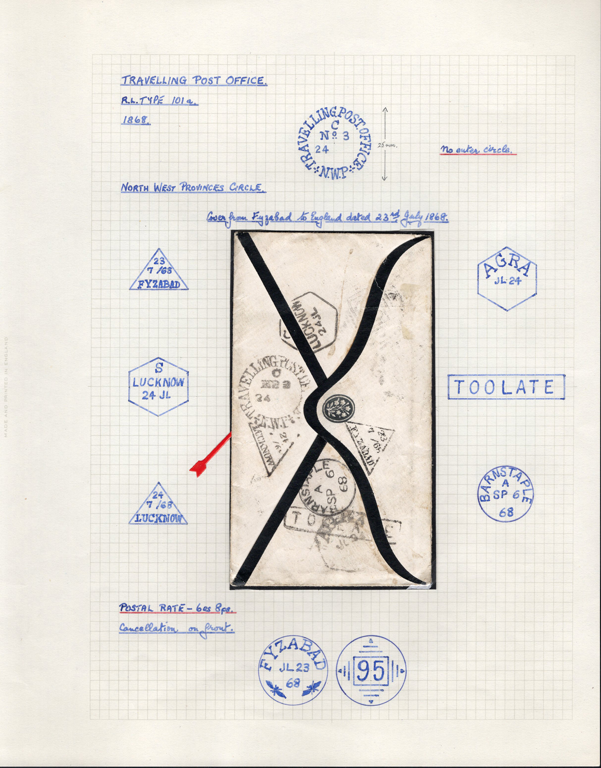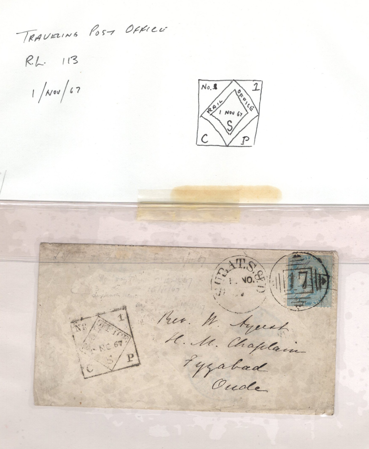 694 CVR TPO imageThree Covers with "Travelling Post Office / N.W.P." Postmarks, 1867 to 1869, 1867 with "Travelling Post Office / N.W.P." in green (with inverted indicia) on back of cover from Calcutta (#1 duplex in green ties half Anna stamp) to Jullunder (with large "Jullunder City Rec'g House" in orange), 1868 "Travelling Post Office / N.W.P." in black on back of a mourning 3 colour franking cover from Fyzabad (#95 duplex) to England (with many interesting postmarks) and 1869 "Travelling Post Office / N.W.P." in green on back of cover from Cawnpore (#62 duplex) to England (via Marseilles, with london receiver, etc. cut down at left). A fine or better trio. (Scan 1) (Scan 2) (Scan 3) (Scan 4) (Scan 5) (Scan 6) (All Scans) (All Images)