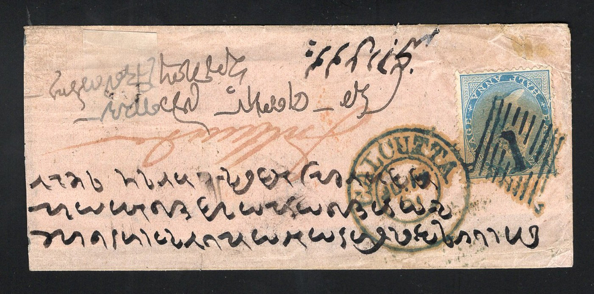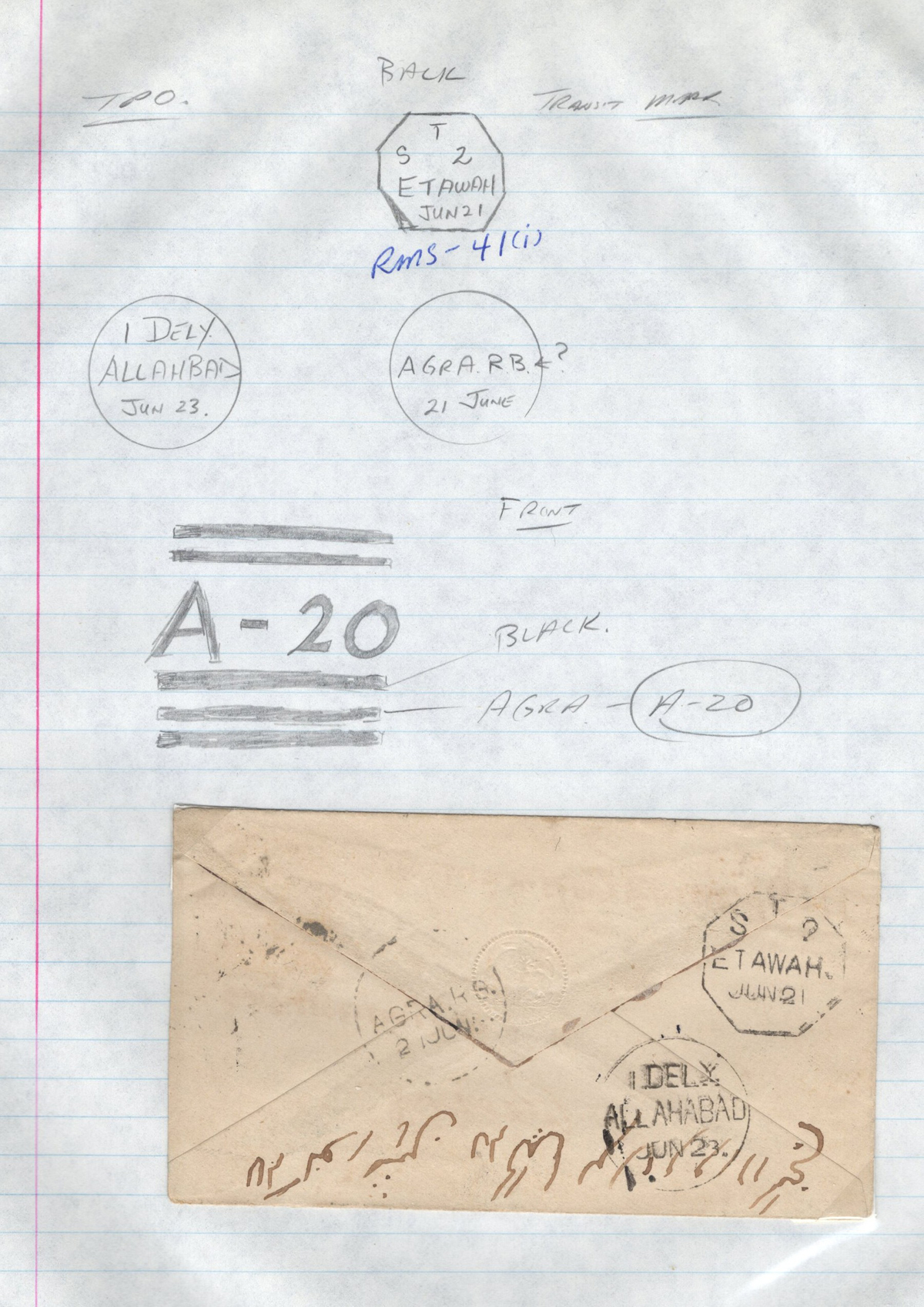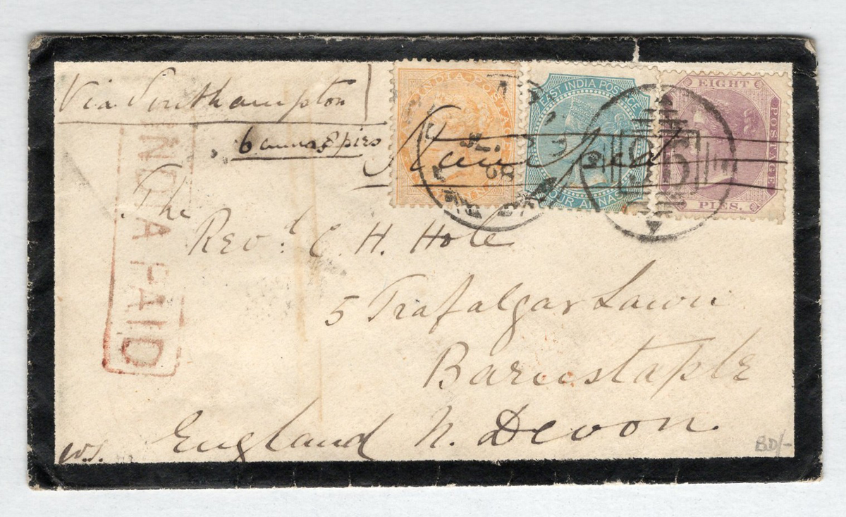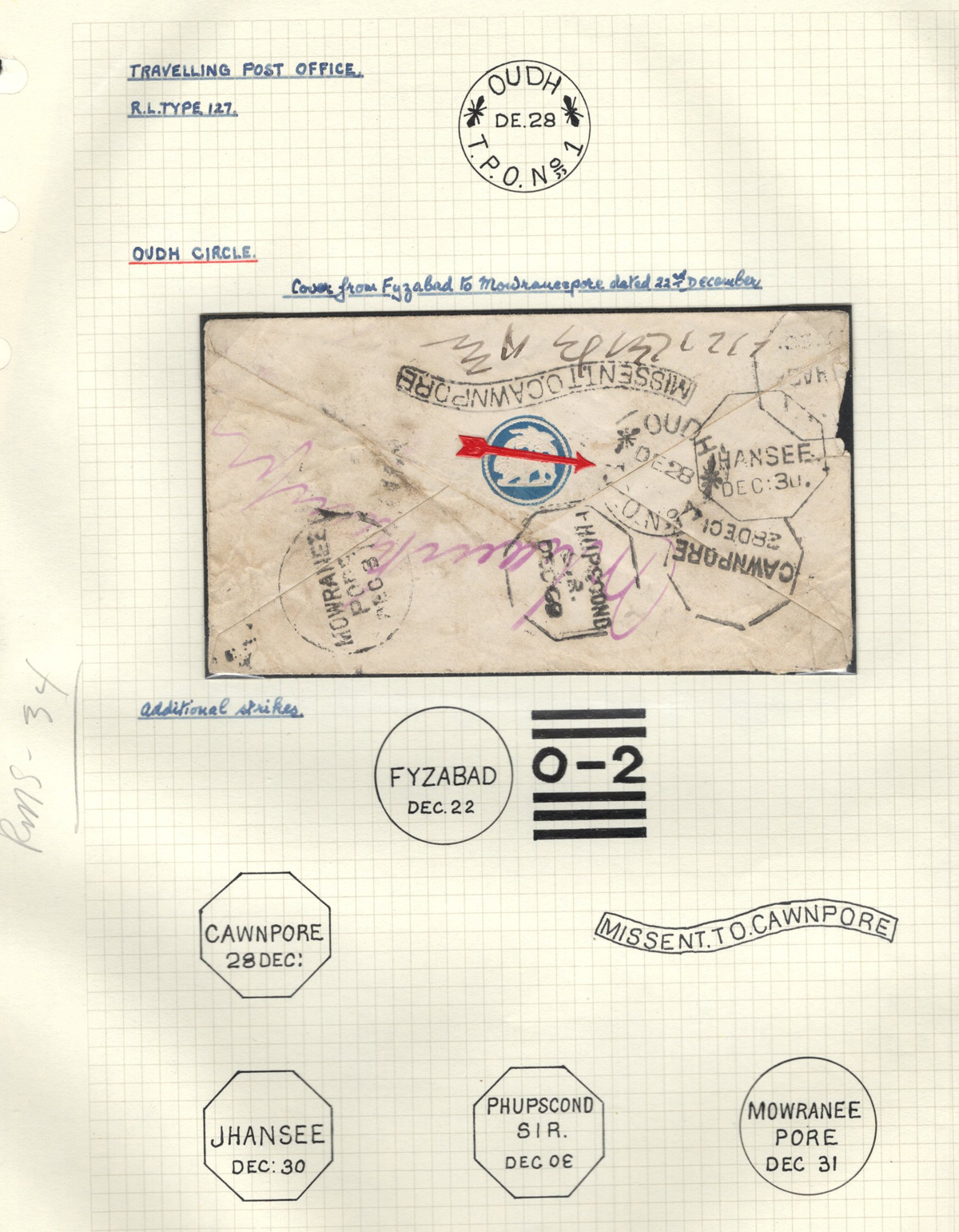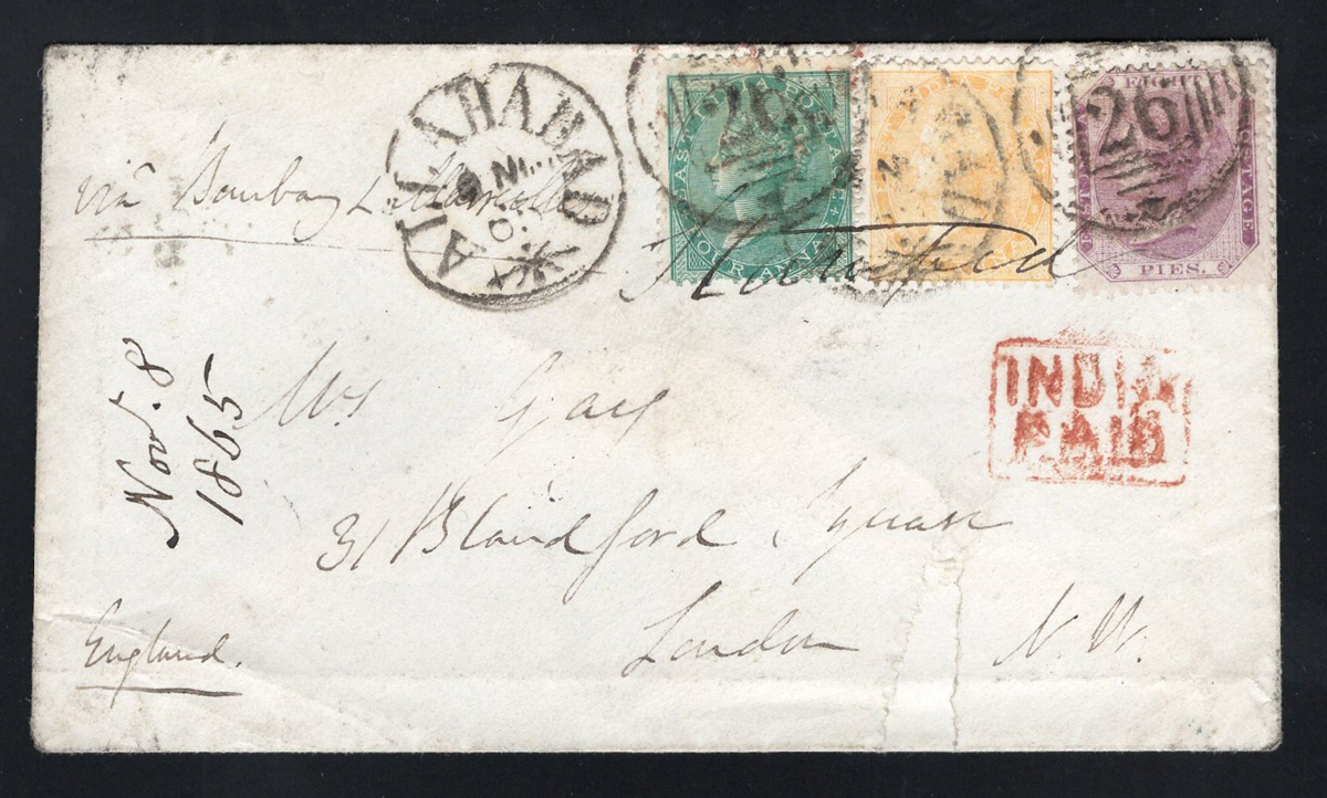 694 CVR TPO imageThree Covers with "Travelling Post Office / N.W.P." Postmarks, 1867 to 1869, 1867 with "Travelling Post Office / N.W.P." in green (with inverted indicia) on back of cover from Calcutta (#1 duplex in green ties half Anna stamp) to Jullunder (with large "Jullunder City Rec'g House" in orange), 1868 "Travelling Post Office / N.W.P." in black on back of a mourning 3 colour franking cover from Fyzabad (#95 duplex) to England (with many interesting postmarks) and 1869 "Travelling Post Office / N.W.P." in green on back of cover from Cawnpore (#62 duplex) to England (via Marseilles, with london receiver, etc. cut down at left). A fine or better trio. (Scan 1) (Scan 2) (Scan 3) (Scan 4) (Scan 5) (Scan 6) (All Scans) (All Images)