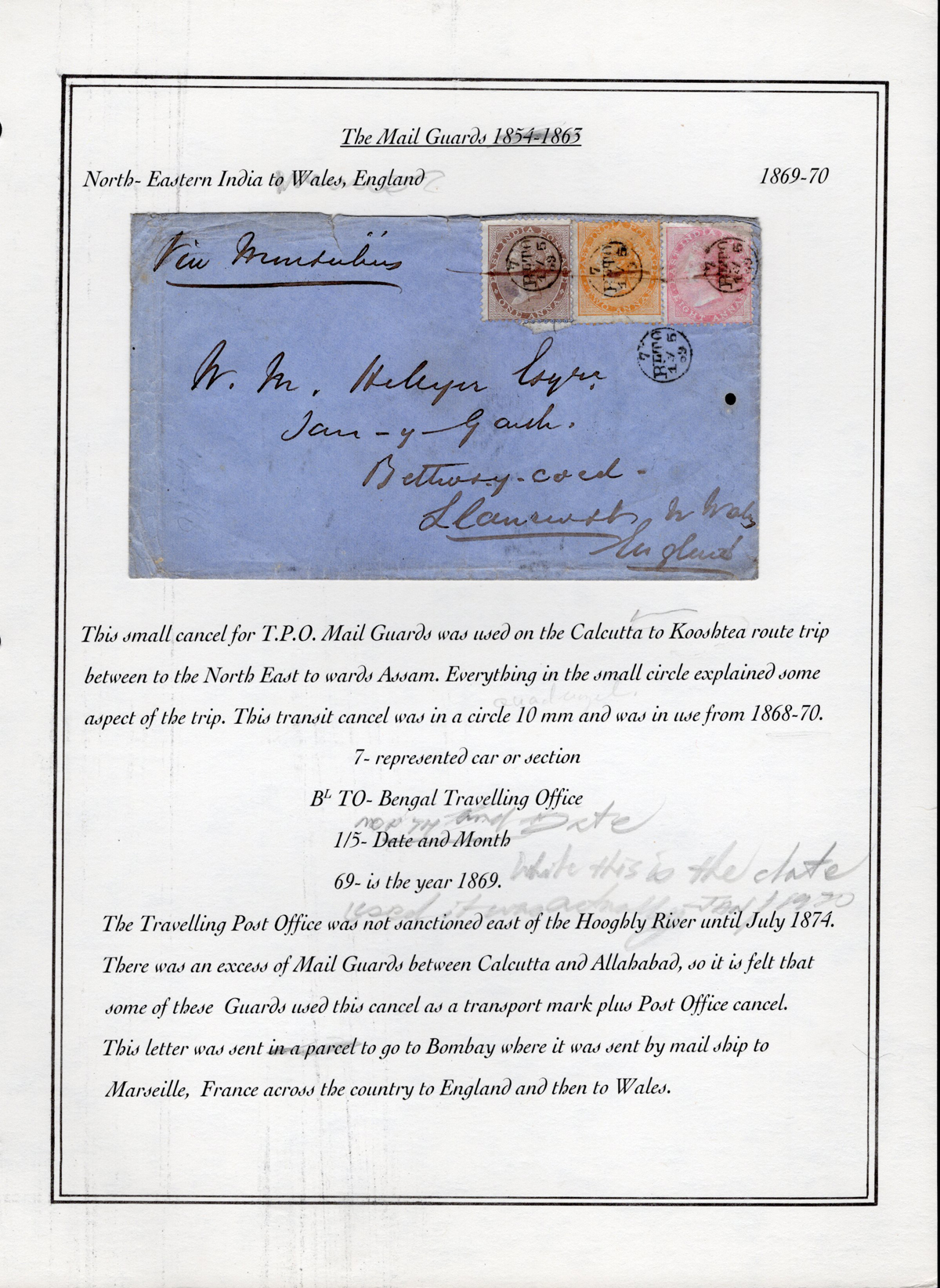 684 CVR TPO image1870 Bengal Mail Guards Cover to England, with four strikes (three canceling stamps and one free-strike) of the small "Mail Guards" postmarks dated "1 / 5 / 69" (error for 1870) on a blue cover to England (JAN.31.1870 receiver) through Bombay ("EX" transit in red dated JAN.8.1870). The cover is franked with an 8a rose, 2a orange and 1a brown (totaling 11a). Bit of edge wear, else a fine example of this scarce postmark.