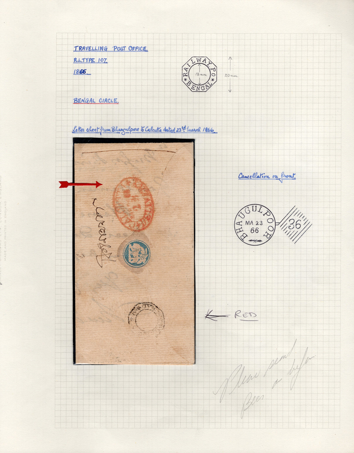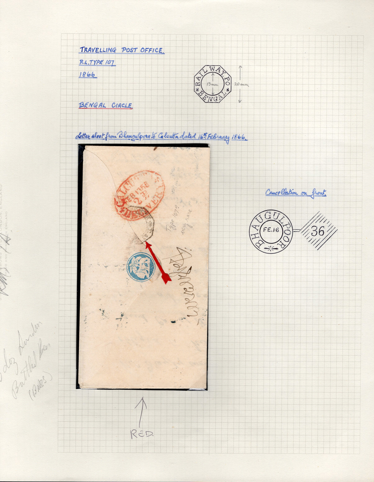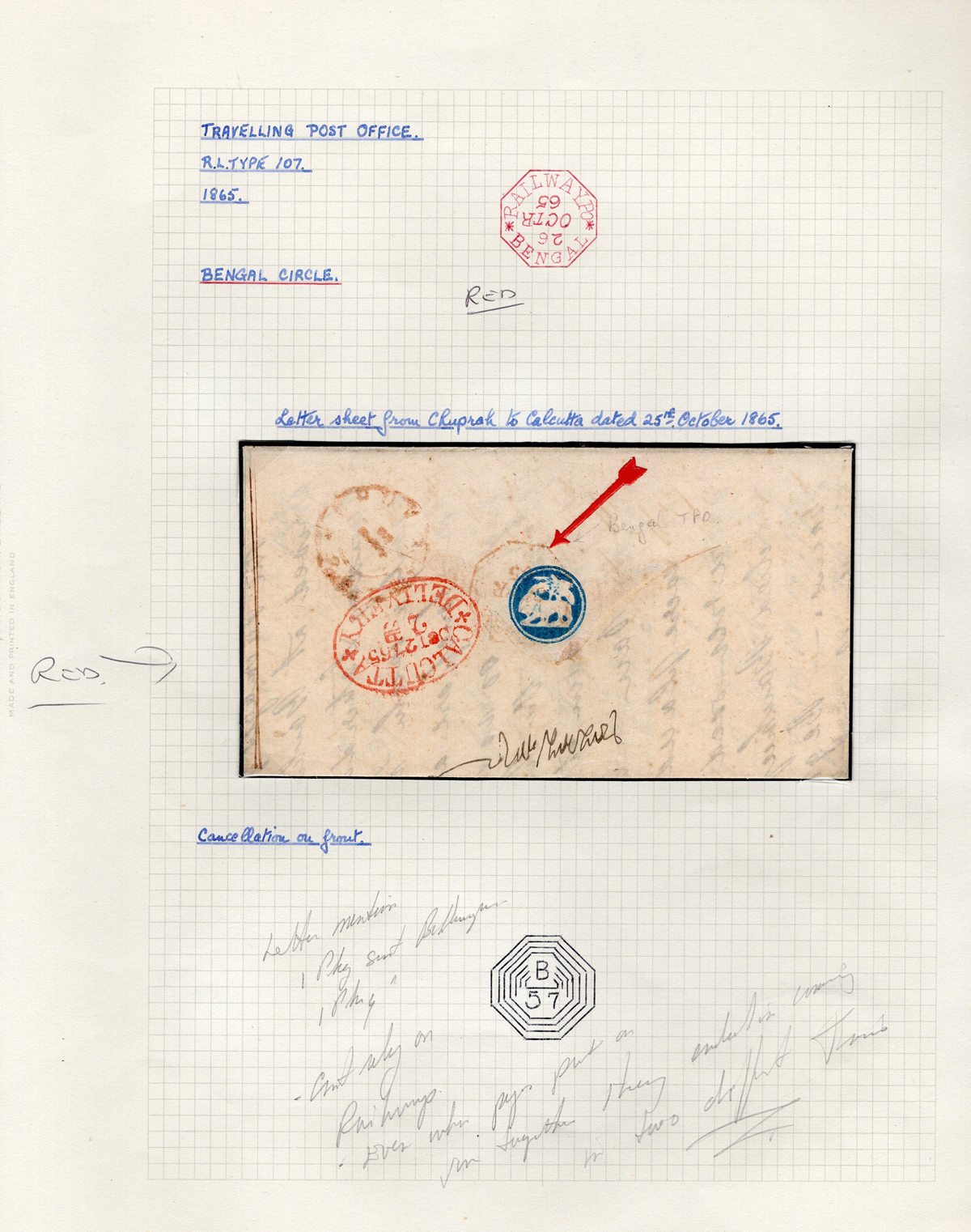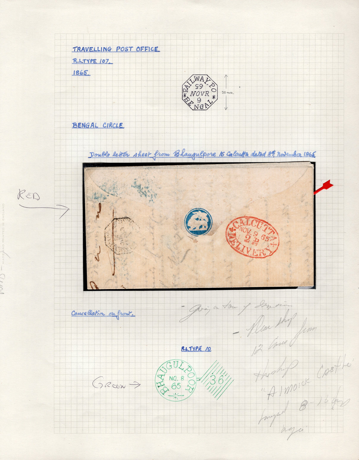 686 CVR TPO imageFour Early Bengal T.P.O. Covers, 1865-1866, 1865 "Railway P.O. / Bengal" octagonal in black on cover from Bhaugulpoor (duplex 36 in green) to Calcutta ("Calcutta / Delivery" oval in red), 1865 "Railway P.O. / Bengal" octagonal in red on cover from Chuprah (B/57 in octagon) to Calcutta (Calcutta / Delivery oval in red), 1866 "Railway P.O. / Bengal" octagon in black (has no date inside) on cover Bhaugulpoor (duplex 36) to Calcutta ("Calcutta / Delivery" oval in red) and a second similar cover. All four have their original letters still inside, fine-very fine. (Scan 1) (Scan 2) (Scan 3) (Scan 4) (Scan 5) (Scan 6) (Scan 7) (Scan 8) (All Scans) (All Images)