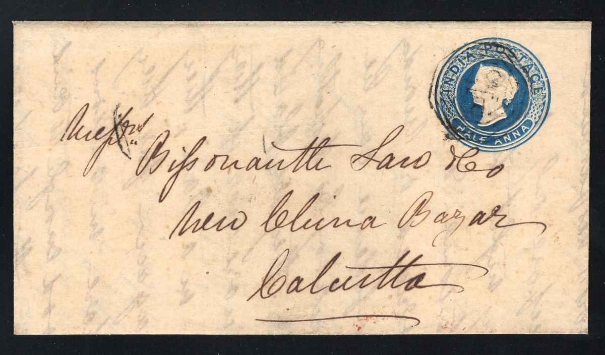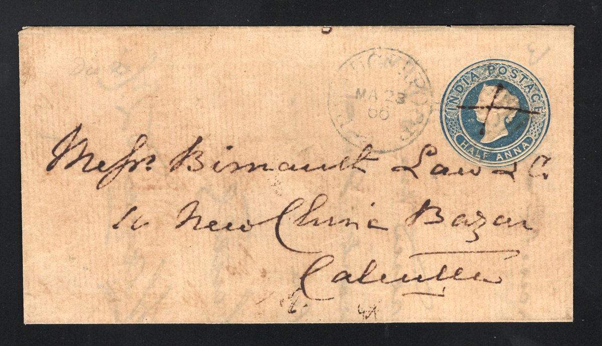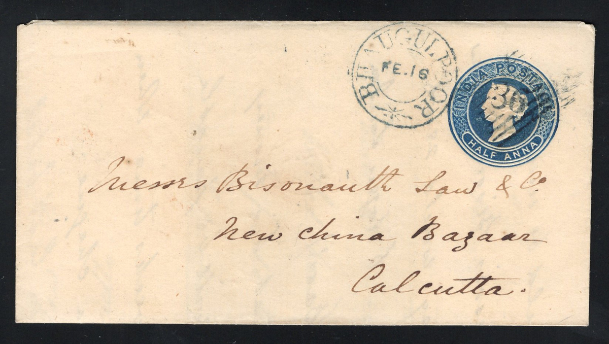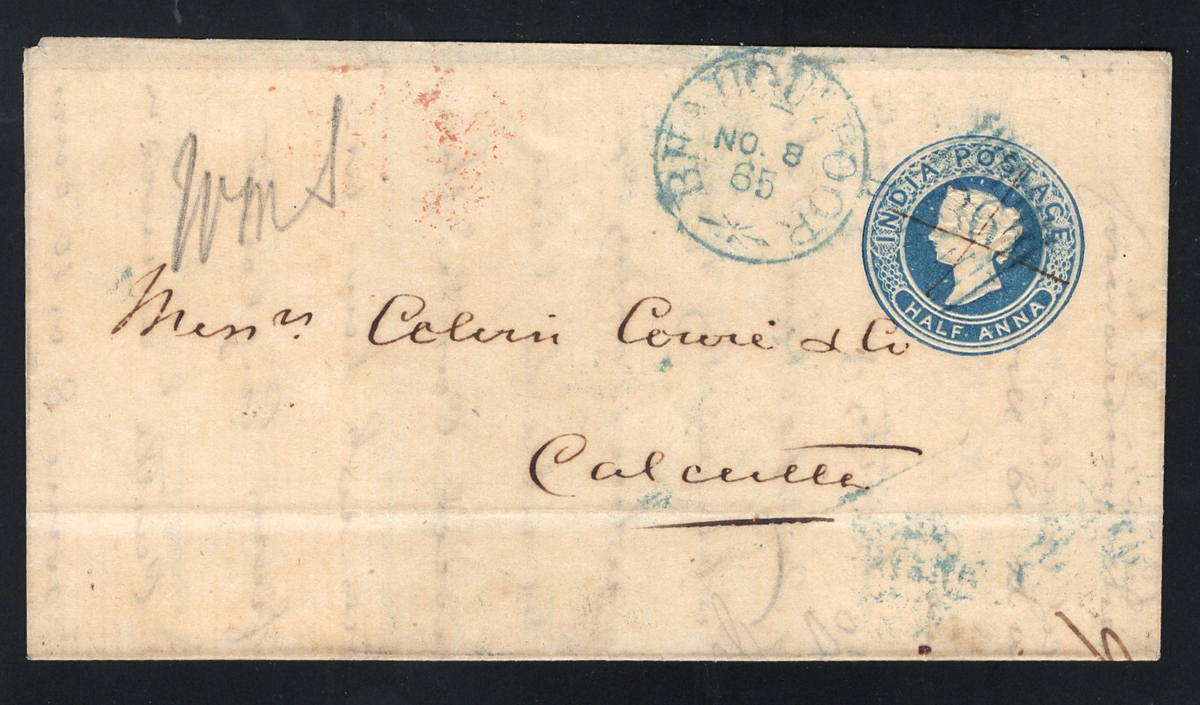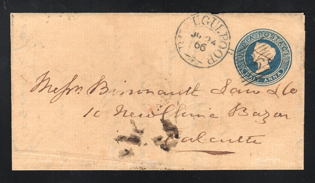 686 CVR TPO imageFour Early Bengal T.P.O. Covers, 1865-1866, 1865 "Railway P.O. / Bengal" octagonal in black on cover from Bhaugulpoor (duplex 36 in green) to Calcutta ("Calcutta / Delivery" oval in red), 1865 "Railway P.O. / Bengal" octagonal in red on cover from Chuprah (B/57 in octagon) to Calcutta (Calcutta / Delivery oval in red), 1866 "Railway P.O. / Bengal" octagon in black (has no date inside) on cover Bhaugulpoor (duplex 36) to Calcutta ("Calcutta / Delivery" oval in red) and a second similar cover. All four have their original letters still inside, fine-very fine. (Scan 1) (Scan 2) (Scan 3) (Scan 4) (Scan 5) (Scan 6) (Scan 7) (Scan 8) (All Scans) (All Images)