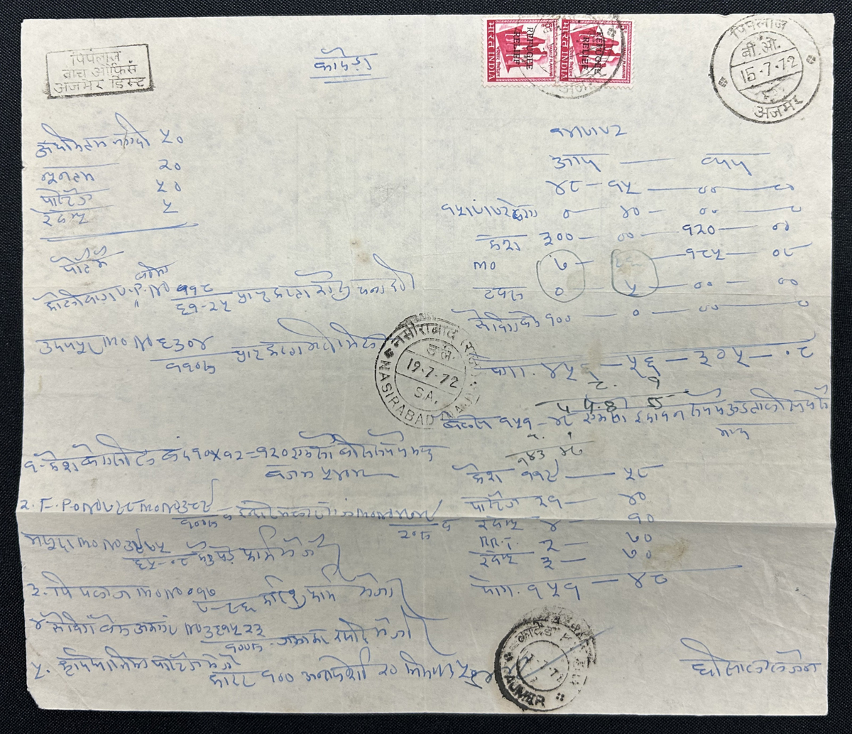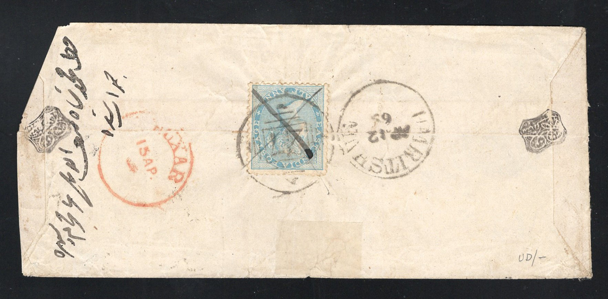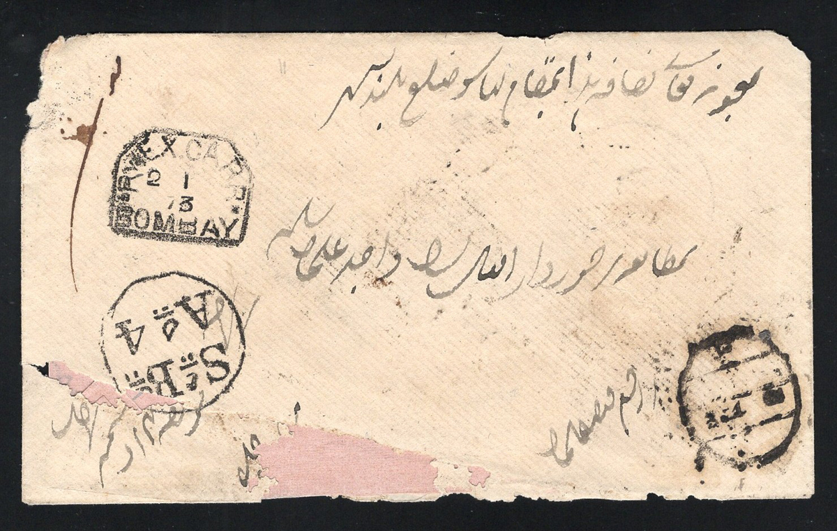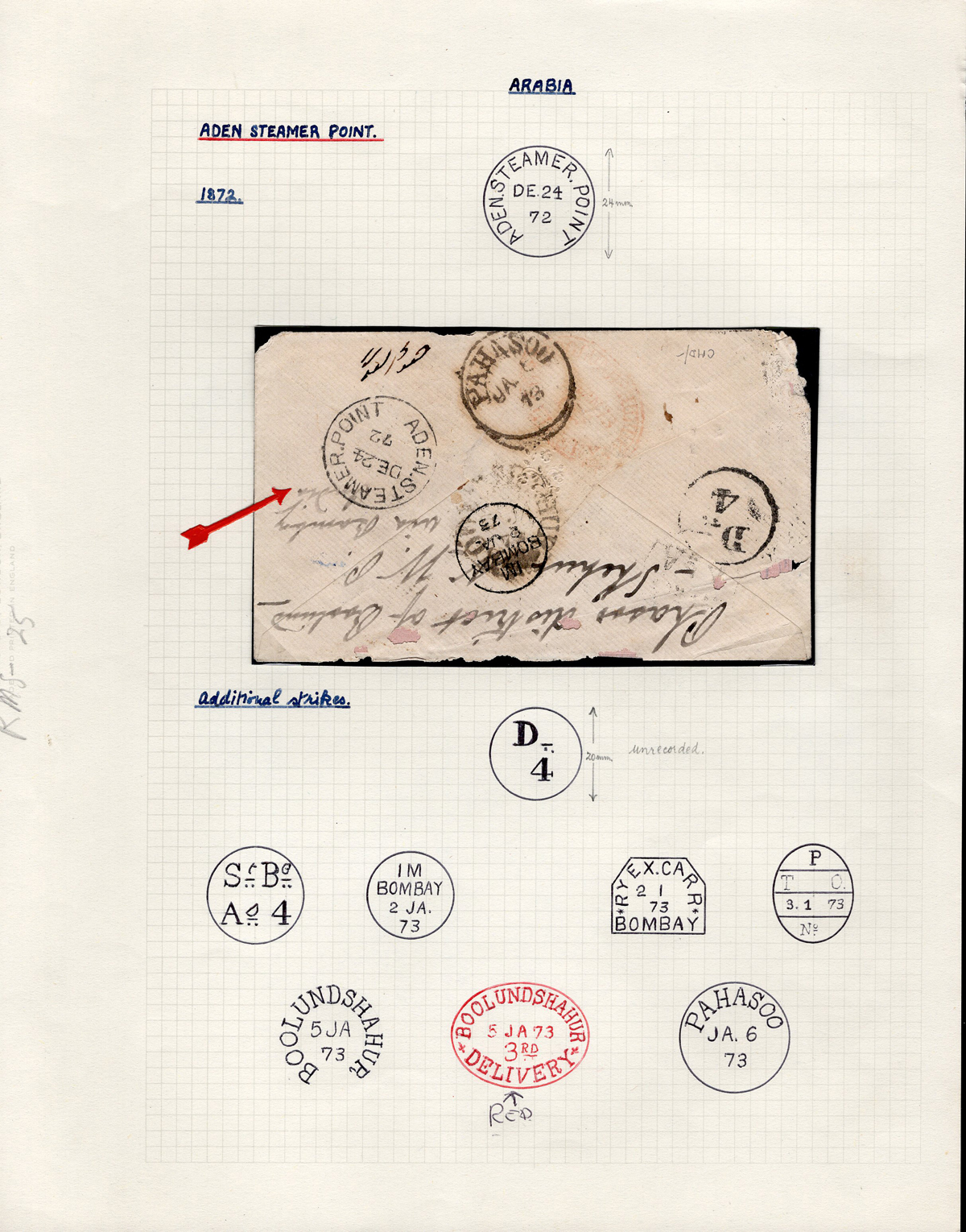 688 CVR TPO image1872 "Aden Steamer Point" Postmark on Cover, a stampless cover mailed "Aden Steamer Point" on DEC.24.1872 to Pahasoo (JAN.6 receiver) through Bombay (JAN.2 railway postmark and JAN.2 transit), with Boolundshahur (JAN.5 in circular datestamp) and Boolundshahur / Delivery (JAN.5 red oval) plus a few other postmarks illustrated on accompanying page. The cover has faults, but still has its original letter inside and has lots of postmark and routing interest. (Scan 1) (Scan 2) (All Scans) (All Images)