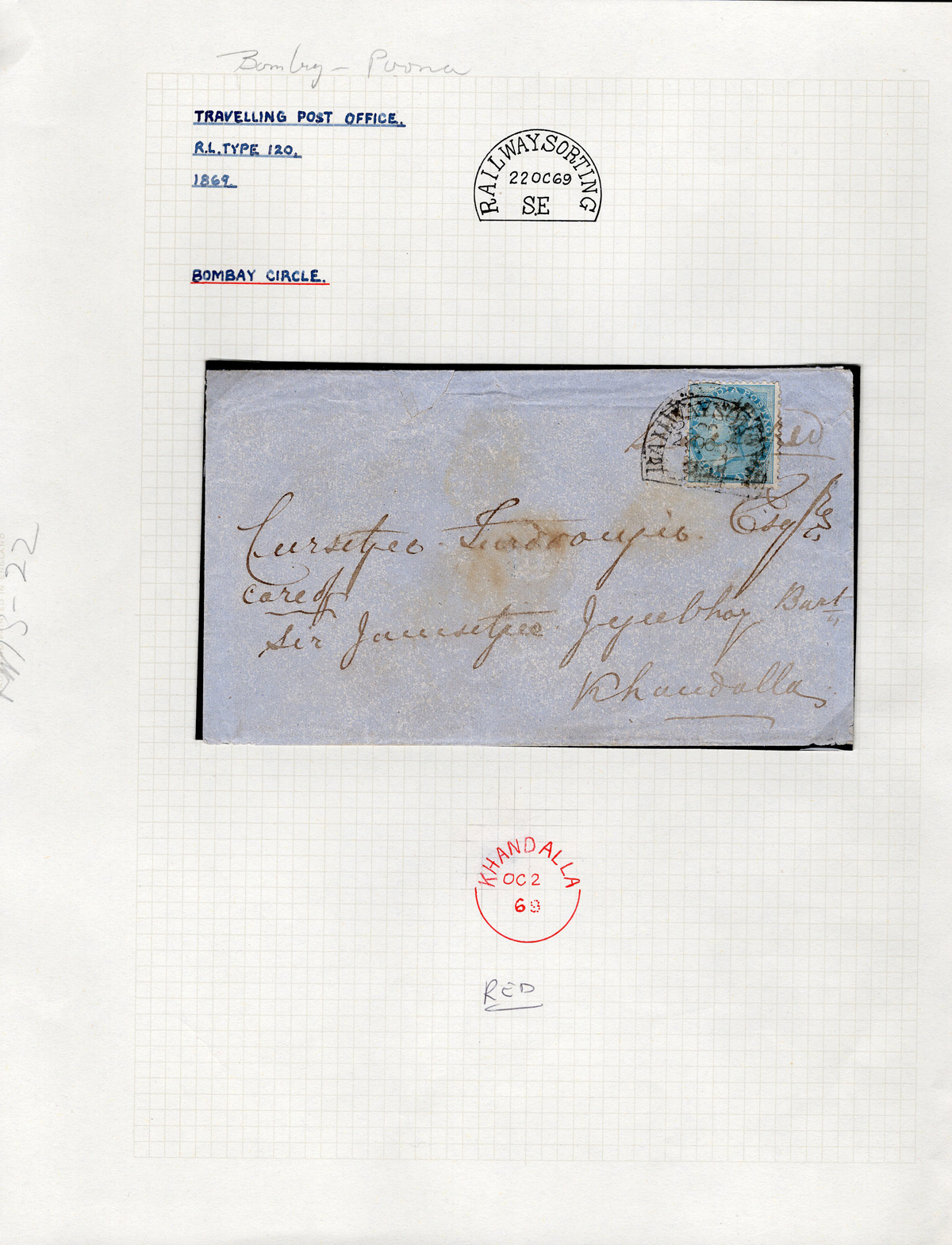687 CVR TPO image1869 "Railway Sorting" Half Circle Postmark on Cover, dated OCT.22.1869, canceling a half Anna stamp on a cover to Khandalla (light receiver in red on back), a fine example of this scarce postmark.