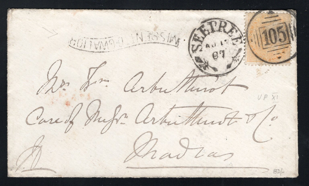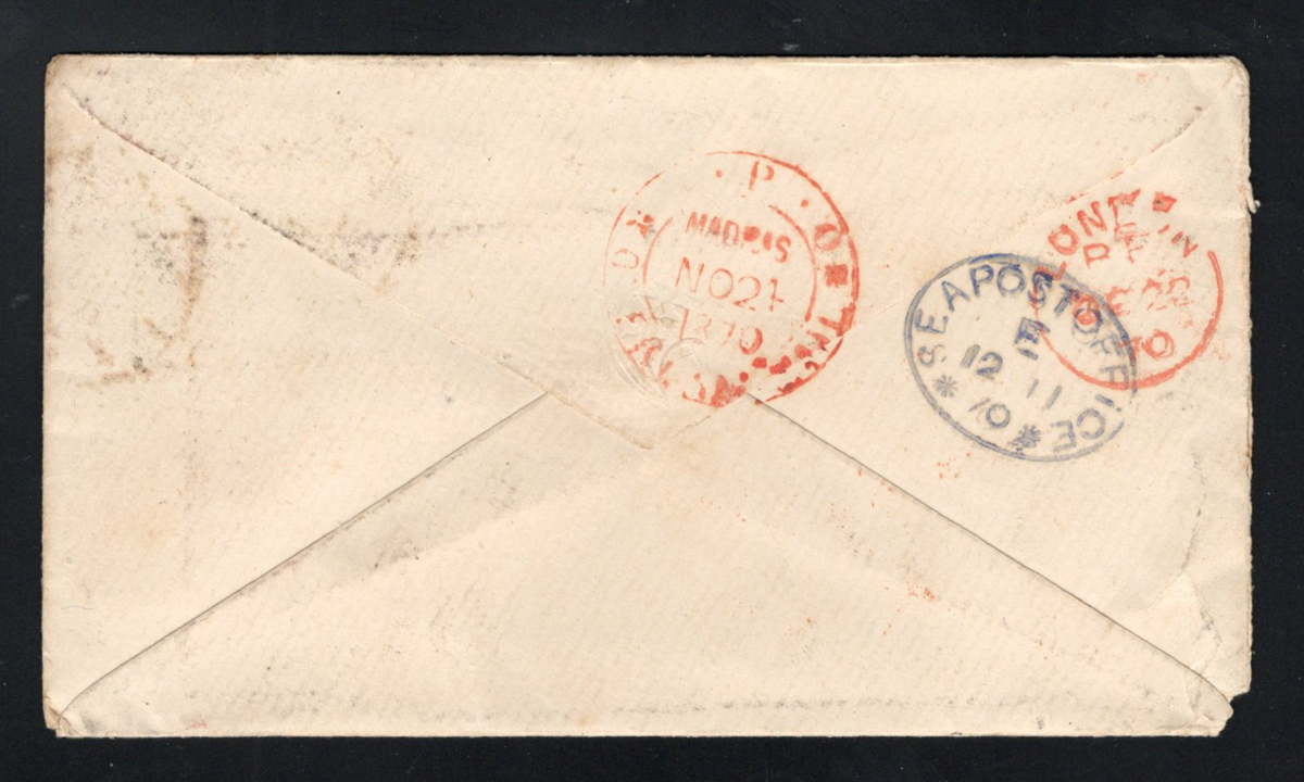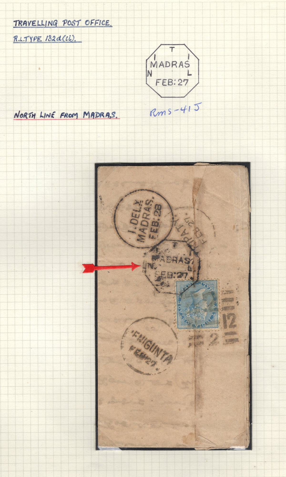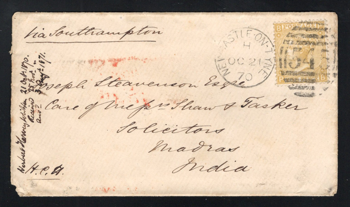 690 CVR TPO image1870 Incoming Cover with "G.P.O. Overland Mail" Double Circle Postmark, mailed OCT.21.1870 from Newcastle-on-Tyne England (franked with a 9d straw Plate 4 - Scott #46, U$1,600 on cover) endorsed "via Southampton" to Madras, with a London transit in red and an oval Sea Post Office transit in black. The NOV.24.1870 "G.P.O. Overland Mail" postmark in red was applied on back (owner states "it is suggested that the Overland Mail cancellation was applied at a Railway Office at the Madras end of the Bombay-Madras Railway"). Very fine. (Scan 1) (Scan 2) (All Scans) (All Images)