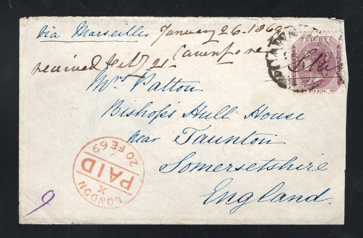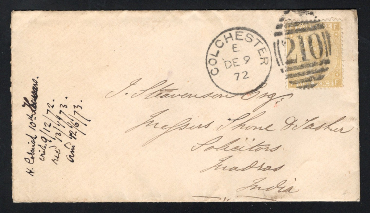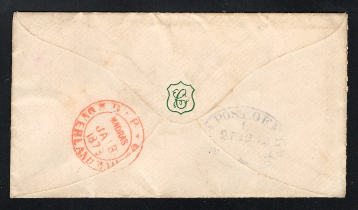 691 CVR TPO image1872 Incoming Cover with "G.P.O. Overland Mail" Double Circle Postmark, mailed DEC.9.1872 from Colchester England (franked with a 9d straw Plate 4 - Scott #46, U$1,600 on cover) to Madras India, with an oval Sea Post Office transit in black. The JAN.18.1873 "G.P.O. Overland Mail" postmark in red was applied on back, very fine. (Scan 1) (Scan 2) (All Scans) (All Images)