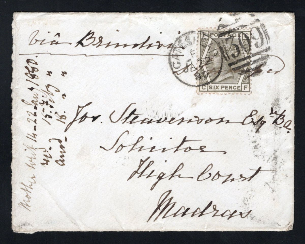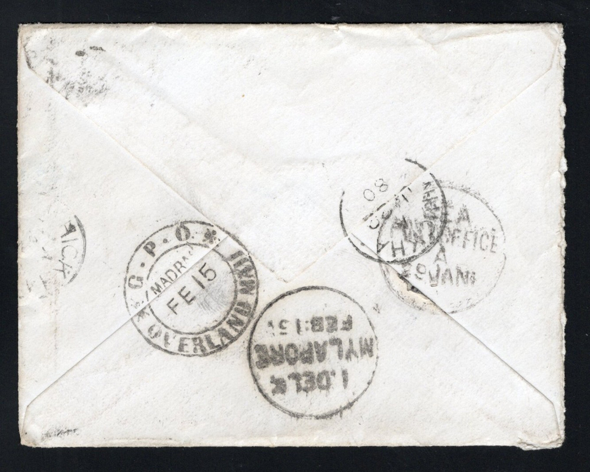 692 CVR TPO image180 Incoming Cover with "G.P.O. Overland Mail" Double Circle Postmark, mailed JAN.22.1880 from Gateshead England (franked with a 6d grey Plate 16 - Scott #62) to Madras ("via Brindisi"), with a circular Sea Post Office transit and Mylapore FEB.15 transit. The FEB.15 (no year date) "G.P.O. Overland Mail" postmark was applied on back in black, very fine. (Scan 1) (Scan 2) (All Scans) (All Images)