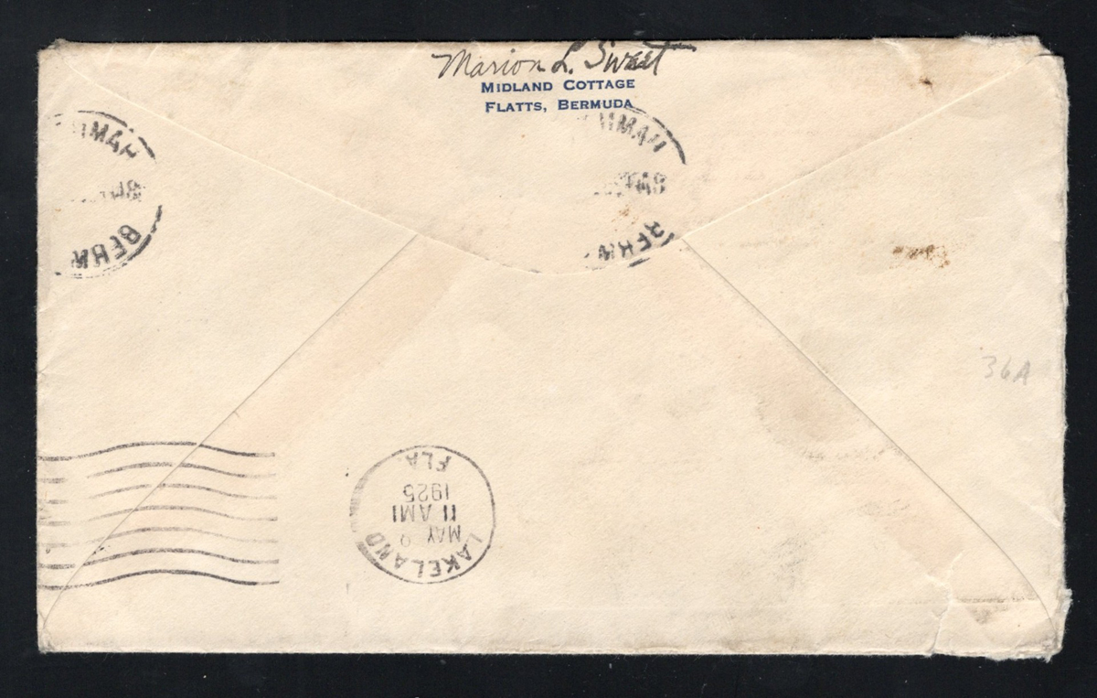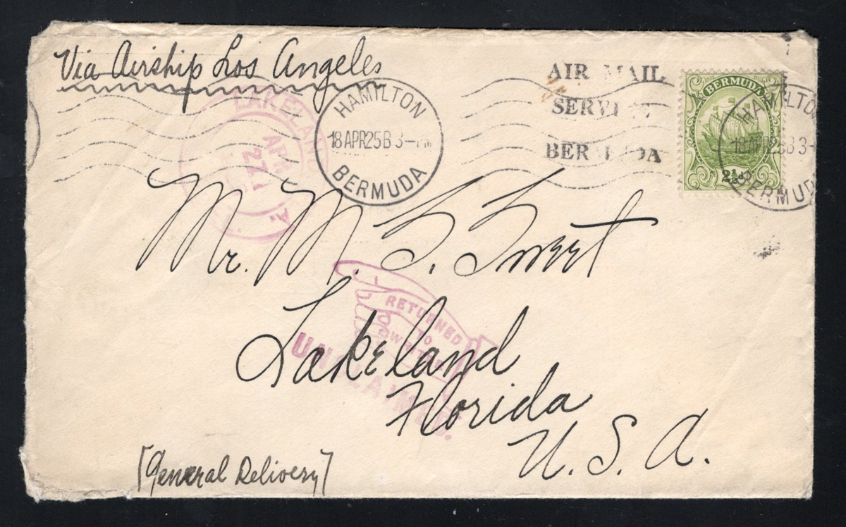 737 CVR Bermuda image1925 Bermuda to USA via Airship Los Angeles, mailed from Hamilton Bermuda on APR.18.1925 to Lakeland Florida (APR.27 receiver) through Miami, then received a "Return to Writer / Unclaimed" pointing finger and Lakeland MAY.9 despatch machine on back. The cover has a "Air Mail / Service / Bermuda" handstamp and is very fine.. (Scan 1) (Scan 2) (All Scans) (All Images)