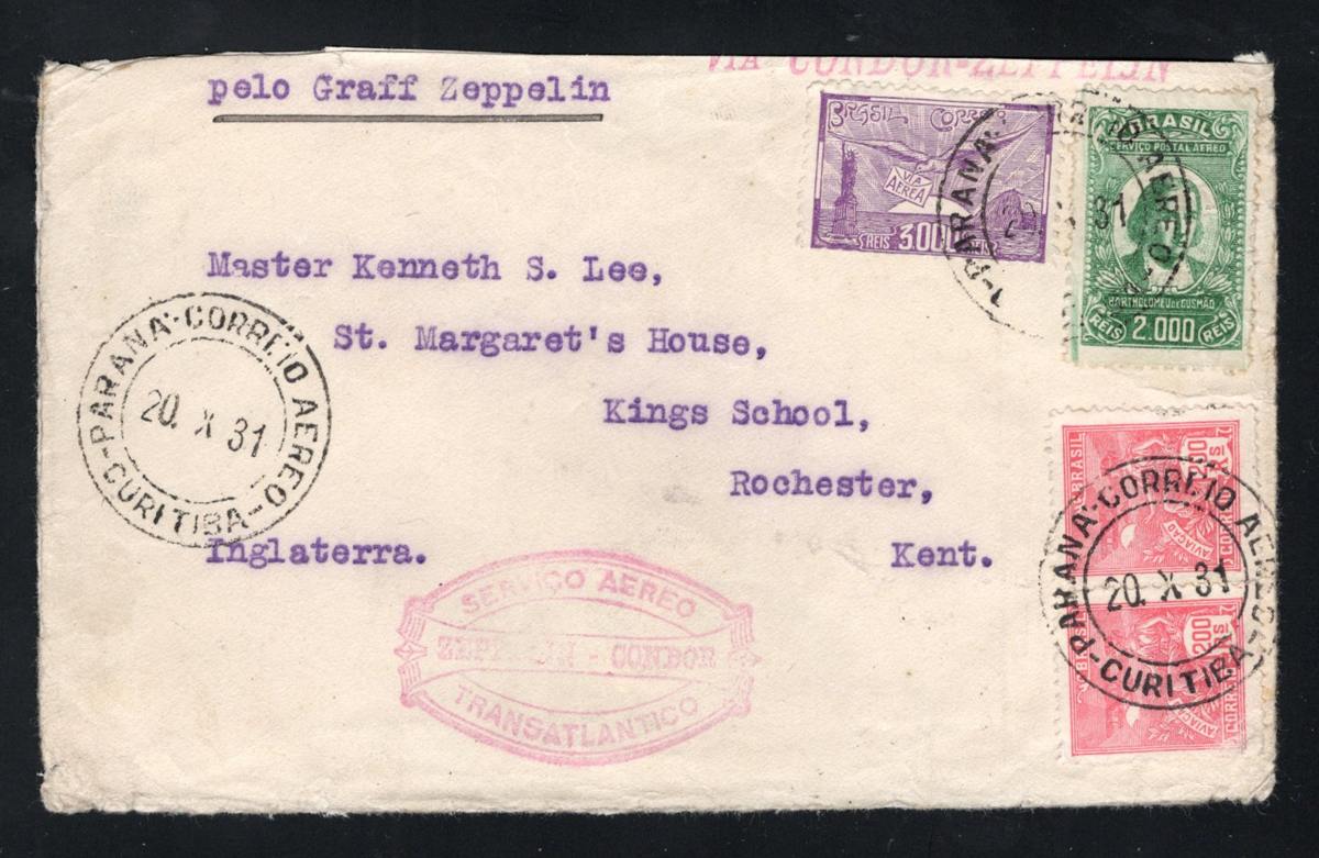 738 CVR Brazil image1931 Condor Zeppelin Cover Brazil to England mailed on OCT.20.1931, with red "Servico Aero / Zeppelin - Condor / Transatlantico" cachet and OCT.28.1931 Friedrichshafen receiver. The cover is endorsed "pelo Graff Zeppelin" and has a red "via Condor Zeppelin" handstamp. Very fine.