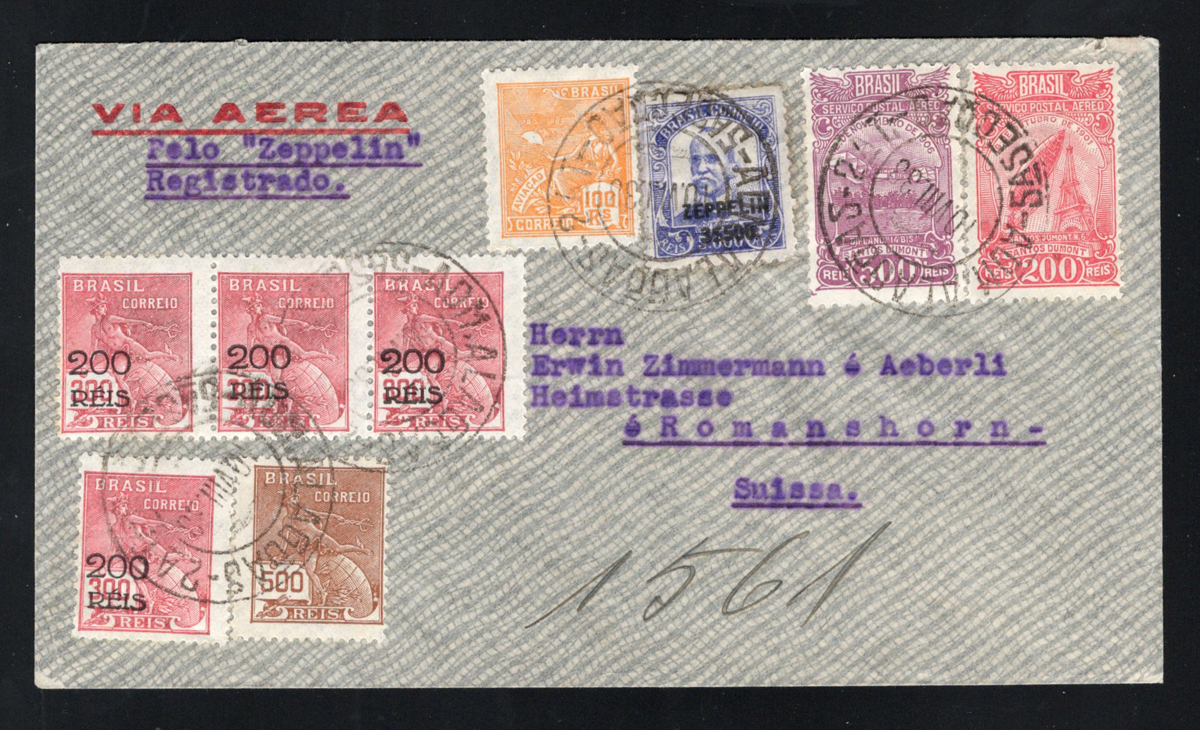 739 CVR Brazil image1933 Zeppelin Registered Cover Brazil to Switzerland, mailed on AUG.10.1933 on flight Z205a, endorsed "pelo Zeppelin Registrado" with light green Friedrichshafen flight cachet on back, very fine.