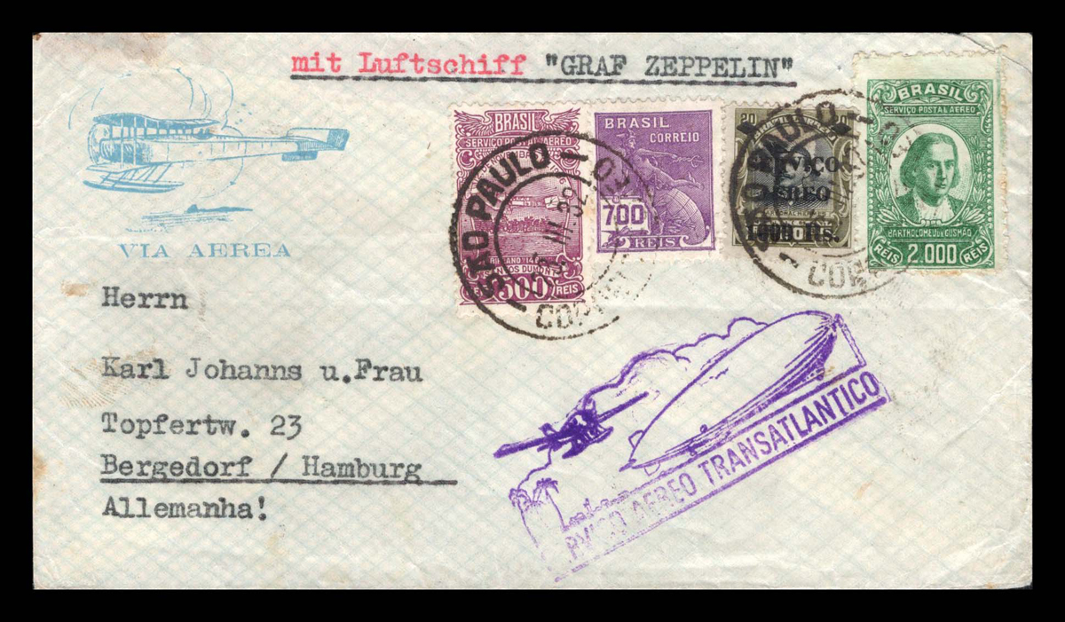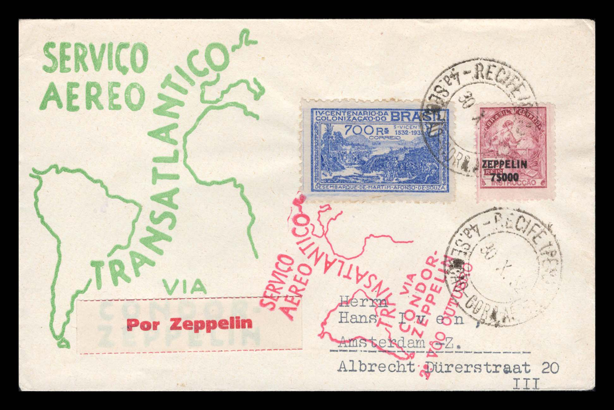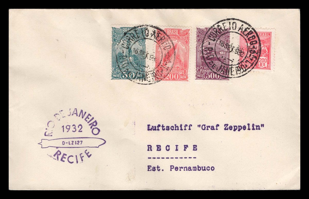 740 CVR Brazil image1932 Three Different Zeppelin Covers from Brazil, mailed on MAR.23.1932 to Germany (MAR.29 Friedrichshafen receiver), SEP,16.1932 to Pernambuco (SEP.18 receiver) and OCT.30.1932 to the Netherlands (NOV.3 Friedrichshafen receiver). Each has a different flight cachet on front, very fine. (Scan 1) (Scan 2) (Scan 3) (All Scans) (All Images)