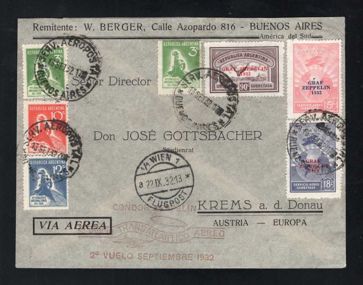 736 CVR Argentina image1932 Condor Zeppelin Cover from Argentina, mailed on SEP.13.1932 to Austria, with SEP.22 Vienna receiver, through Munich (SEP.22) and Friedrichshafen (SEP.21), franked with 7 stamps (C35-37 Zeppelin overprints, and 406-408), very fine.