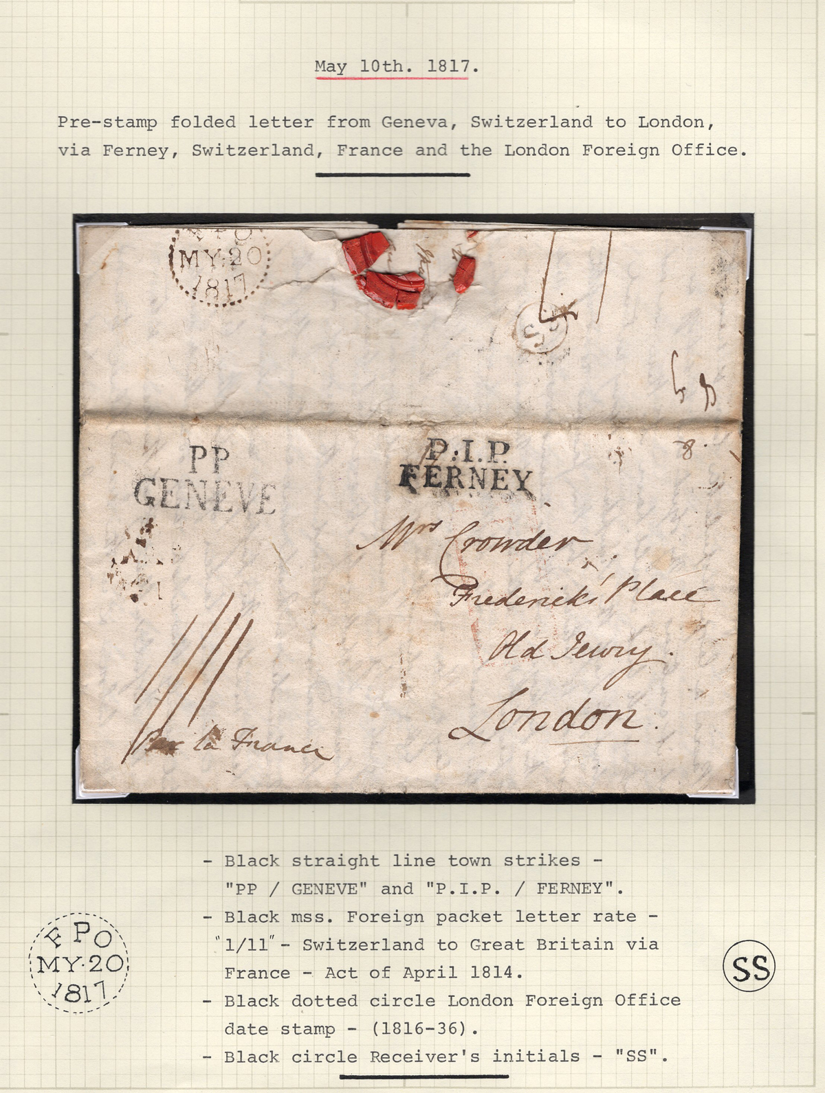 721 CVR   image1817 Folded Letter from Switzerland to England, mailed from Geneva on MAY.10.1817 (dateline, plus “PP / GENEVE” postmark) to London, (MAY.20.1817 dotted circle receiver) through Ferney, Switzerland (“P.I.P. / FERNEY” handstamp), endorsed “par la France". There is also a small “SS” in circle handstamp. Rated "1/11" manuscript. Long 3½ page letter inside, very fine.