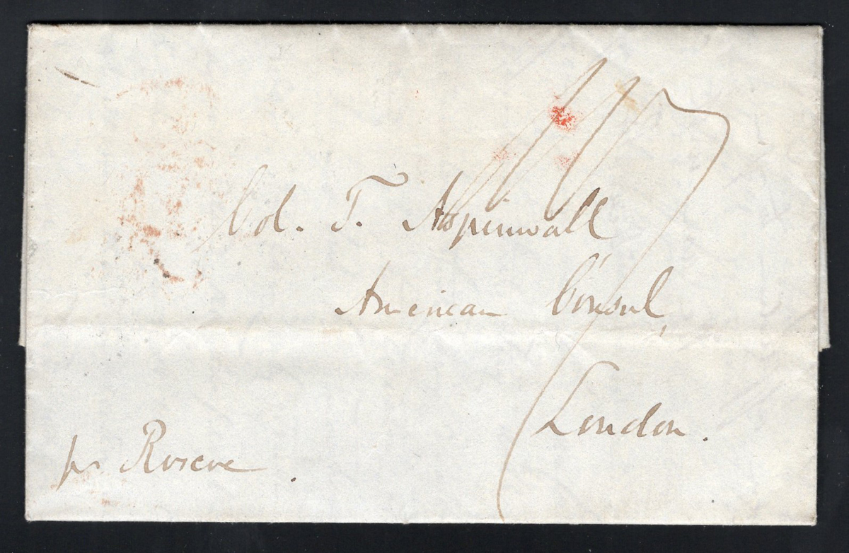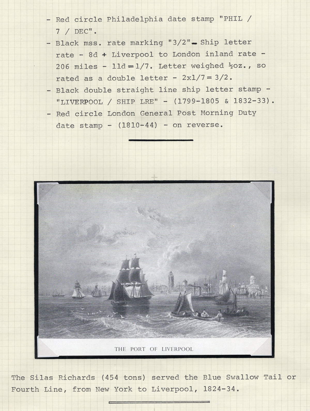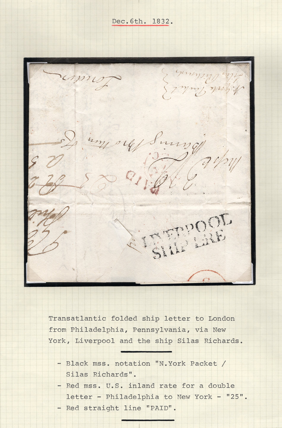723 CVR   image1832 Folded Letter from the United States to England, mailed from Philadelphia on DEC.6.1832 (datelined inside, plus small circle "PHIL / 7 / DEC") to London (JAN.2.1833 receiver in red), with large-lettered “LIVERPOOL / SHIP LRE” handstamp. Endorsed "N. York Packet / Silas Richards", with “PAID” handstamp and rated “25” and “3/2” manuscript, very fine. Written-up on two pages, one showing an early picture of the Port of Liverpool. (Scan 1) (Scan 2) (All Scans) (All Images)