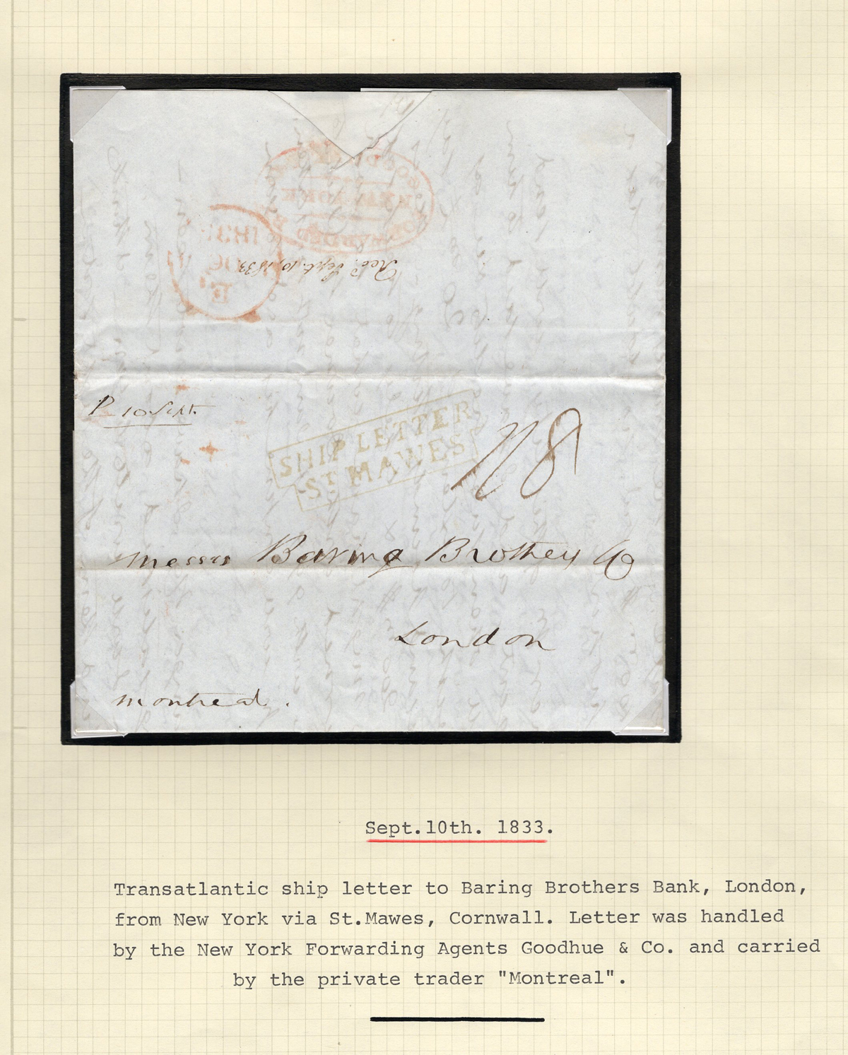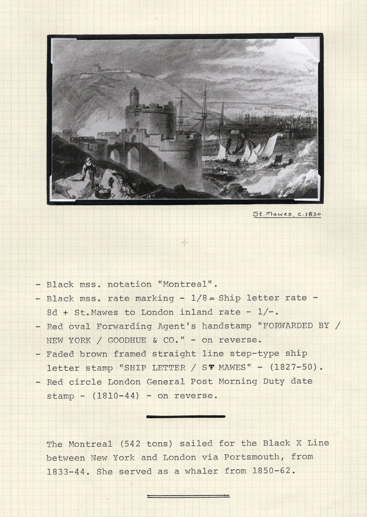 724 CVR   image1833 Folded Letter from the United States to England, mailed from New York on SEP.10.1833 (datelined inside and notation on front “P. 10 Sept") to London (OCT.4 receiver in red) with scarce boxed “SHIP LETTER / St. Makes” in green and oval forwarding agent’s “Forwarded By / New York / Goodhue & Co.” handstamp in red. Endorsed “Montreal” (ship) and rated "1/8" manuscript, very fine. Written-up on two pages, one showing a circa 1830 picture of St Mawes. (Scan 1) (Scan 2) (All Scans) (All Images)