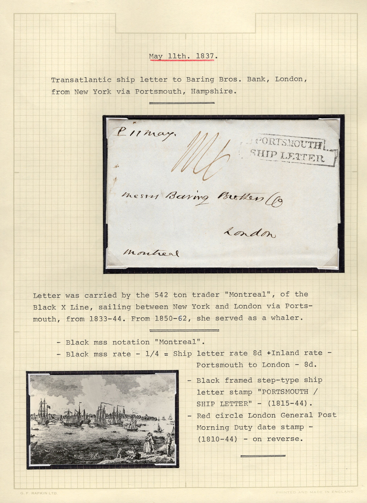 725 CVR   image1837 Folded Letter from United States to England, the letter inside is datelined “New York 11 May 1837 / 9 am” with a note on front “P. 11 May” to London (faint receiver on back) and endorsed ship “Montreal”, with boxed “PORTSMOUTH / SHIP LETTER”, very fine.
