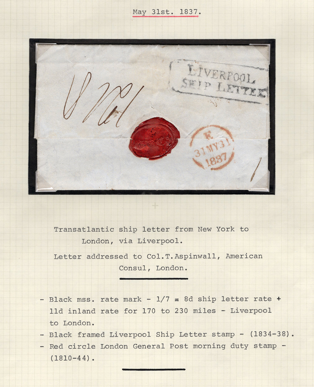 726 CVR   image1837 Folded Letter from United States to England, the letter inside is datelined “New York May 8, 1837” to London (MAY.31.1837 receiver on back), with boxed “LIVERPOOL / SHIP LETTER”, very fine. (Scan 1) (Scan 2) (All Scans) (All Images)