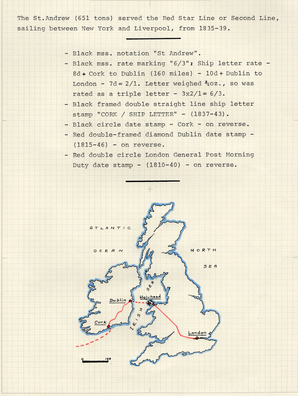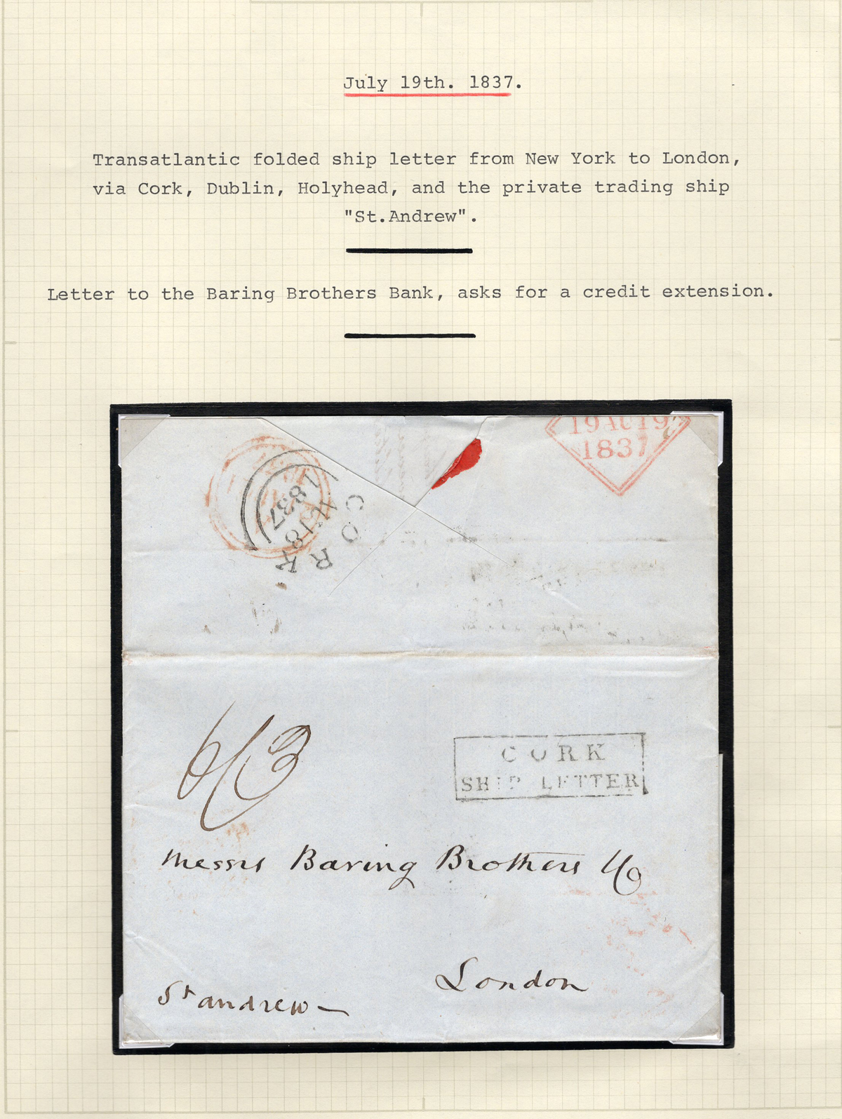 727 CVR   image1837 Folded Letter from the United States to England, mailed from New York on JUL.19.1837 (dateline inside) to London (AUG.21 1837 receiver in red) via Cork (AUG.18.1837 “CORK” double broken circle plus boxed “CORK / SHIP LETTER” on front), Dublin (AUG.19 diamond transit in red), endorsed "St Andrew”, very fine. (Scan 1) (Scan 2) (All Scans) (All Images)