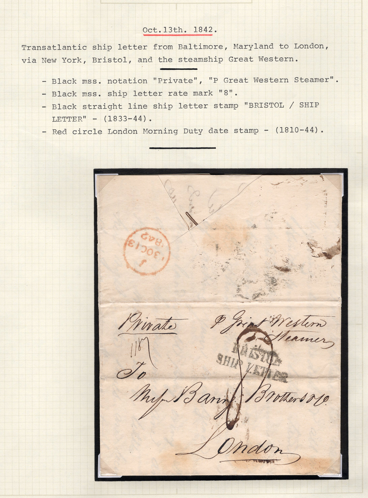 728 CVR   image1842 Folded Letter from the United States to England, mailed from Baltimore on SEP.27.1842 (dateline and docketing inside) to London (OCT.13.1842 receiver in red) with “BRISTOL / SHIP LETTER" handstamp, endorsed “P. Great Western Steamer”, very fine. Written-up on two pages, one of which discusses the life of the steamer’s builder Isambard Kingdom Brunel. (Scan 1) (Scan 2) (All Scans) (All Images)