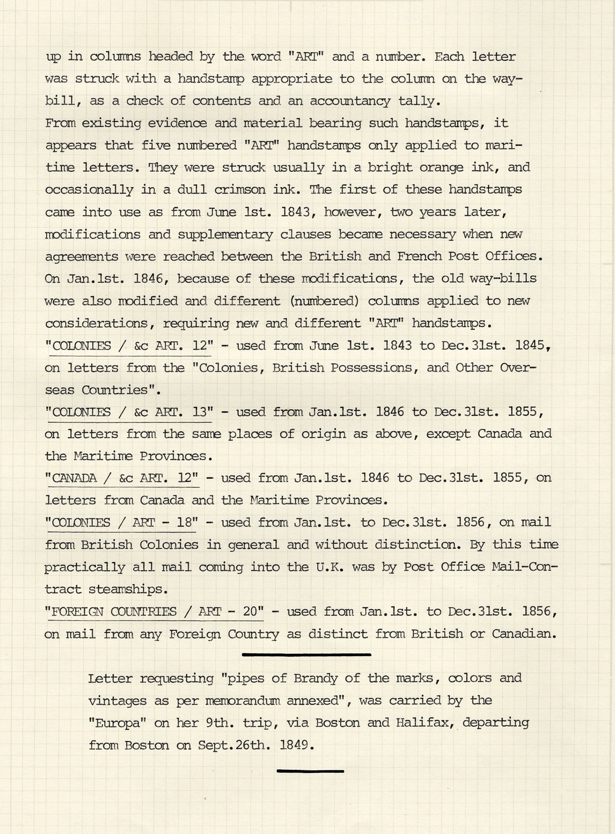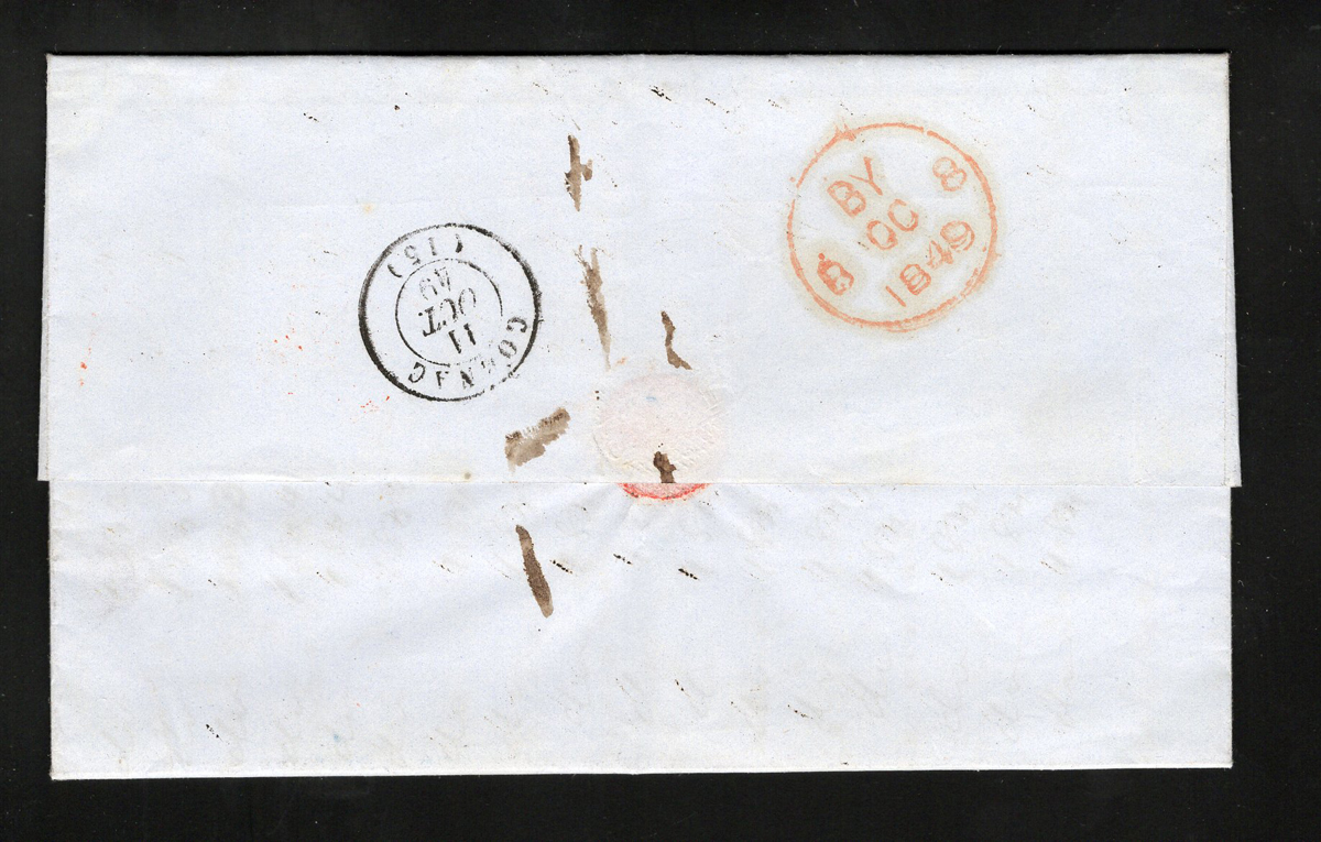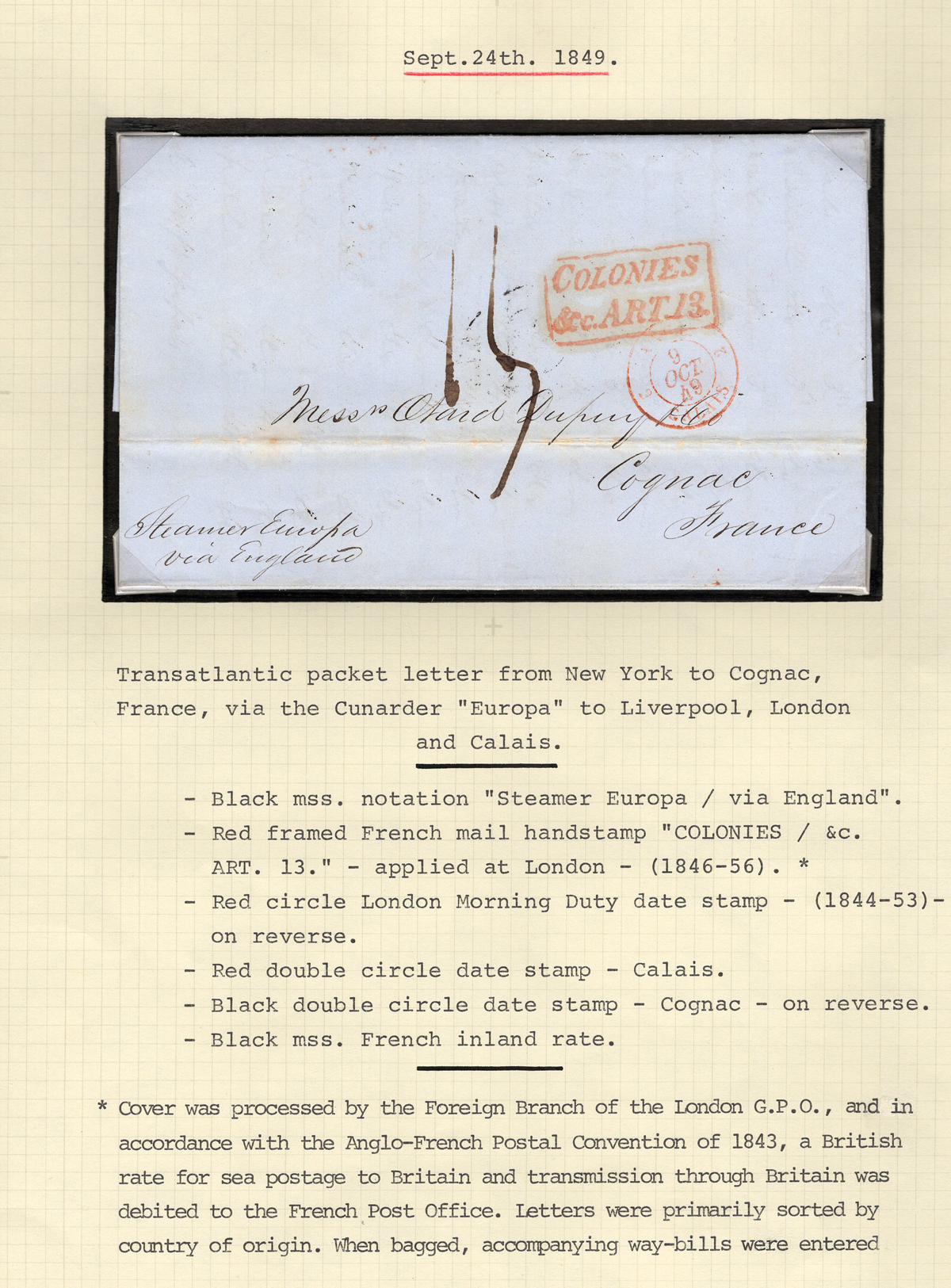 729 CVR   image1849 Folded Letter from the United States to France, mailed from New York on SEP.24.1849 (dateline and docketing inside) to Cognac, France (OCT.11.1849 receiver on back) through London (OCT.8.1849 transit in red) and Calais (OCT.9.1849 transit in red). The letter is endorsed “Steamer Europa via England” and has a very fine boxed “COLONIES / &c. ART.13.” handstamp in red. The letter inside pertains to a large shipment of 1849 vintage Brandy, very fine. Written-up on two pages, one of them explaining in detail the “Colonies” rates and arrangements. (Scan 1) (Scan 2) (Scan 3) (All Scans) (All Images)