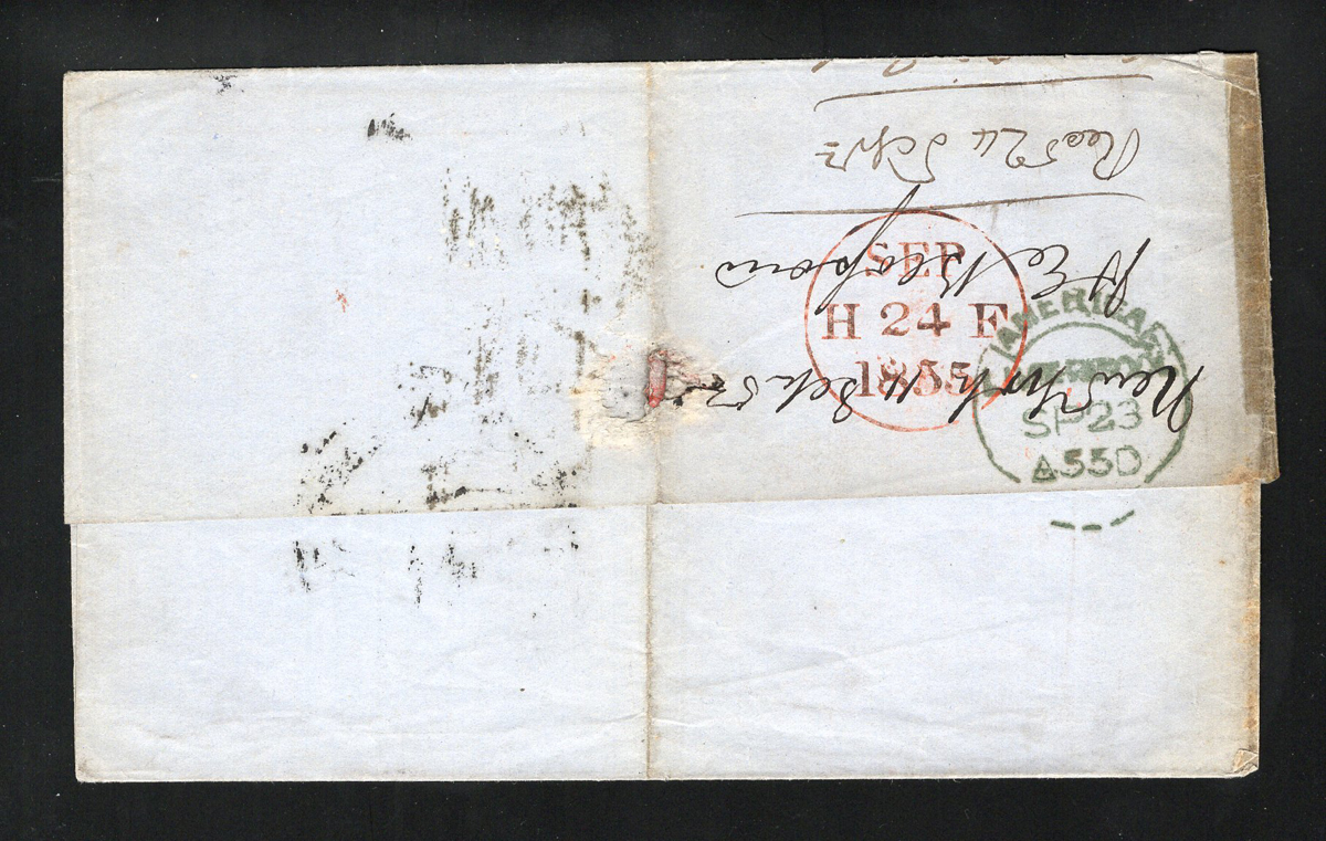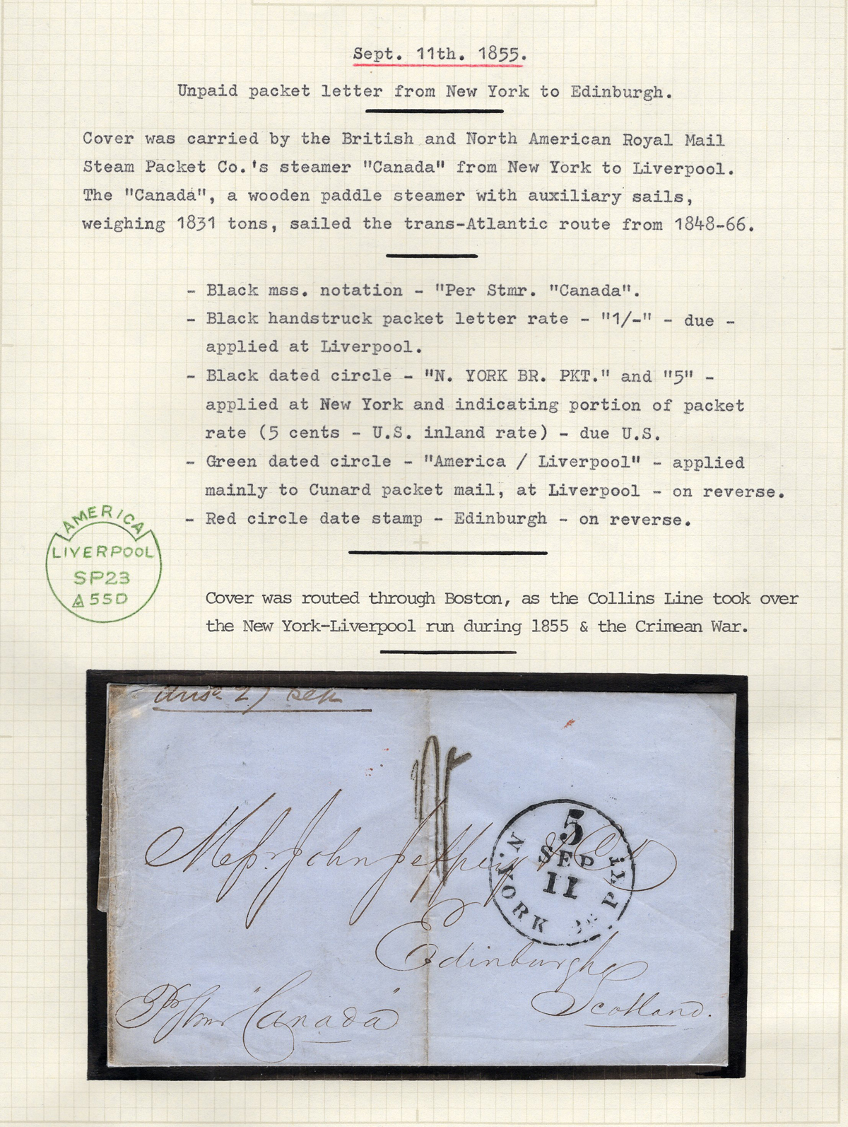 730 CVR   image1855 Folded Cover from the United States to England, mailed from New York on SEP.11 (large circle "N. YORK BR. PKT / 5” postmark) to Edinburgh (SEP.24.1855 receiver in red) through Liverpool (SEP.23.1855 “AMERICA” c.d.s. transit in green), rated "1/" handstamp and endorsed “Per Star Canada”, fine. (Scan 1) (Scan 2) (All Scans) (All Images)