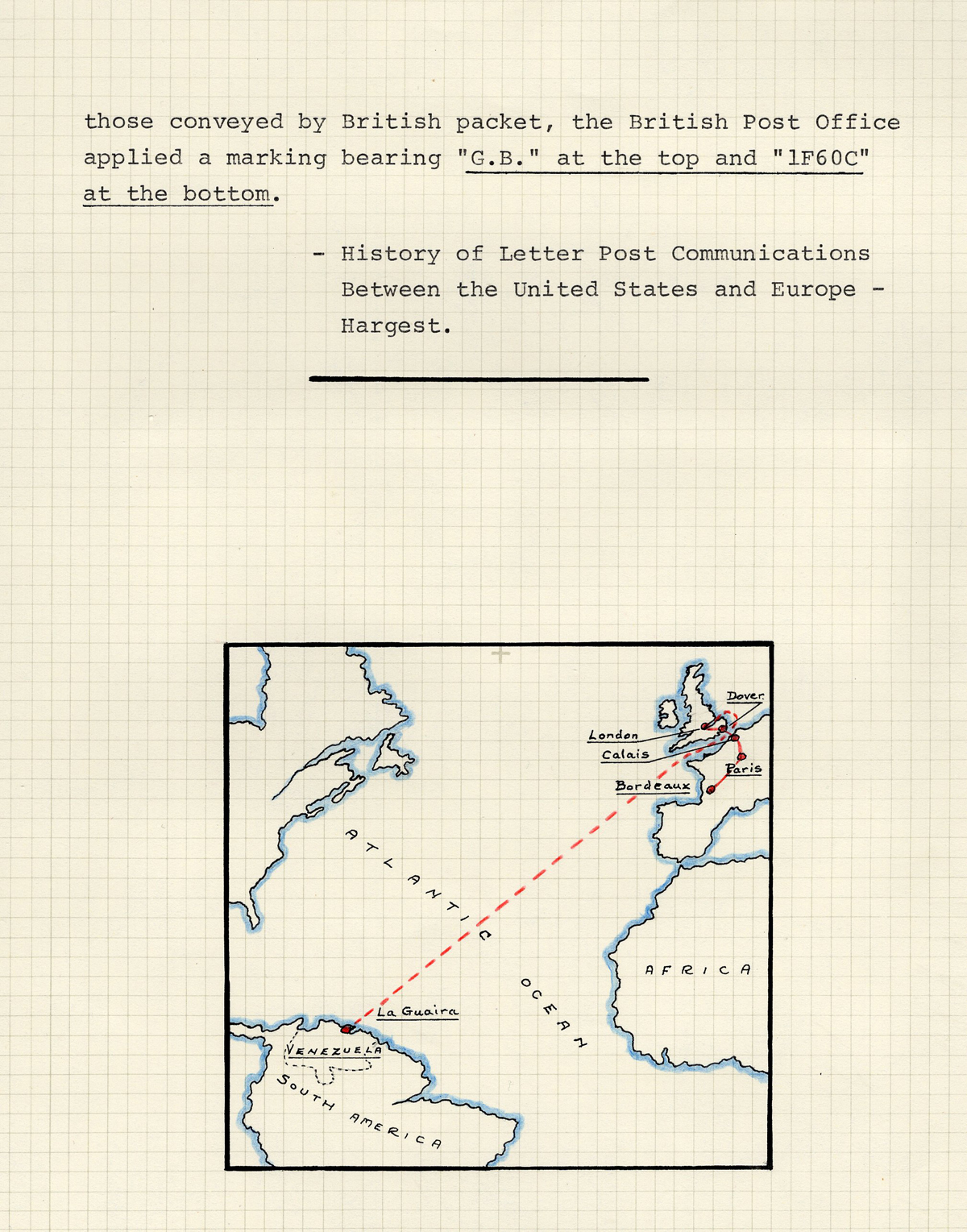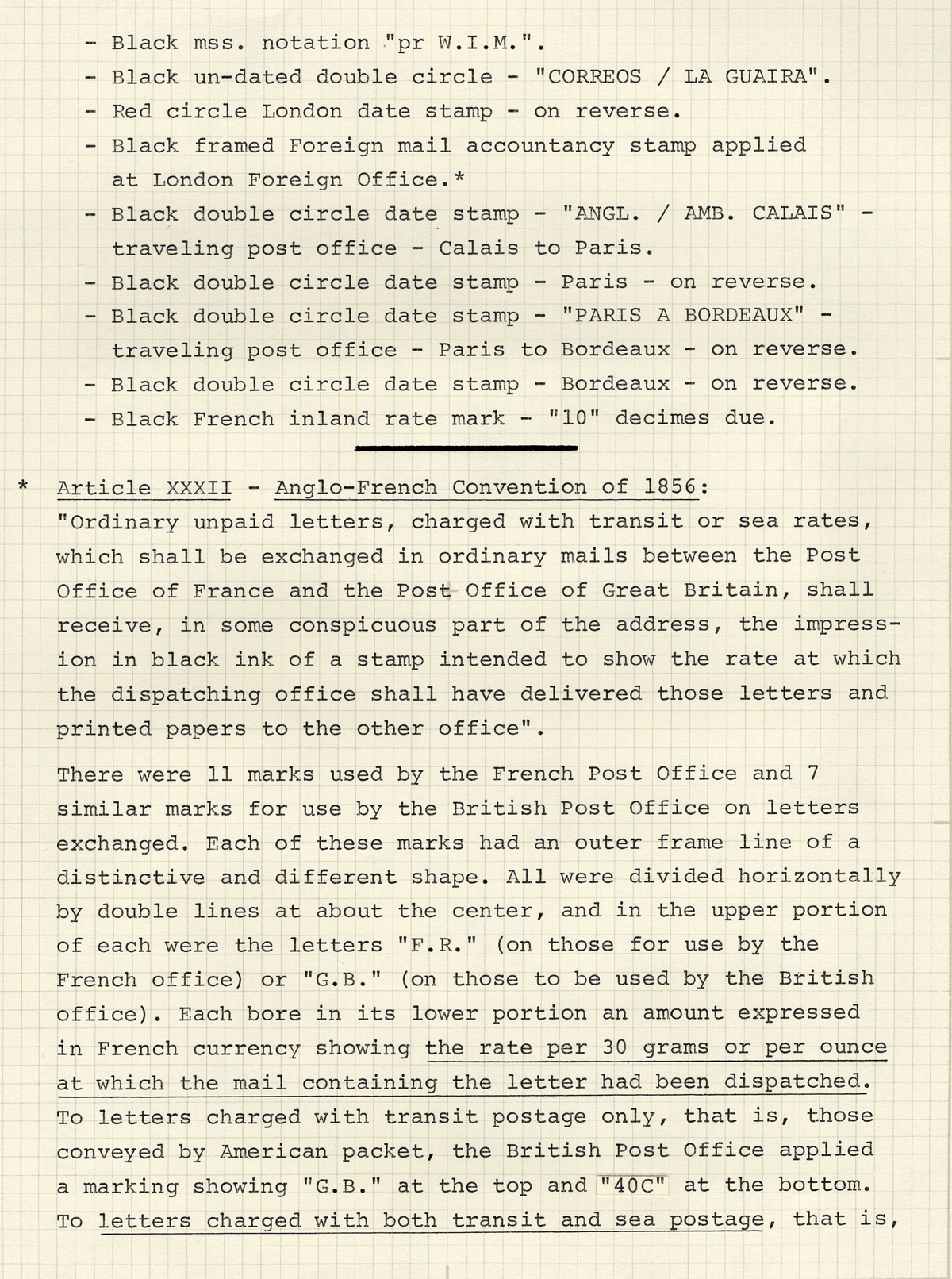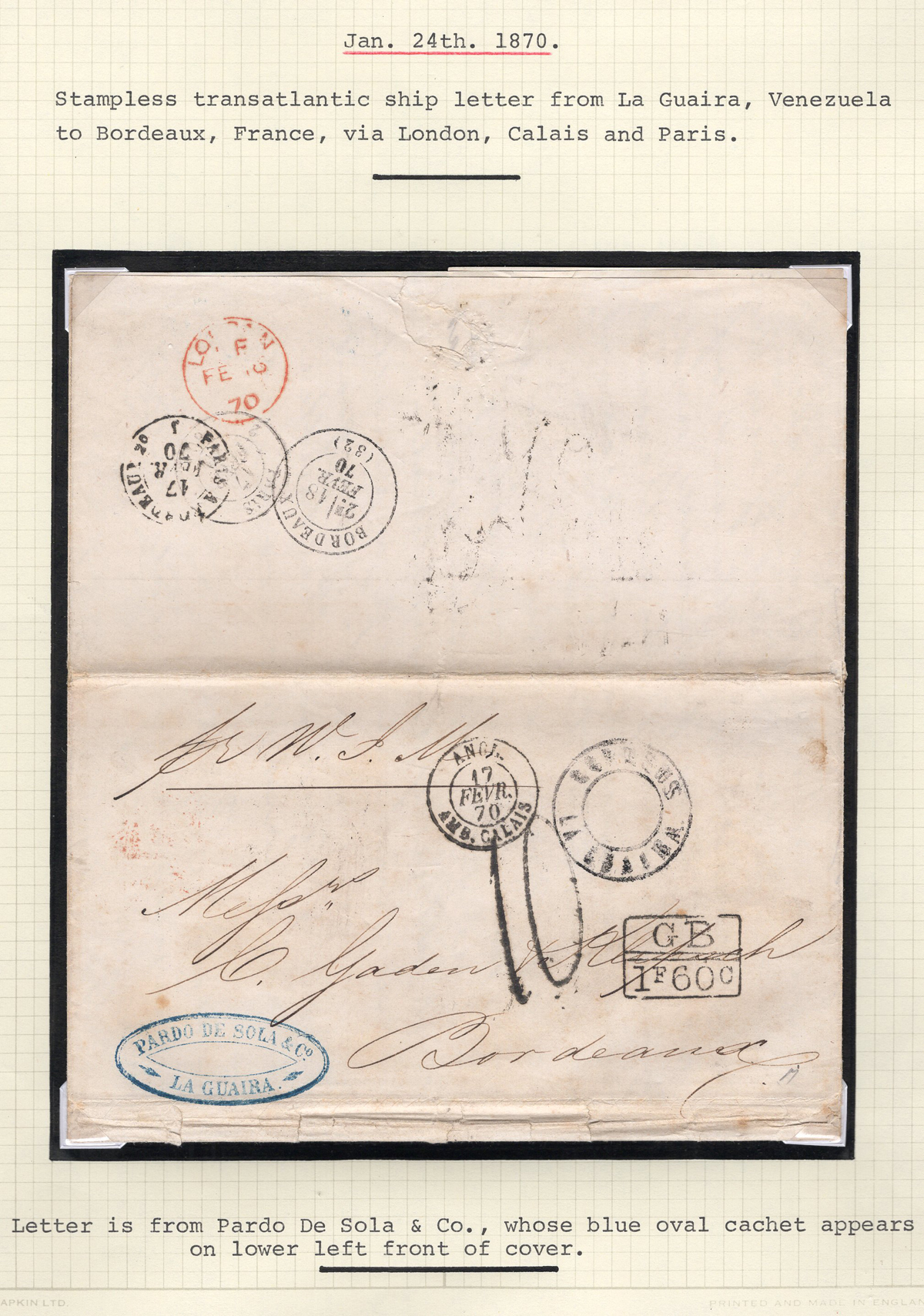 735 CVR   image1870 Folded Letter from Venezuela to France, via England, mailed from La Guaira, Venezuela on JAN.24.1870 (dateline inside) to Bordeaux, France (FEB.18.1870 receiver) via London (FEB.10 transit), Paris (FEB.17), Paris to Bordeaux train (FEB 17) and Calais (FEB.17), with boxed “GB / 1F60c” handstamp and “10” rate handstamp. Edge wrinkles do not detract, overall fine and written-up in detail on three pages. (Scan 1) (Scan 2) (Scan 3) (All Scans) (All Images)