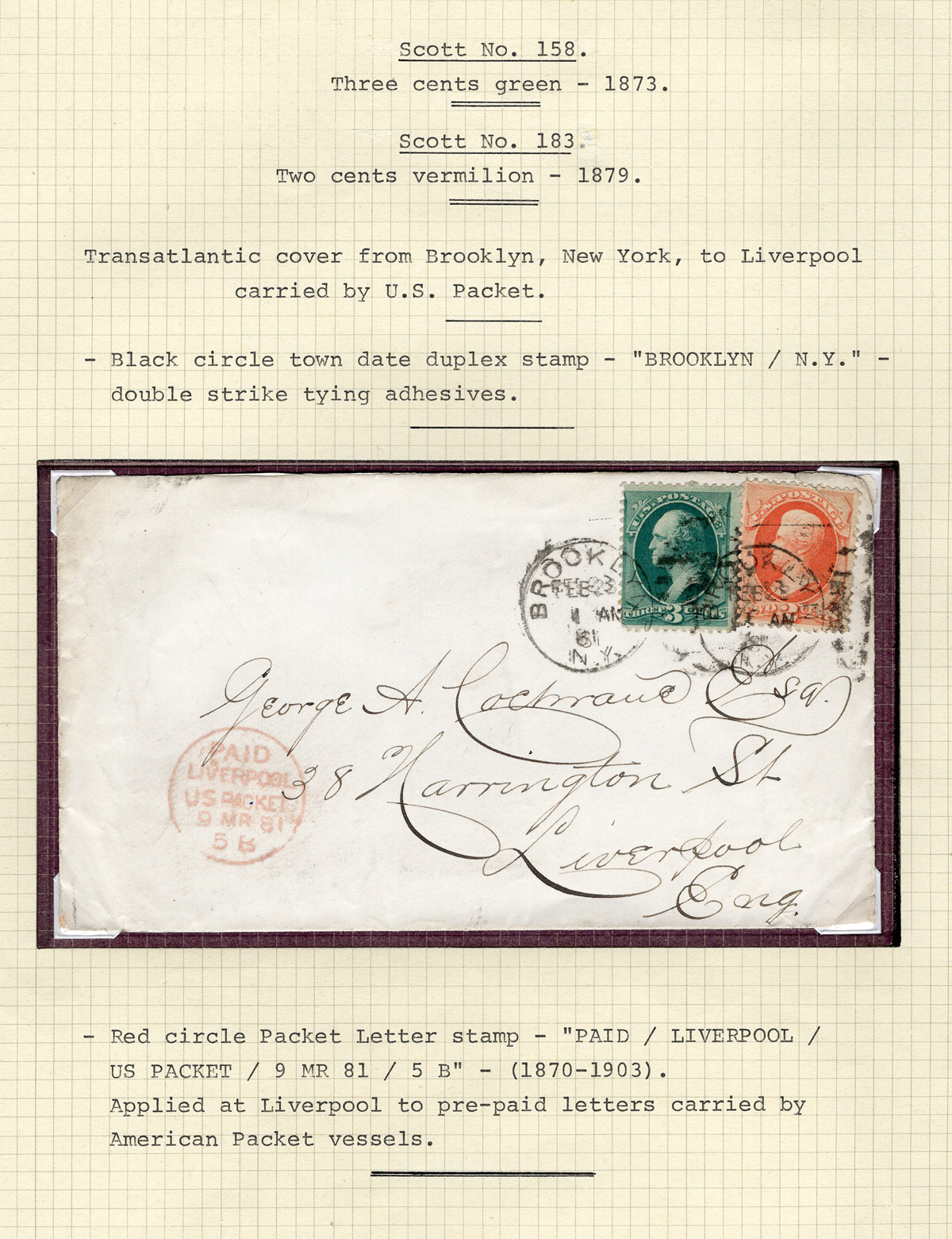 733 CVR 158, 183 image1881 Cover from the United States to England, mailed from Brooklyn, NY on FEB.23.1881 (two duplex strikes tie the stamps) to Liverpool with MAR.9.1881 "LIVERPOOL / PAID / US PACKET” c.d.s. receiver in red. Franked with a 3c (Scott #158) and 2c (Scott #183) paying the 5c rate, very fine.