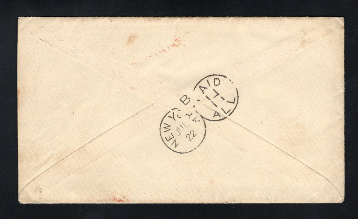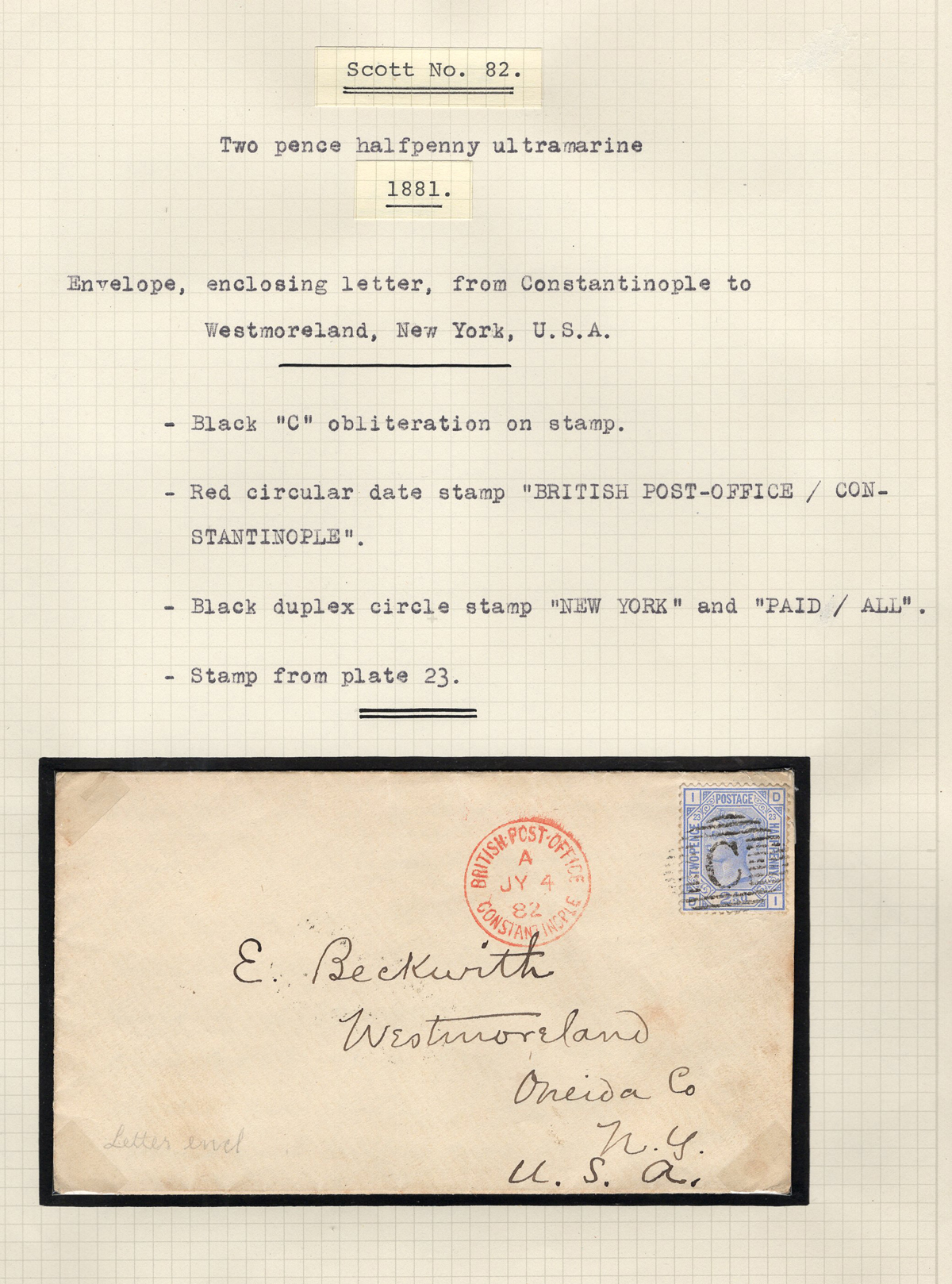 722 CVR   image1882 Cover from Constantinople to the United States, mailed from Constantinople on JUL.4.1882 (“BRITISH POST-OFFICE / CONSTANTINOPLE” c.d.s. in red) to Westmoreland, NY, via New York City (JUL.22 “PAID ALL” duplex transit on back). Franked with a 2½d ultramarine Queen Victoria (Plate 23, Scott #82) tied by the Constantinople “C” in grid cancel. The cover encloses its original letter from someone writing to his Mother, Father and Brother back home. Very fine and clean cover. (Scan 1) (Scan 2) (All Scans) (All Images)