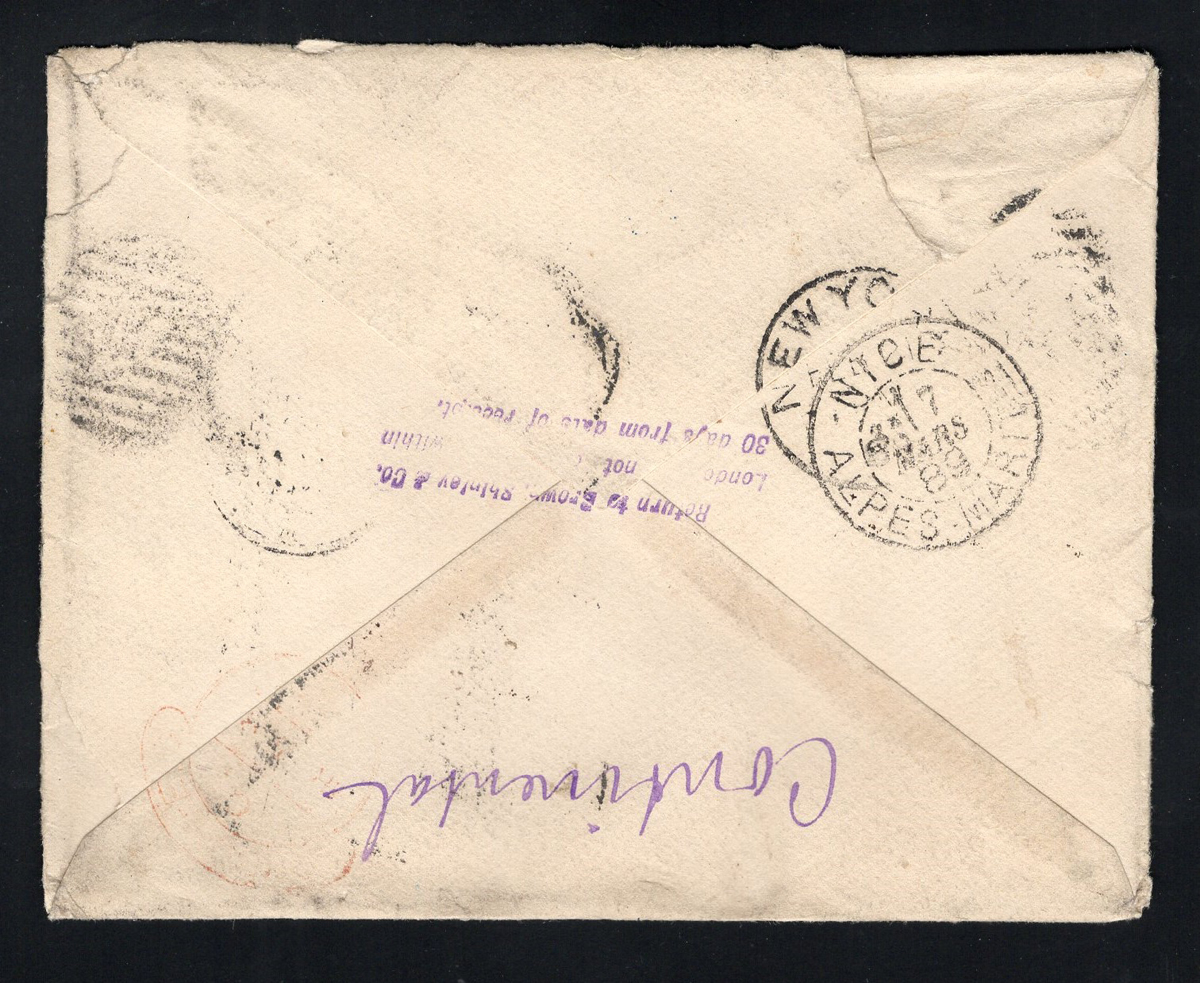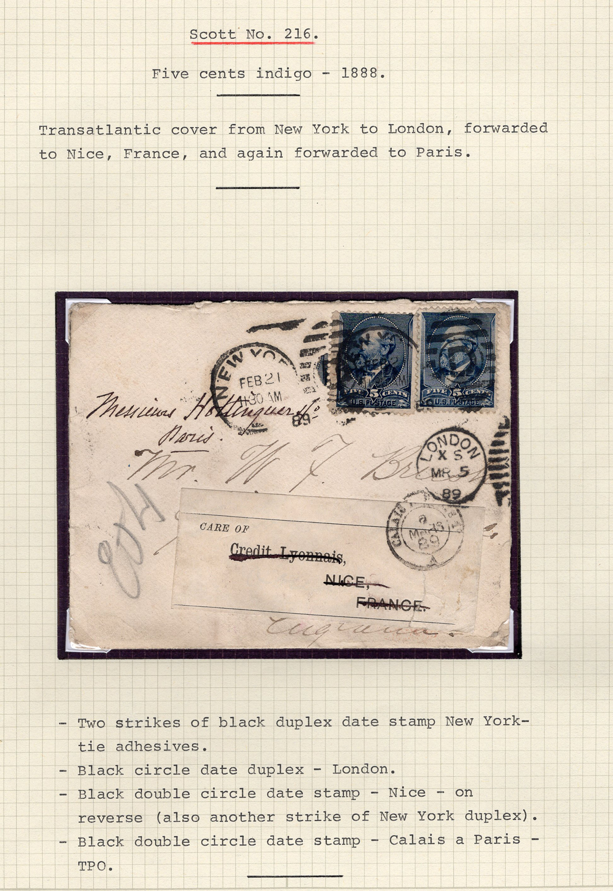 734 CVR 216 image1889 Cover from the United States to England, Forwarded Twice, mailed from New York City on FEB.21.1889 (two “D” duplex strikes tie both 5c blue stamps) to London (MAR.5.1889 duplex receiver on front), forwarded to Nice, France (MAR.7.1889 receiver on back) then forward to Paris. There is also a Calais to Paris train marking dated MAR.6 (?). Opening tears at top, else fine. (Scan 1) (Scan 2) (All Scans) (All Images)