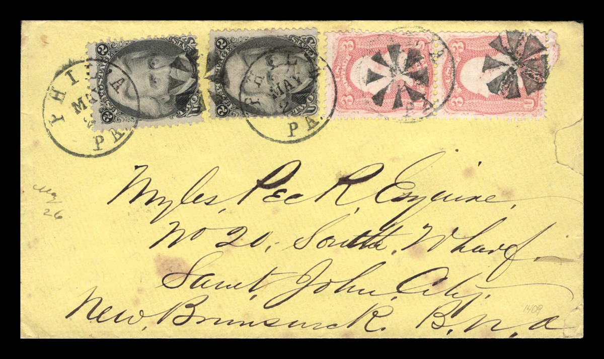 732 CVR 65, 73 image1867 Cover from Philadelphia to New Brunswick, mailed on MAY.26 (“PHILA / PA” duplex with cork cancels) to Saint John, New Brunswick (MAY.31 receiver on back). The cover is franked with a pair of 3c rose Washingtons and two 10c black Jacksons, all tied to each other and to the cover with the three duplex cancels. Small opening tears at right, else very fine.