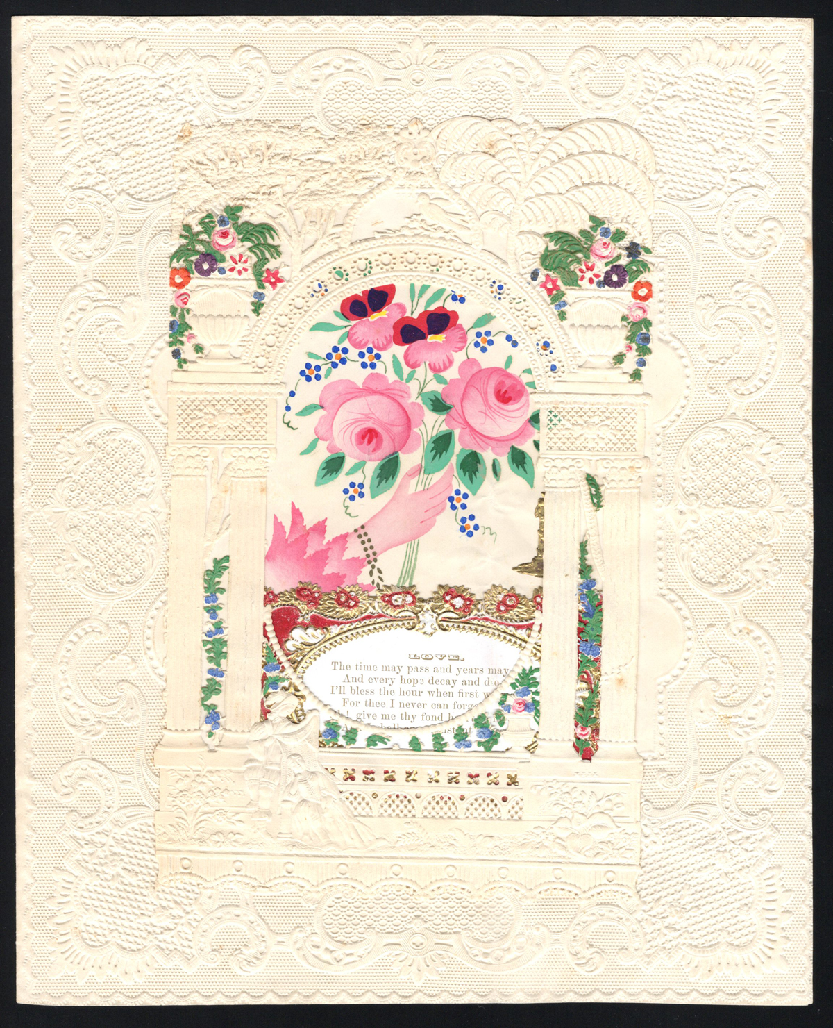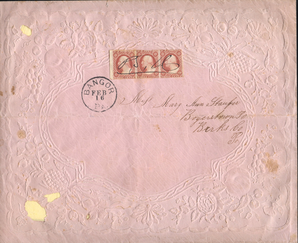 731 CVR 11 image1856 Triple Rate Large Embossed Valentine Cover and Card, mailed from Bangor PA on FEB.16 (very fine c.d.s. free strike) to Boyerstown PA, franked with a strip of three 3c dull red Washington imperforate (sheet margin at left) canceled with a manuscript date (according to owner) of Feb. 16. 1856. A very ornate embossed cover (10 x 9 inches) which still contains its original Valentine’s card made of intricate lace, glued-on flowers, etc. Creases, wrinkles and paper breaks, else a scarce item. (Scan 1) (Scan 2) (All Scans) (All Images)