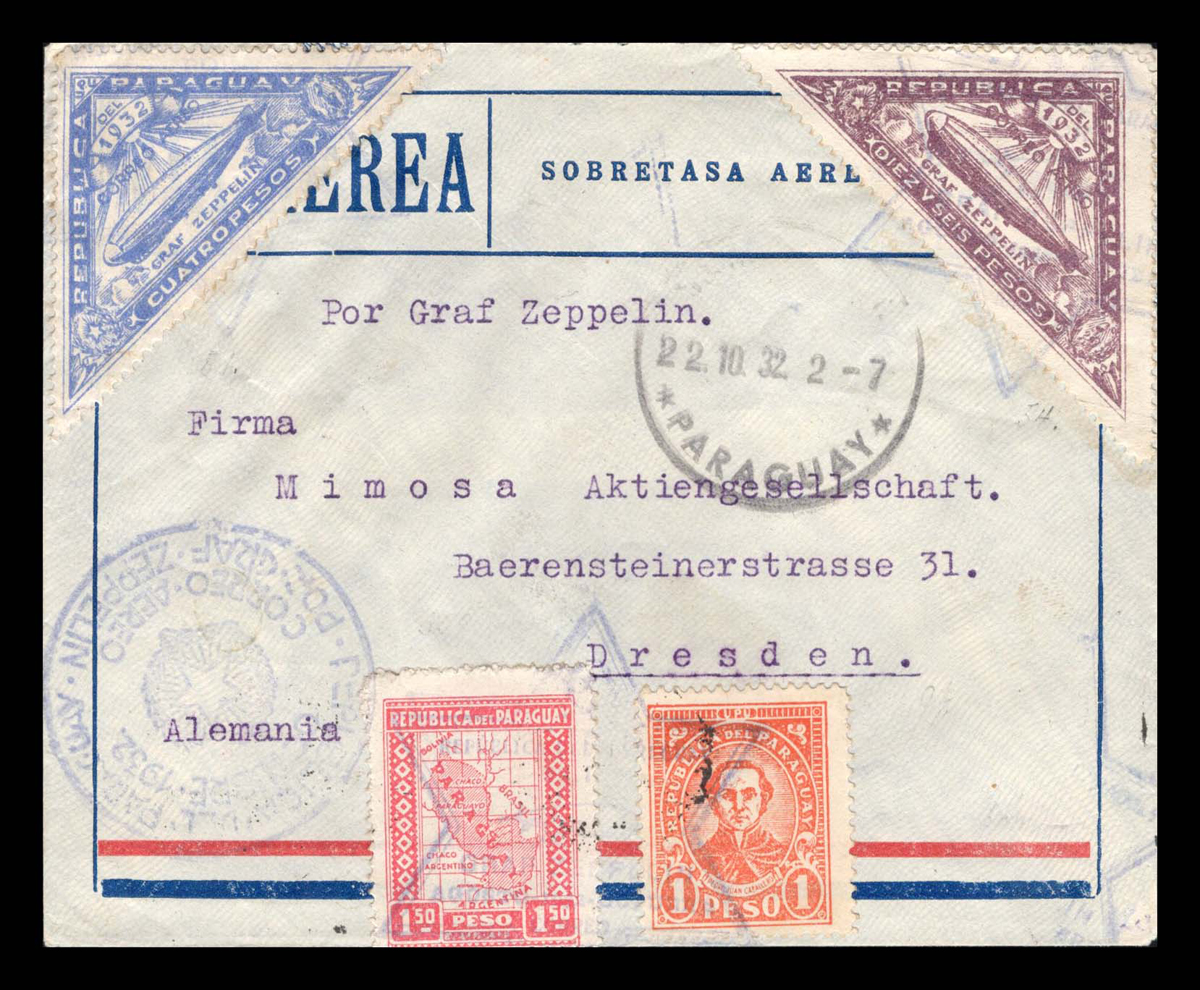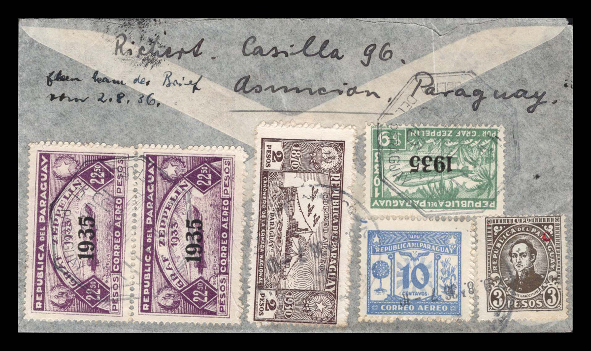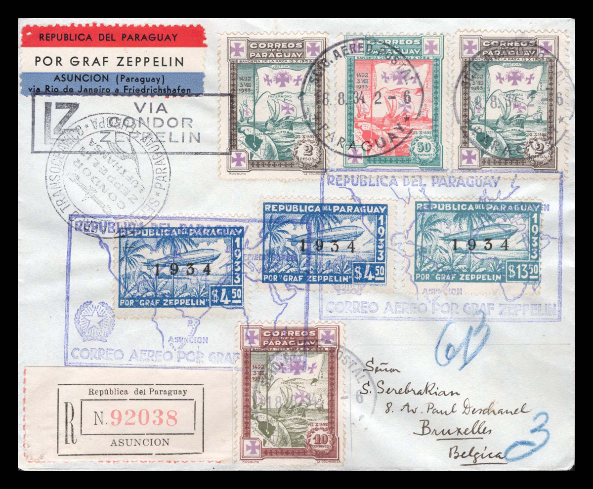 Zeppelin Covers from Paraguay, mailed on OCT.22.1932 to Germany (NOV.3 Friedrichshafen receiver), MAY.23.1933 registered card to Germany (MAY.25 receiver) and AUG.18.1934 to Belgium (AUG.28 Friedrichshafen receiver) and AUG.29.1936 to Germany