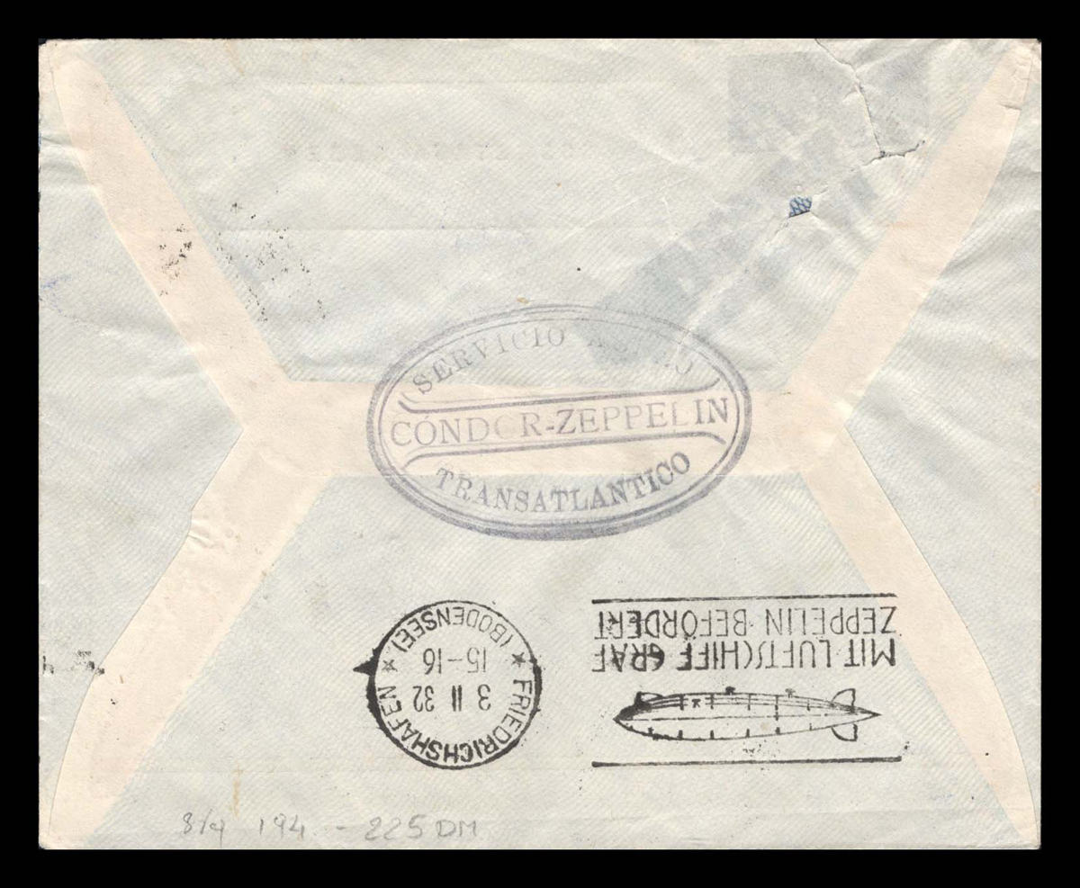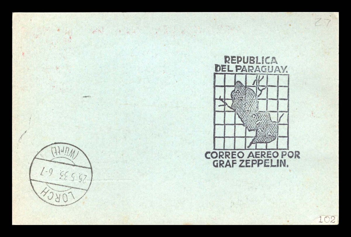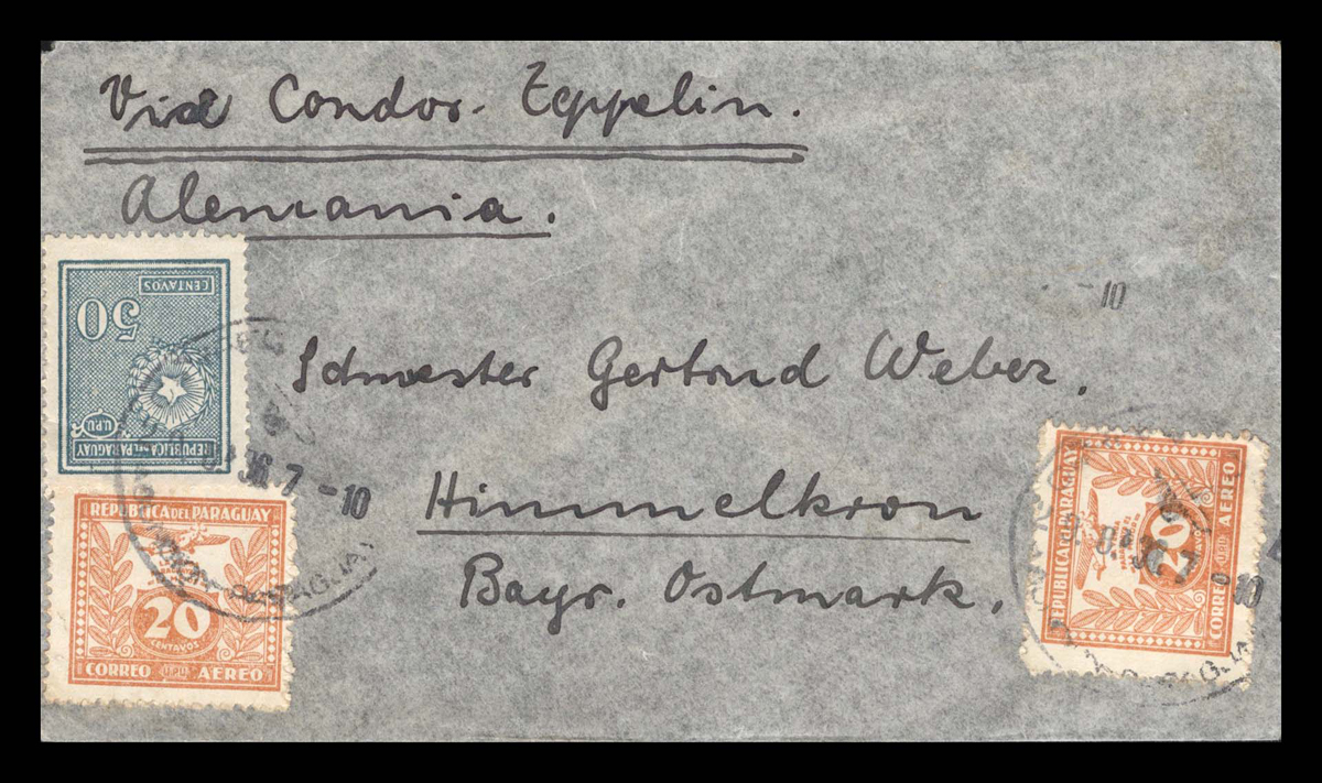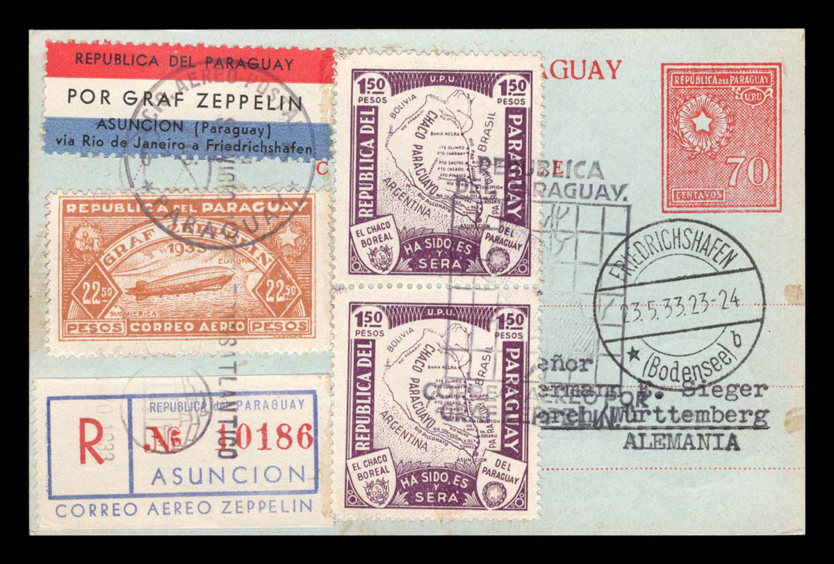 Zeppelin Covers from Paraguay, mailed on OCT.22.1932 to Germany (NOV.3 Friedrichshafen receiver), MAY.23.1933 registered card to Germany (MAY.25 receiver) and AUG.18.1934 to Belgium (AUG.28 Friedrichshafen receiver) and AUG.29.1936 to Germany