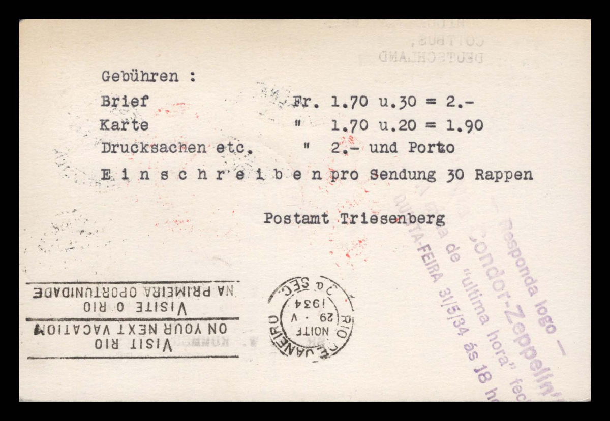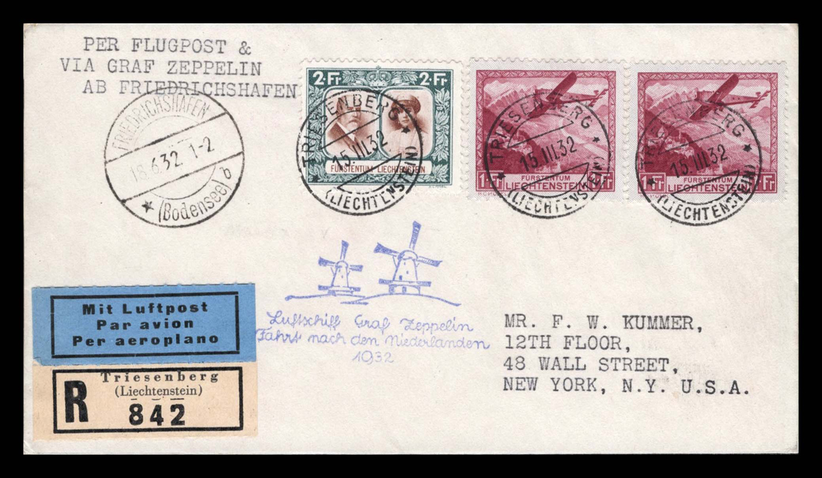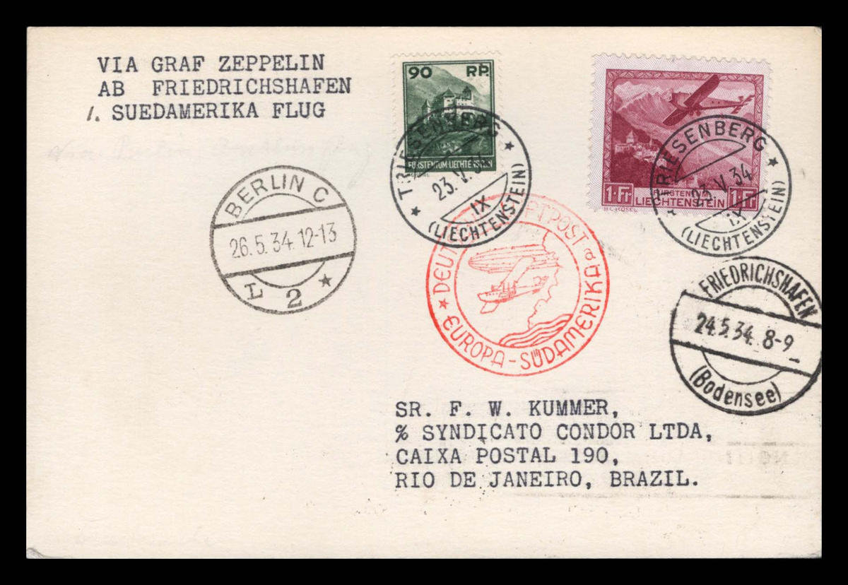 Zeppelin Covers from Liechtenstein, first is a cover mailed registered on JUN.18.1932 to New York City (JUN.28 receiver), second is a card mailed on MAY.26.1934 to Brazil (MAY.24 Friedrichshafen transit and MAY.29 Rio de Janeiro receiver) each