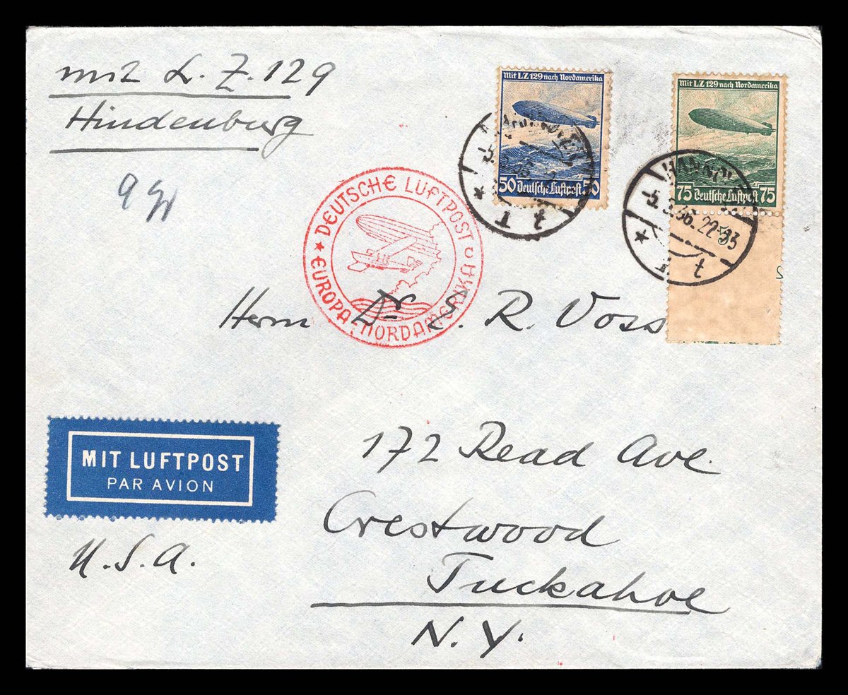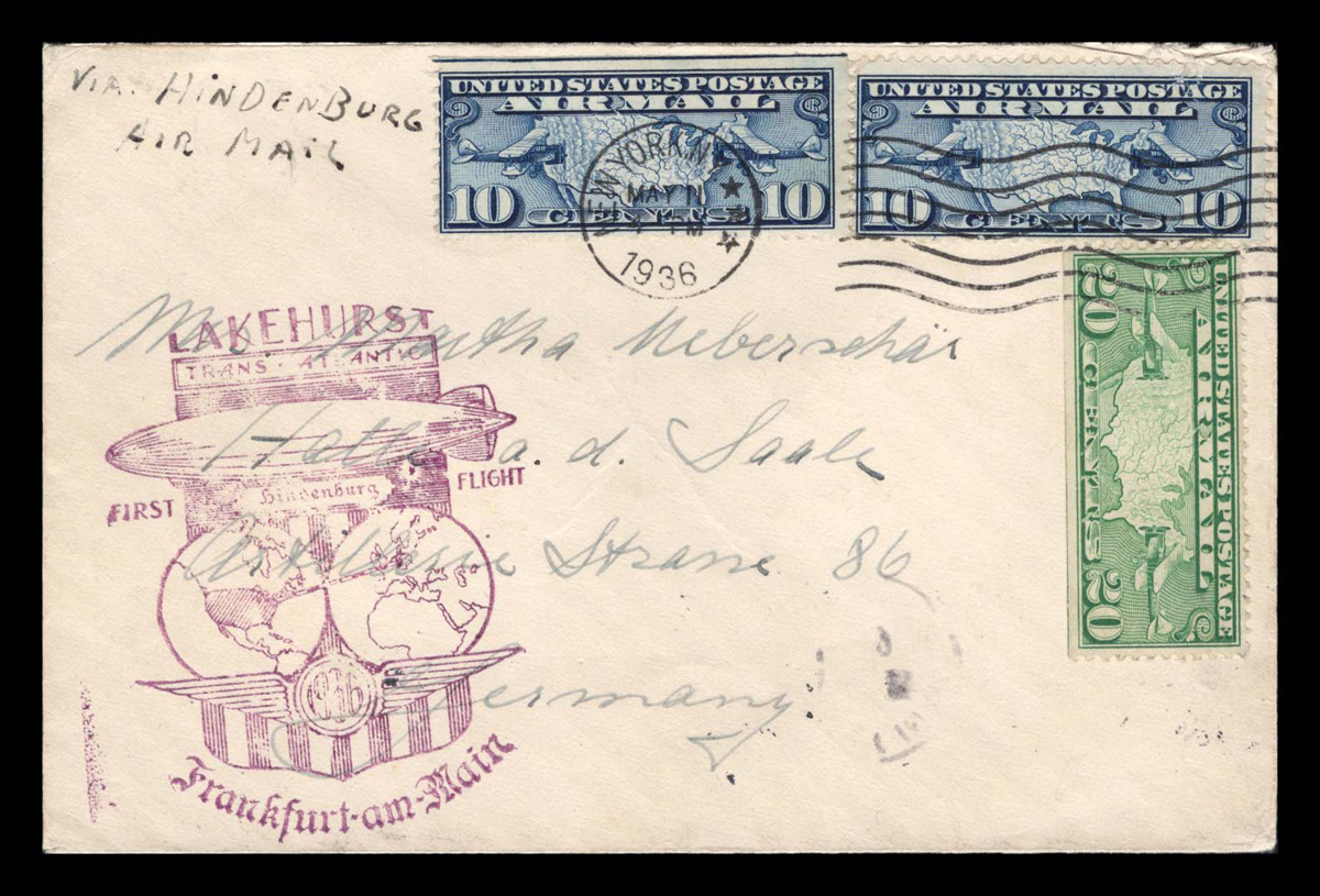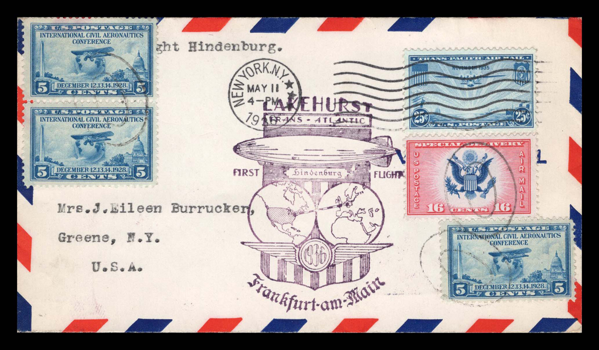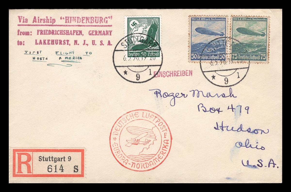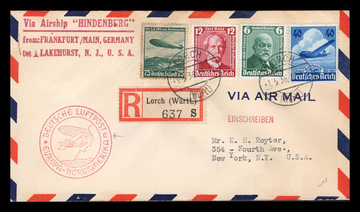 Friedrichshafen-Lakehurst Hindenburg First Flight Covers, all mailed between MAY.1 and MAY.6 to either Germany or the United States, all have the red Europe to North America flight cachet and New York receivers. Three are registered, and we note