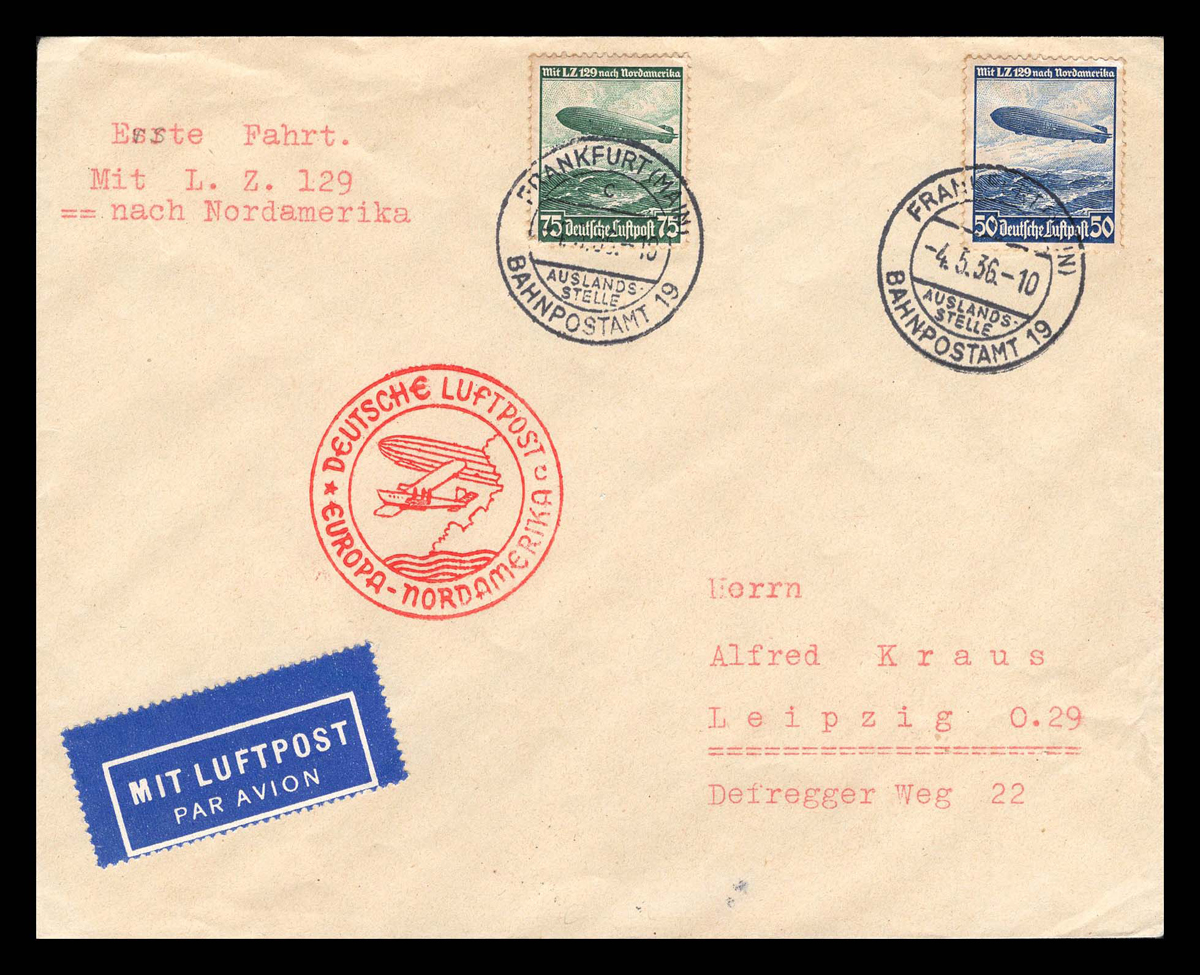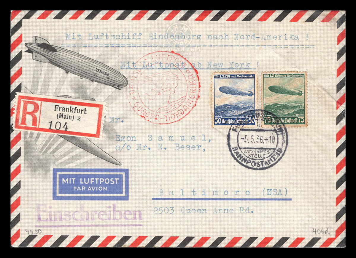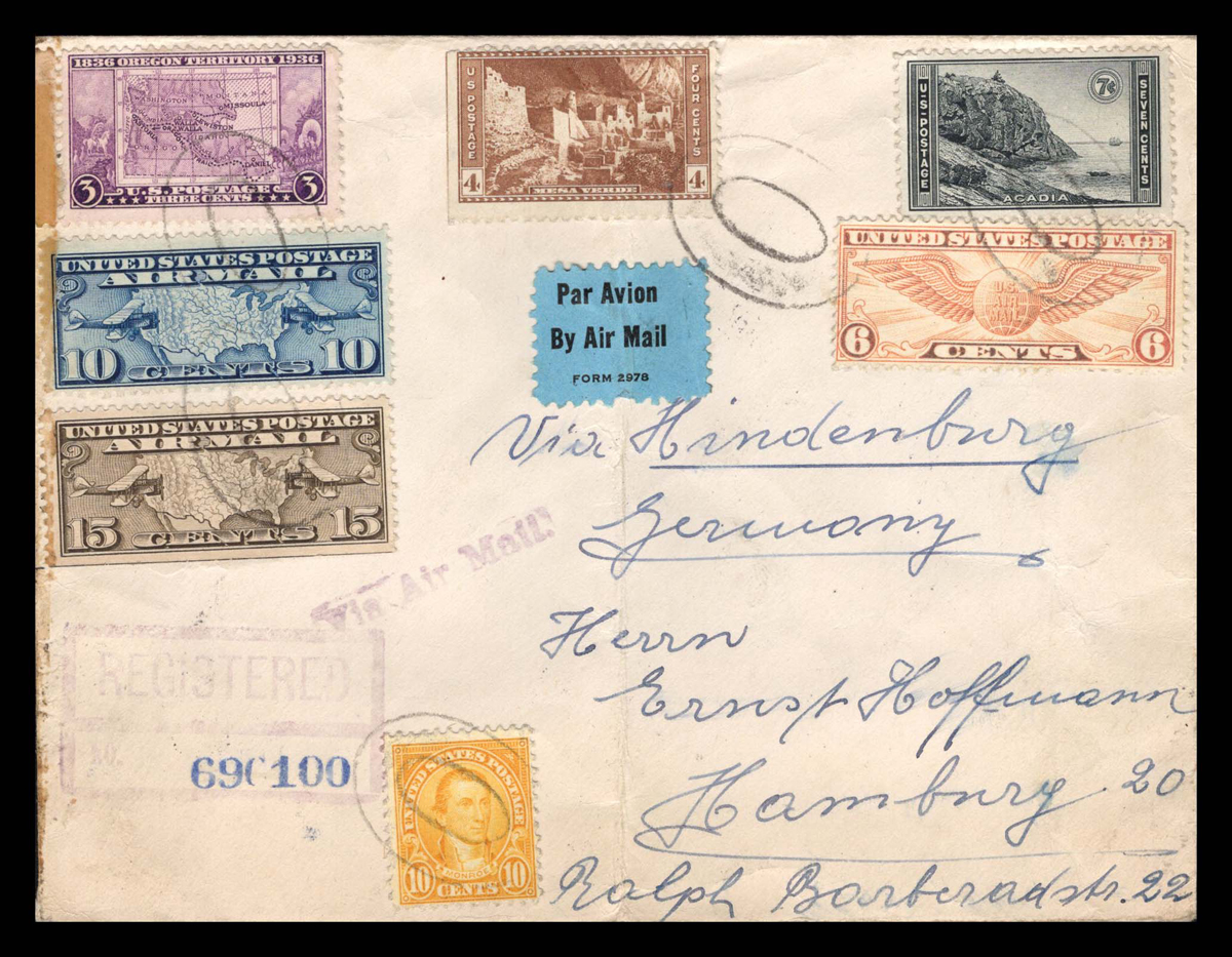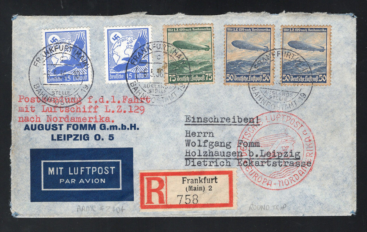 Friedrichshafen-Lakehurst Hindenburg First Flight Covers, all mailed between MAY.1 and MAY.6 to either Germany or the United States, all have the red Europe to North America flight cachet and New York receivers. Three are registered, and we note