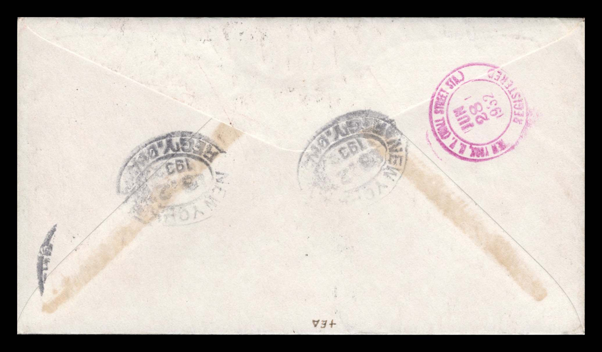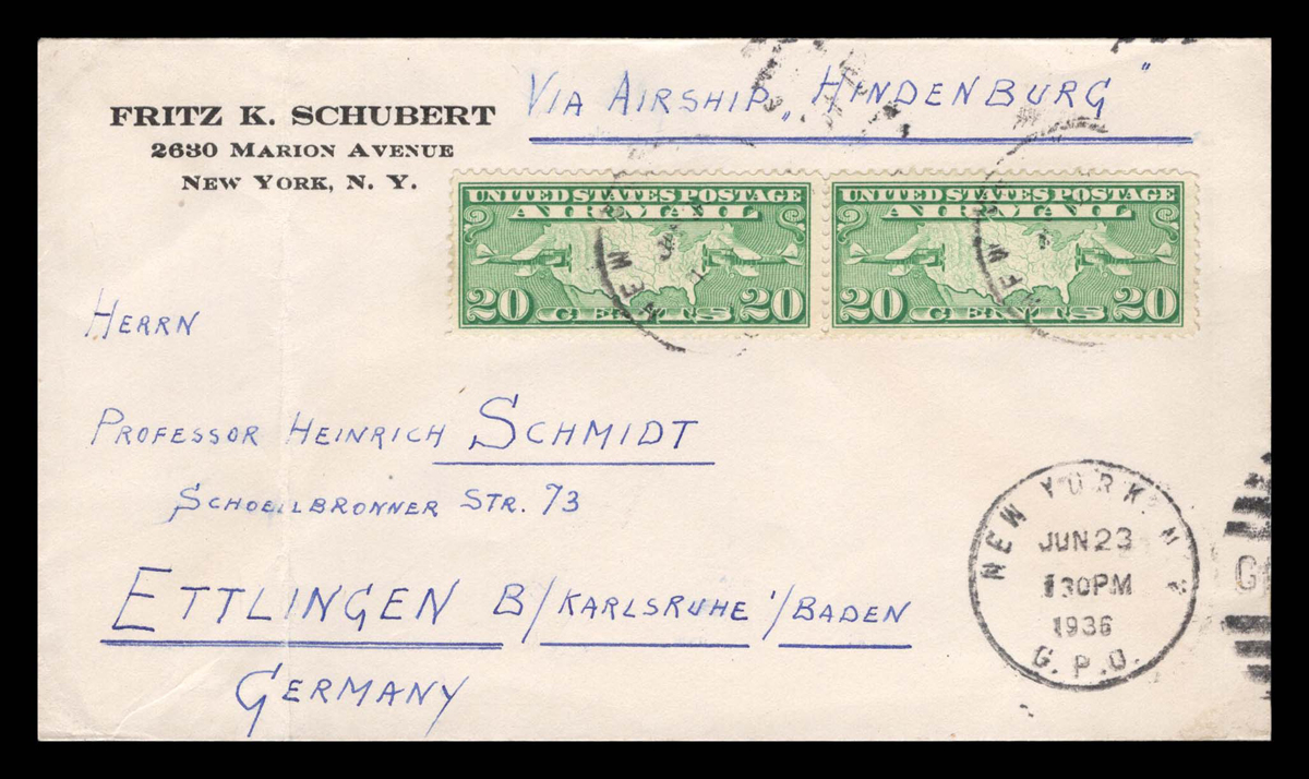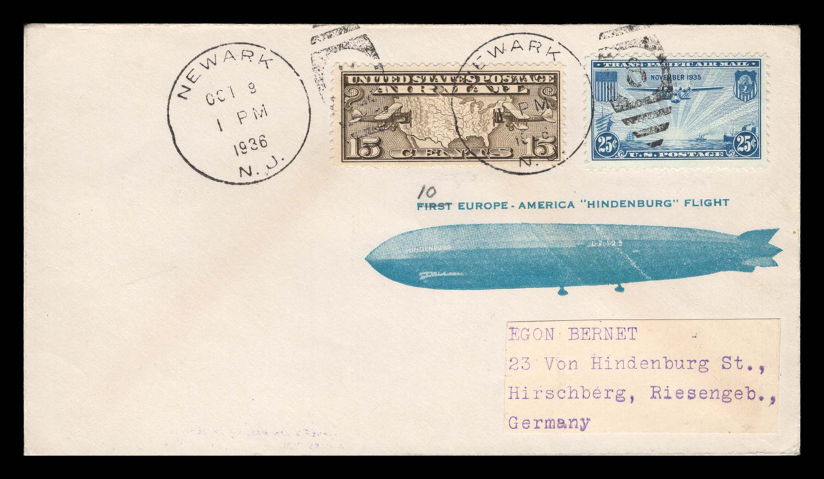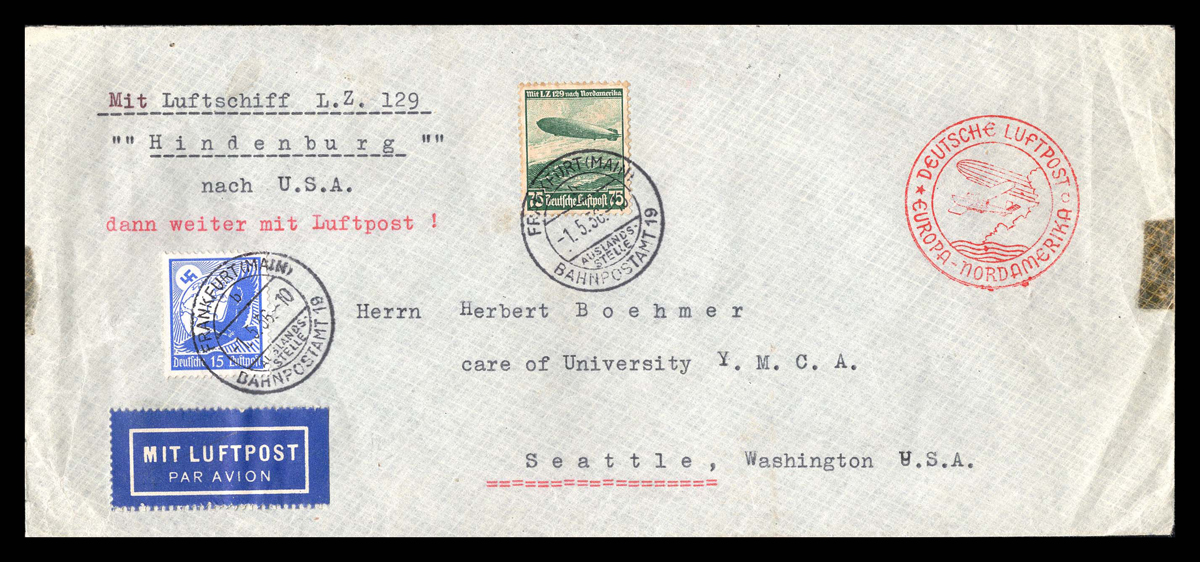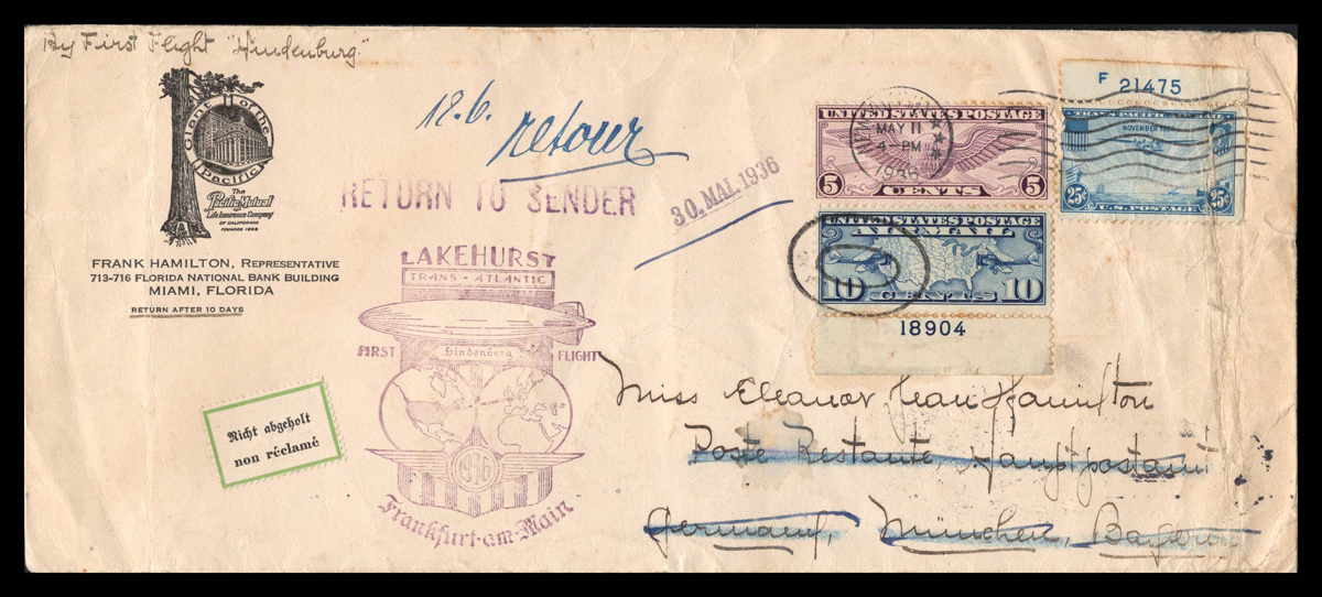 Friedrichshafen-Lakehurst Hindenburg First Flight Covers, all mailed between MAY.1 and MAY.6 to either Germany or the United States, all have the red Europe to North America flight cachet and New York receivers. Three are registered, and we note