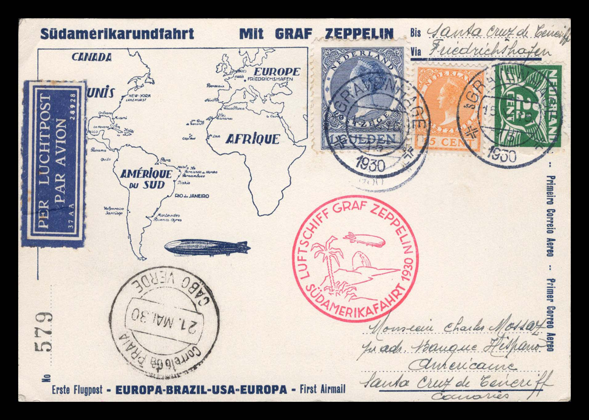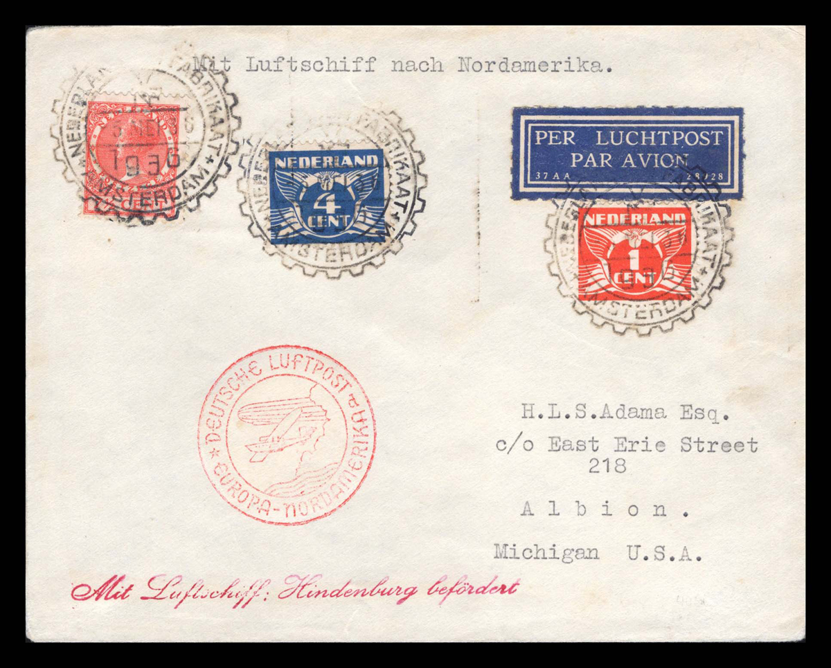 1936 Hindenburg Covers from the Netherlands, first is a card mailed on MAY.15.1930 to the Canary Islands (MAY.21 Cape Verde receiver) and the second is a cover mailed on MAR.5.1936 to the United States, via New York (MAY.9 transit on back). Each