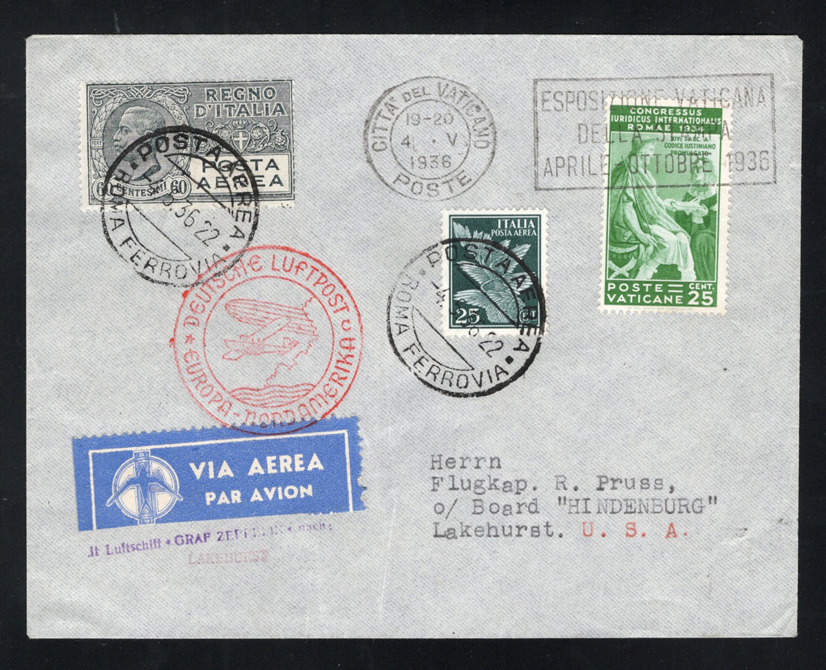 Cover Italy to the United States, mailed on MAY.4.1936 (Rome and Vatican City despatches) to Lakehurst, with MAY.5 Frankfurt transit and New York City MAY.9 receiver. The cover has a red circular cachet, as well as a tiny Graf Zeppelin /