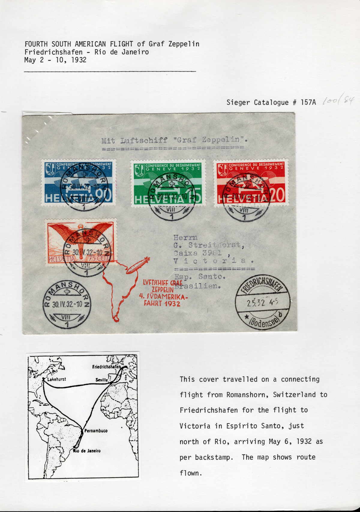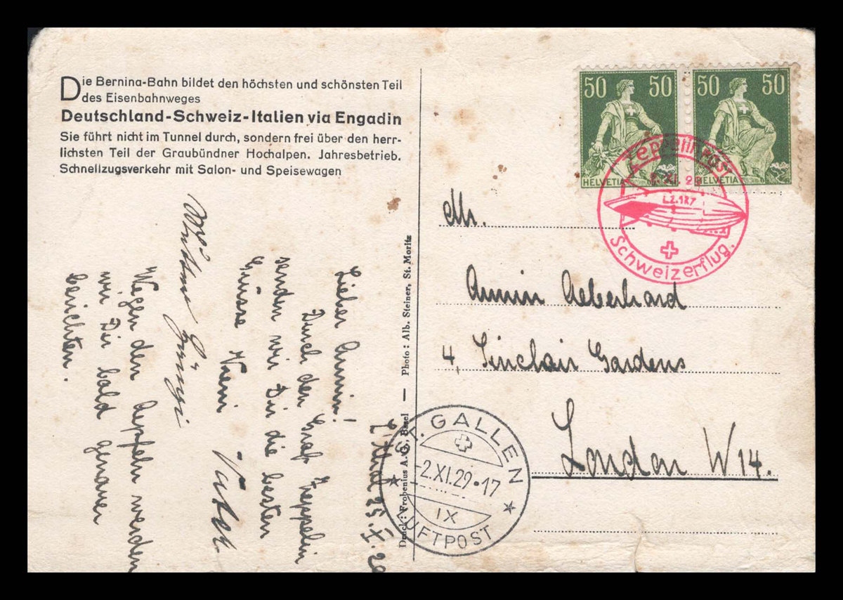 1932 Cover from Switzerland, the postcard was mailed from St Gallen on NOV.2.1929 to London, England, with the stamps tied by a red Zeppelin cachet (some toning spots and other wear), and the cover was mailed from Romanshorn on APR.30.1932 to