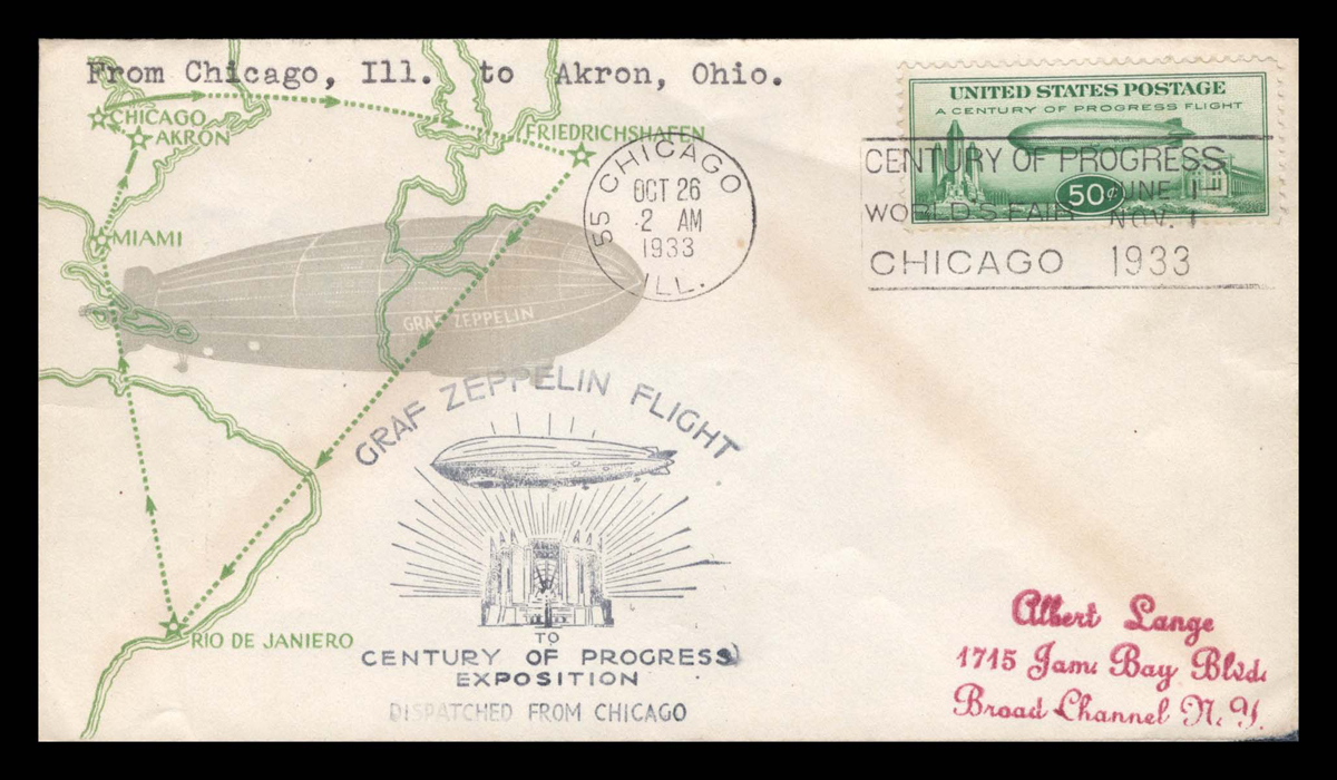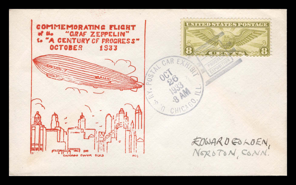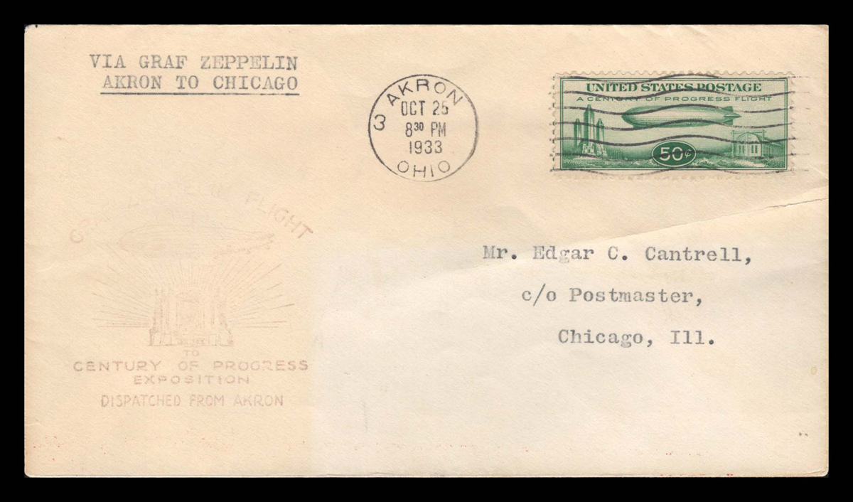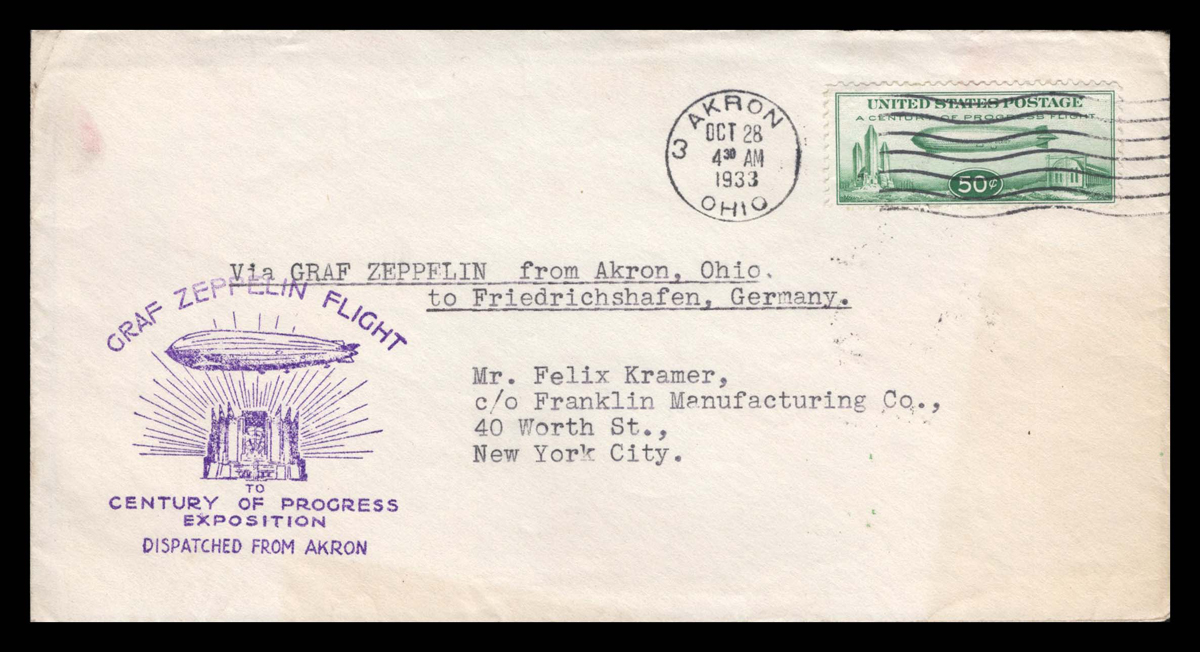 The Century of Progress Graf Zeppelin Flights, two were mailed from Akron, Ohio (OCT.25 and OCT.28), both have the purple "Century of Progress / Dispatched from Akron" cachet, one has a Chicago receiver and the other a Friedrichshafen transit on