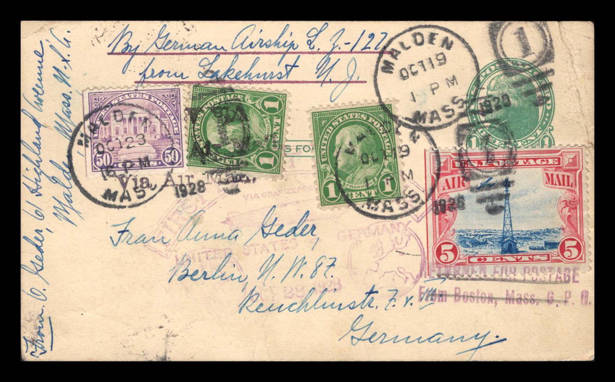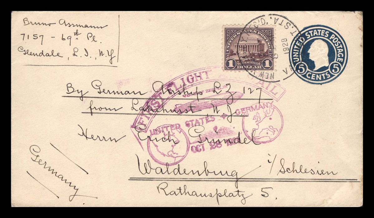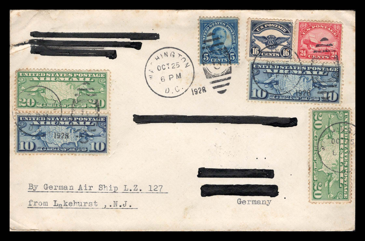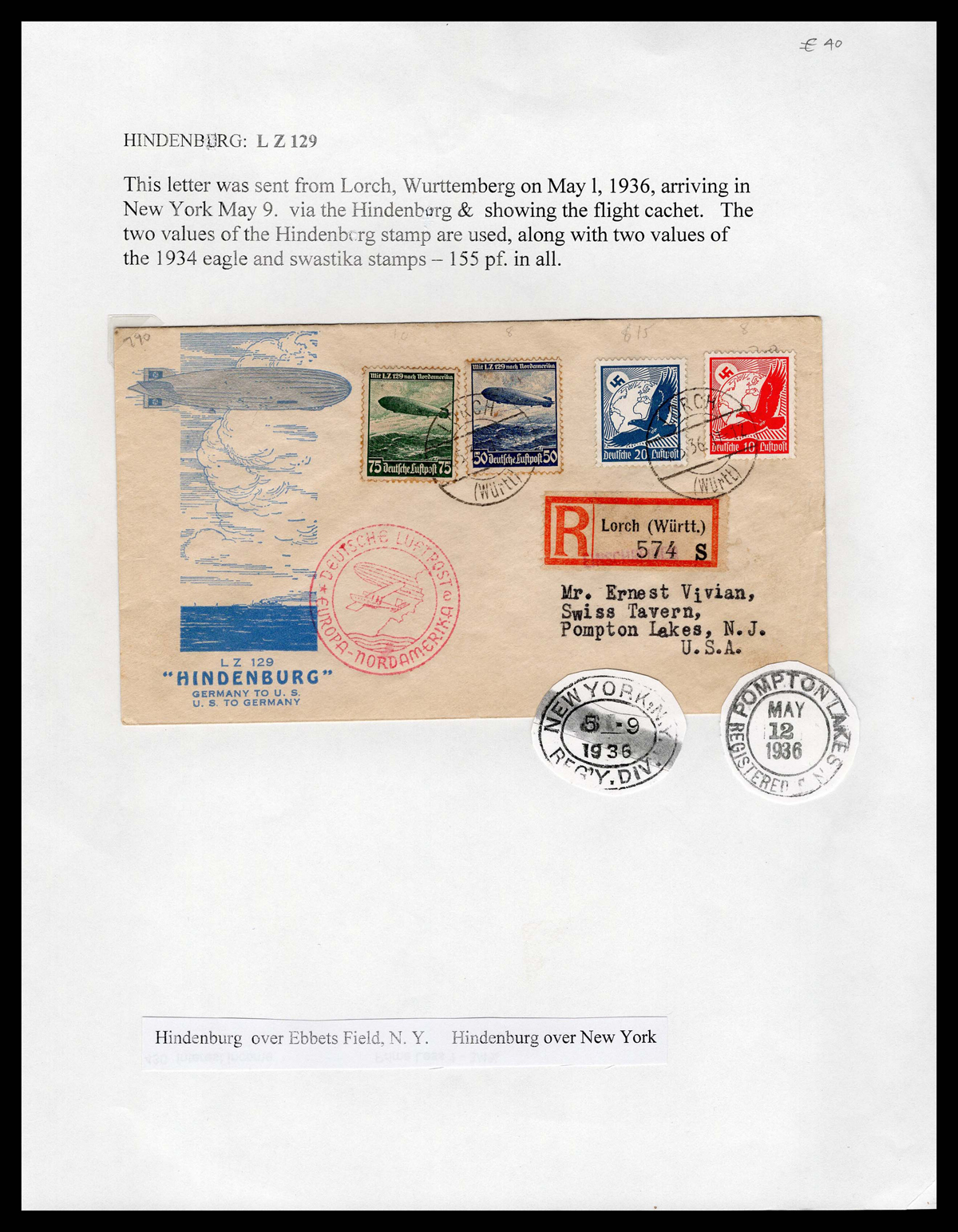 Covers Flown on the Hindenburg, three covers dated MAY.11.1926 have the purple "Lakehurst / Trans Atlantic / First Flight / Hindenburg". One is dated JUN.23, one OCT.9 and a registered cover is dated OCT.9 and has an "Opened by Customs" (in