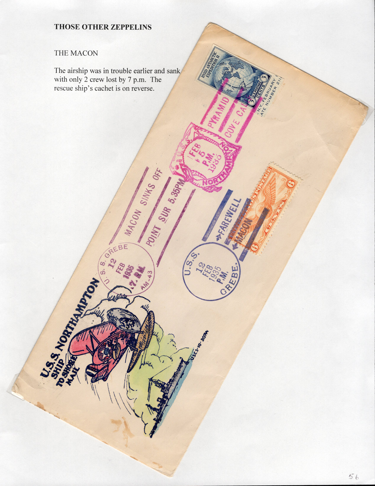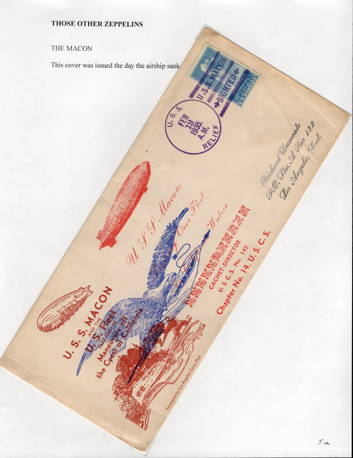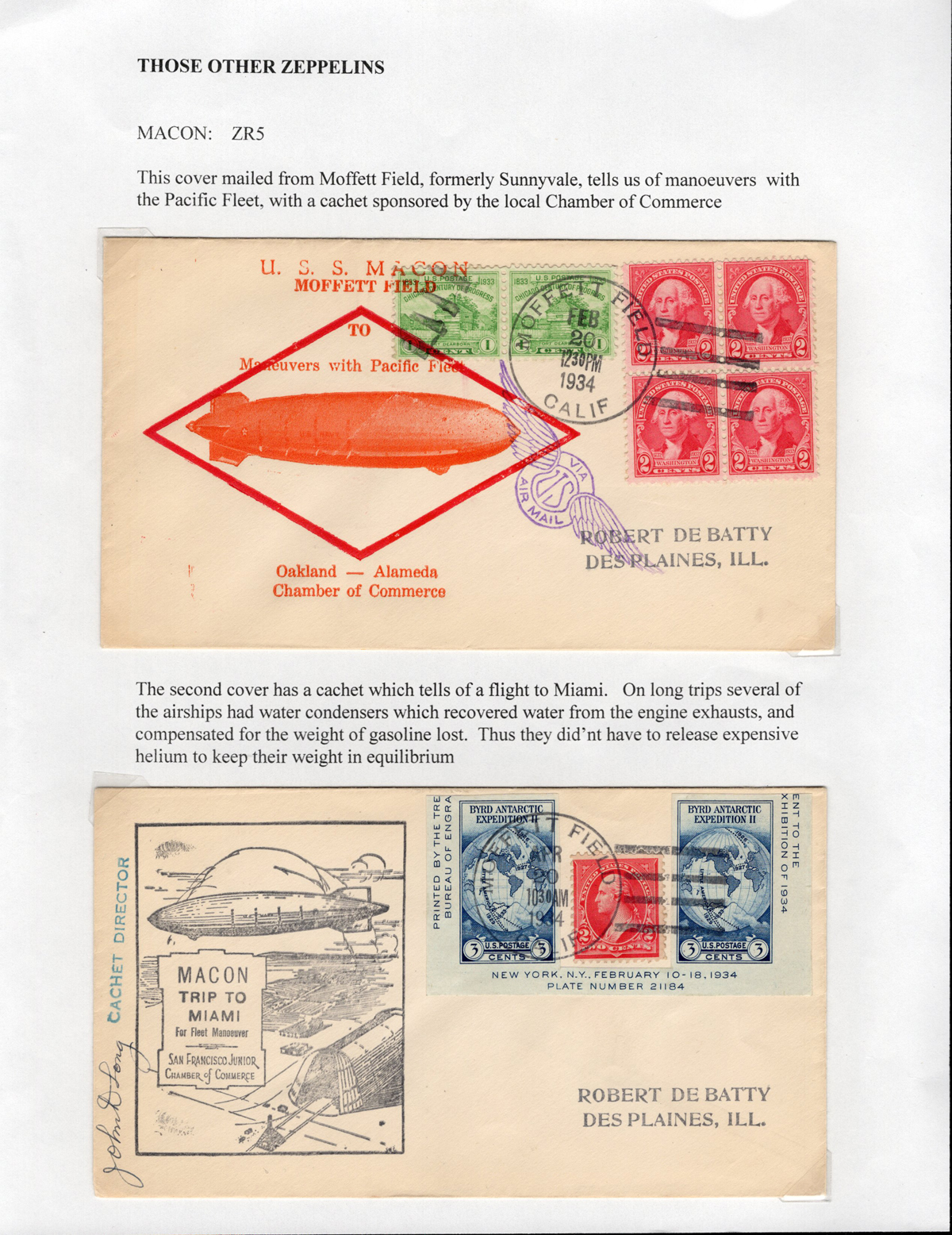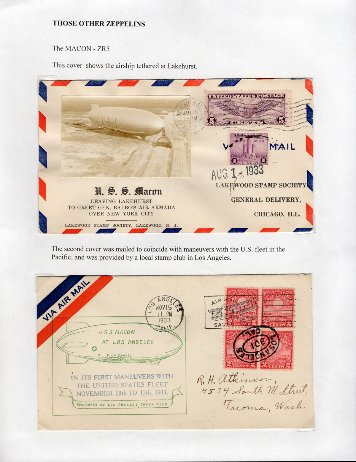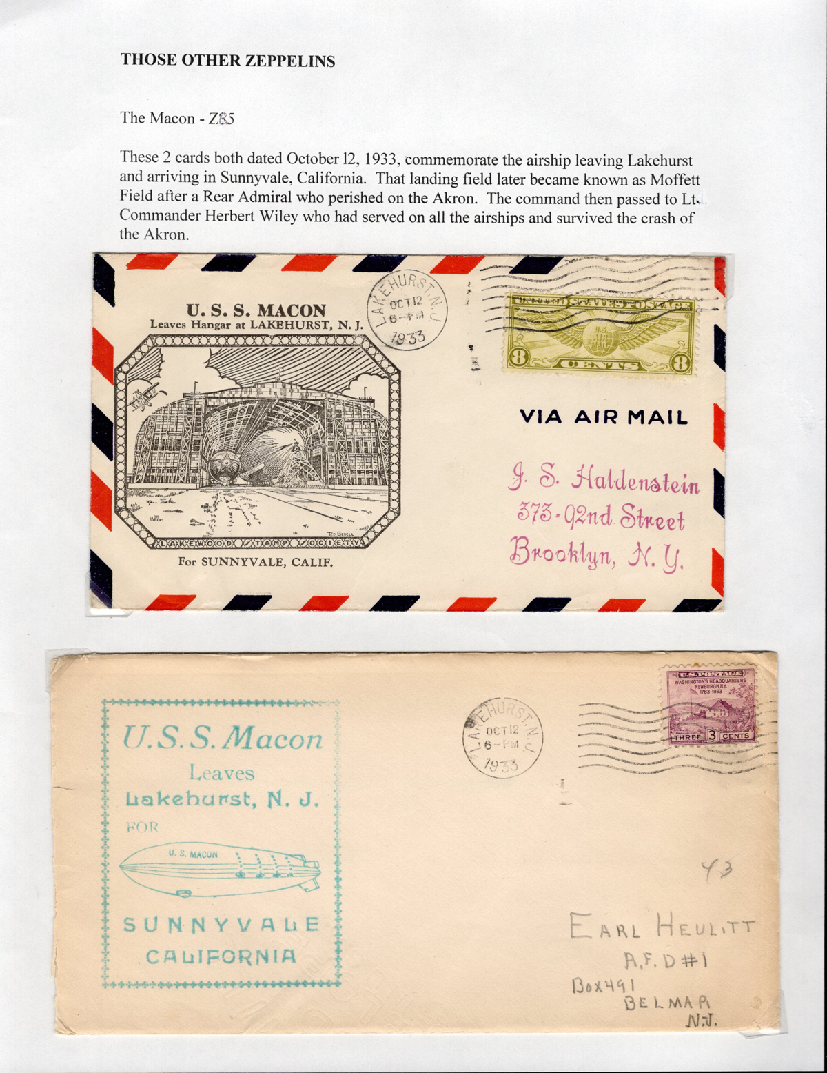 Different U.S.S. Macon Flown Covers, ideally each with a different cachet, mailed 1933: JUL7, JUL.18, OCT.12 (x2), NOV.15, 1934: FEB.20, APR.20 and 1935: FEB.5 and FEB.12. The JUL.18.1933 cover has a real photo of the U.S.S. Macon tethered at