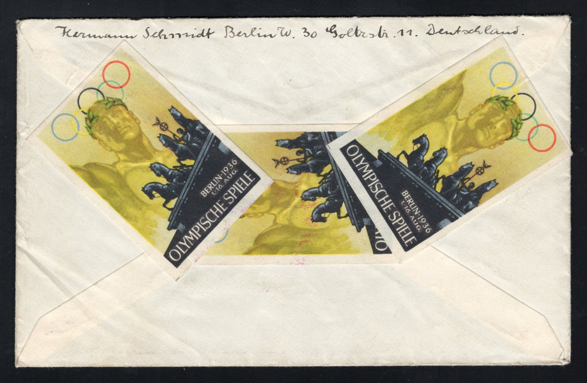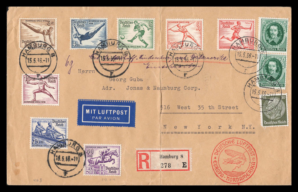 Zeppelin Cover to New York City, mailed from Hamburg on MAY.5.1936, with red Europe to North America flight cachet on front, and MAY.20 New York receivers on back. Franked with a complete set of the Summer Olympics issue plus a few others.