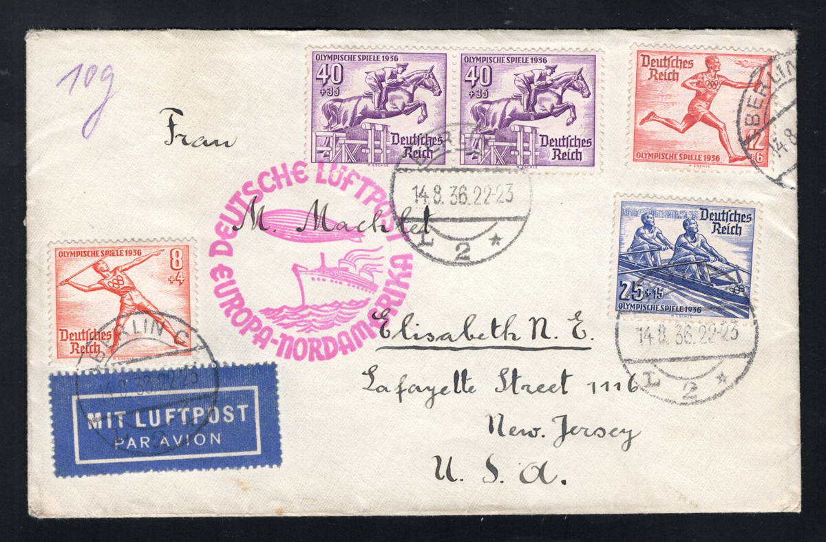 America Zeppelin Cover, mailed from Berlin on AUG.14.1936 to New Jersey, with pink Europe to North America flight cachet and franked with four different (5 in all) Summer Olympics issues. The cover still has its original letter inside (likely
