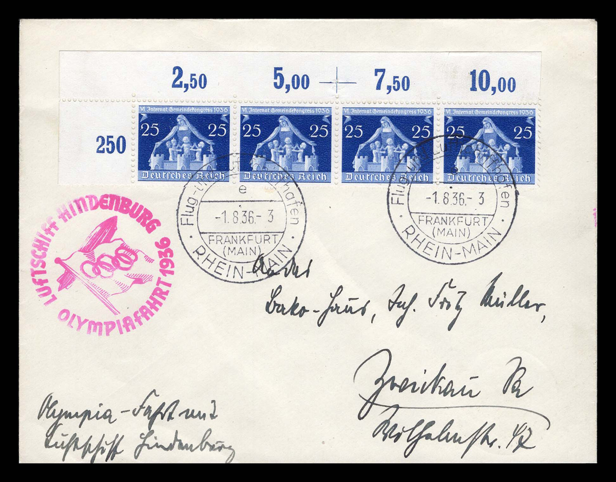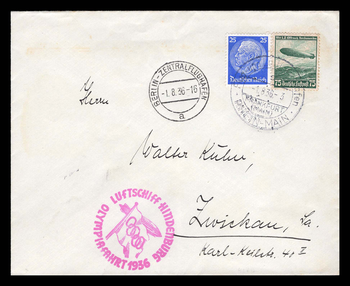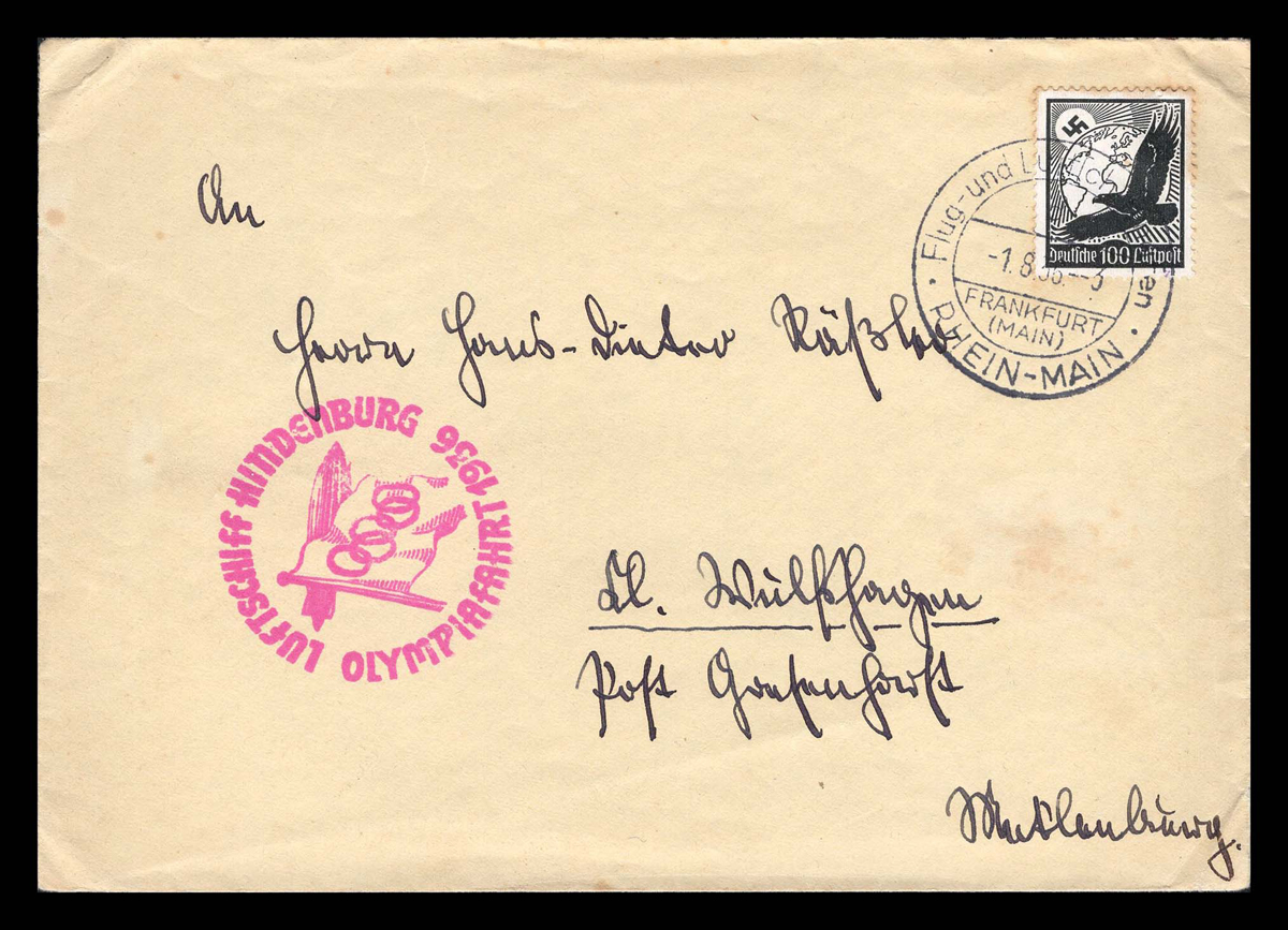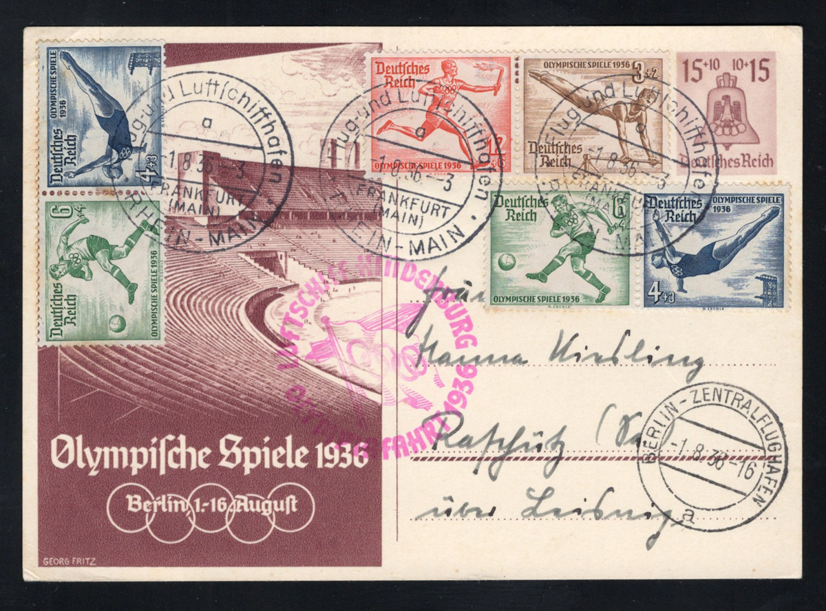and 1 Cover from the Frankfurt to Frankfurt Hindenburg Flight, each with an with Olympic Games flight cachet and AUG.1 Berlin receiver, franked with a variety of stamps (all paying the 50 pf for cards and 100 pf for cover rate). One is a real