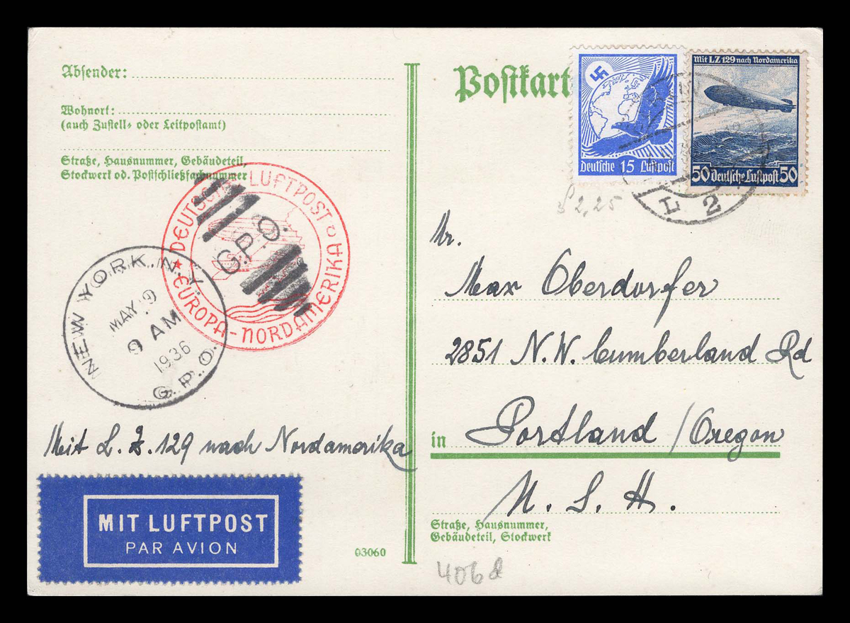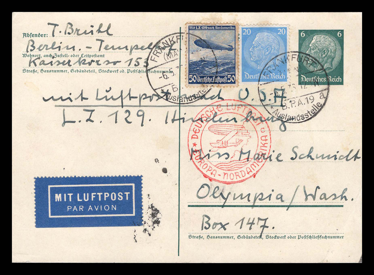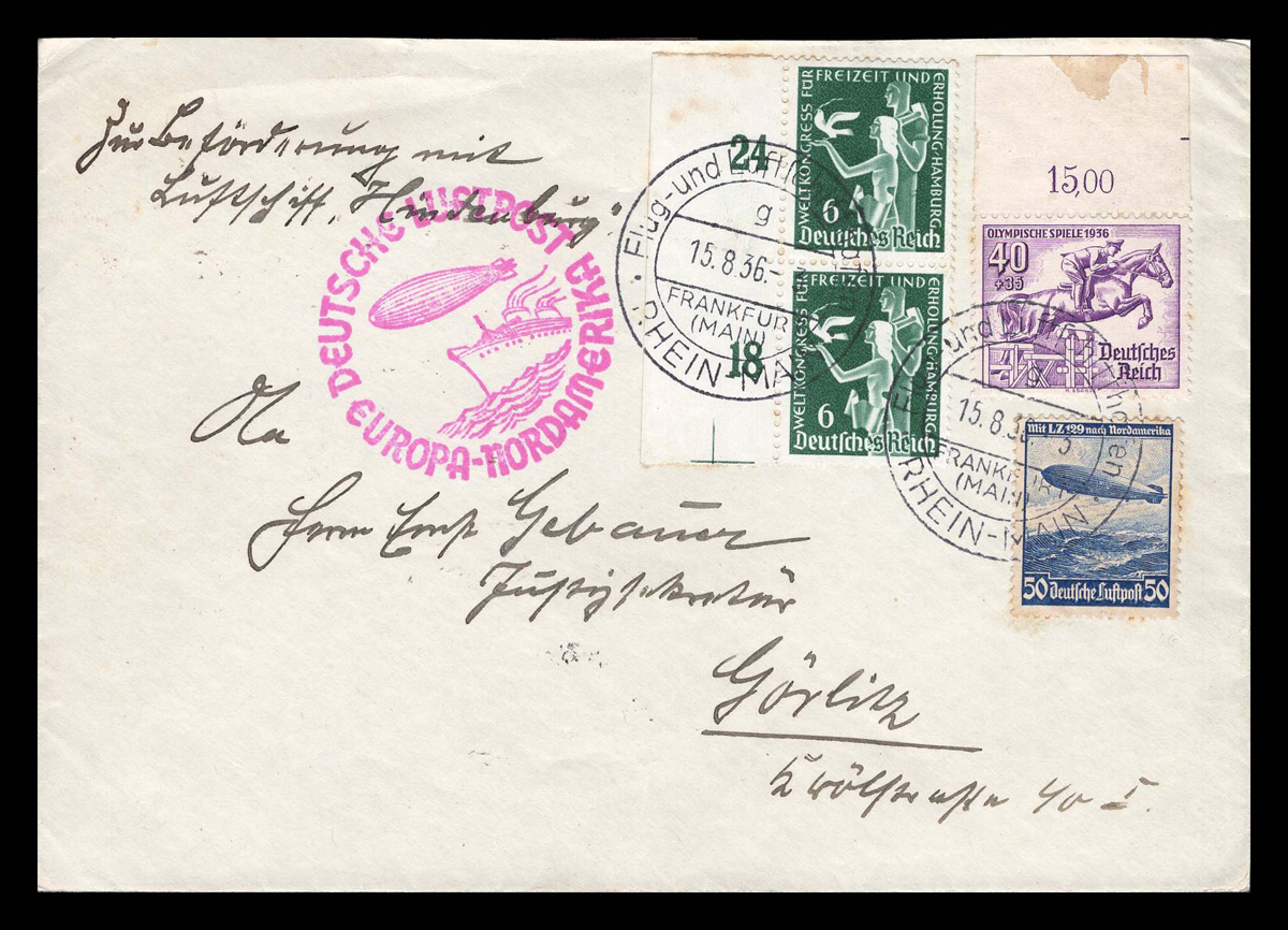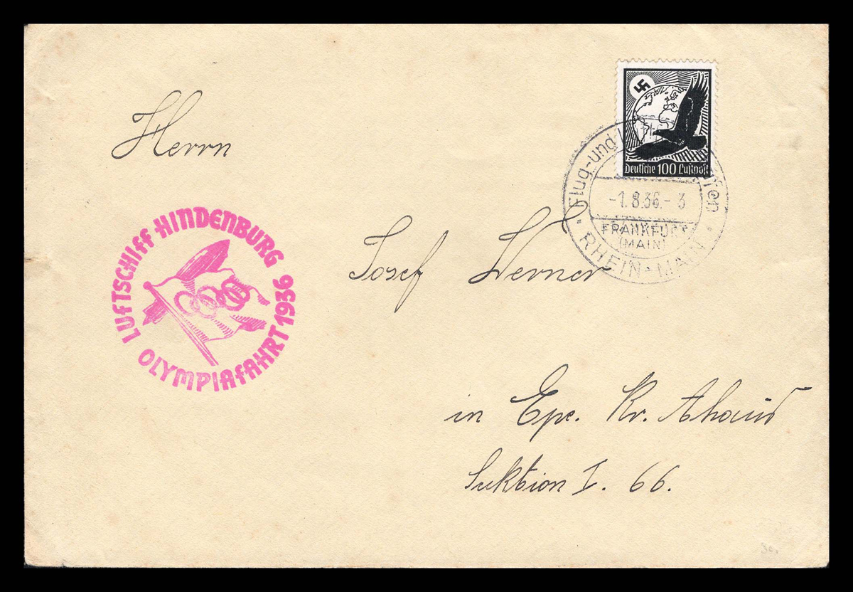 and 1 Cover from the Frankfurt to Frankfurt Hindenburg Flight, each with an with Olympic Games flight cachet and AUG.1 Berlin receiver, franked with a variety of stamps (all paying the 50 pf for cards and 100 pf for cover rate). One is a real