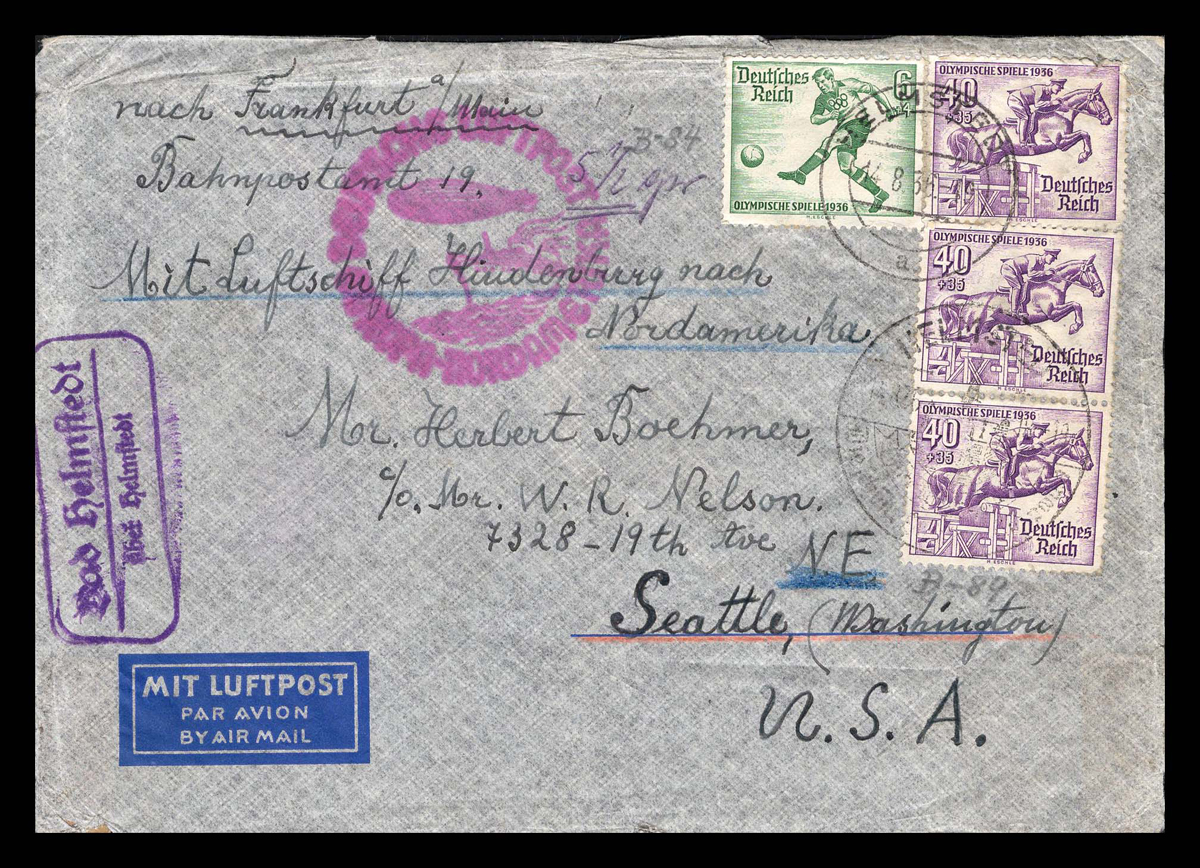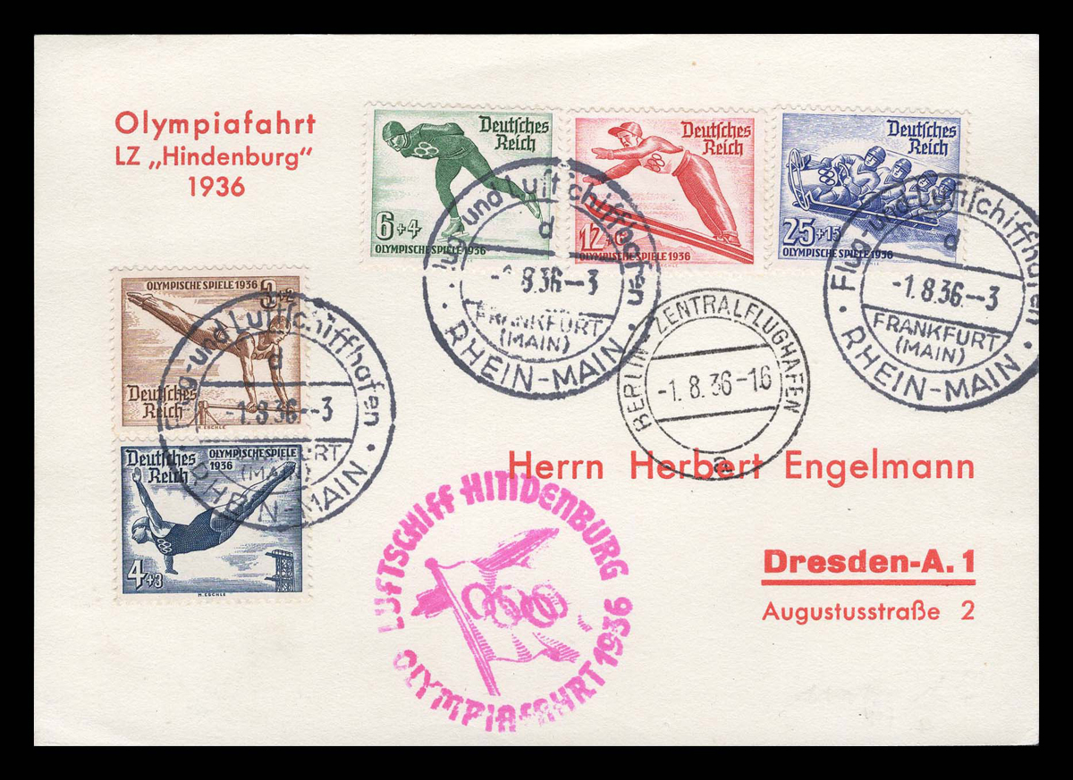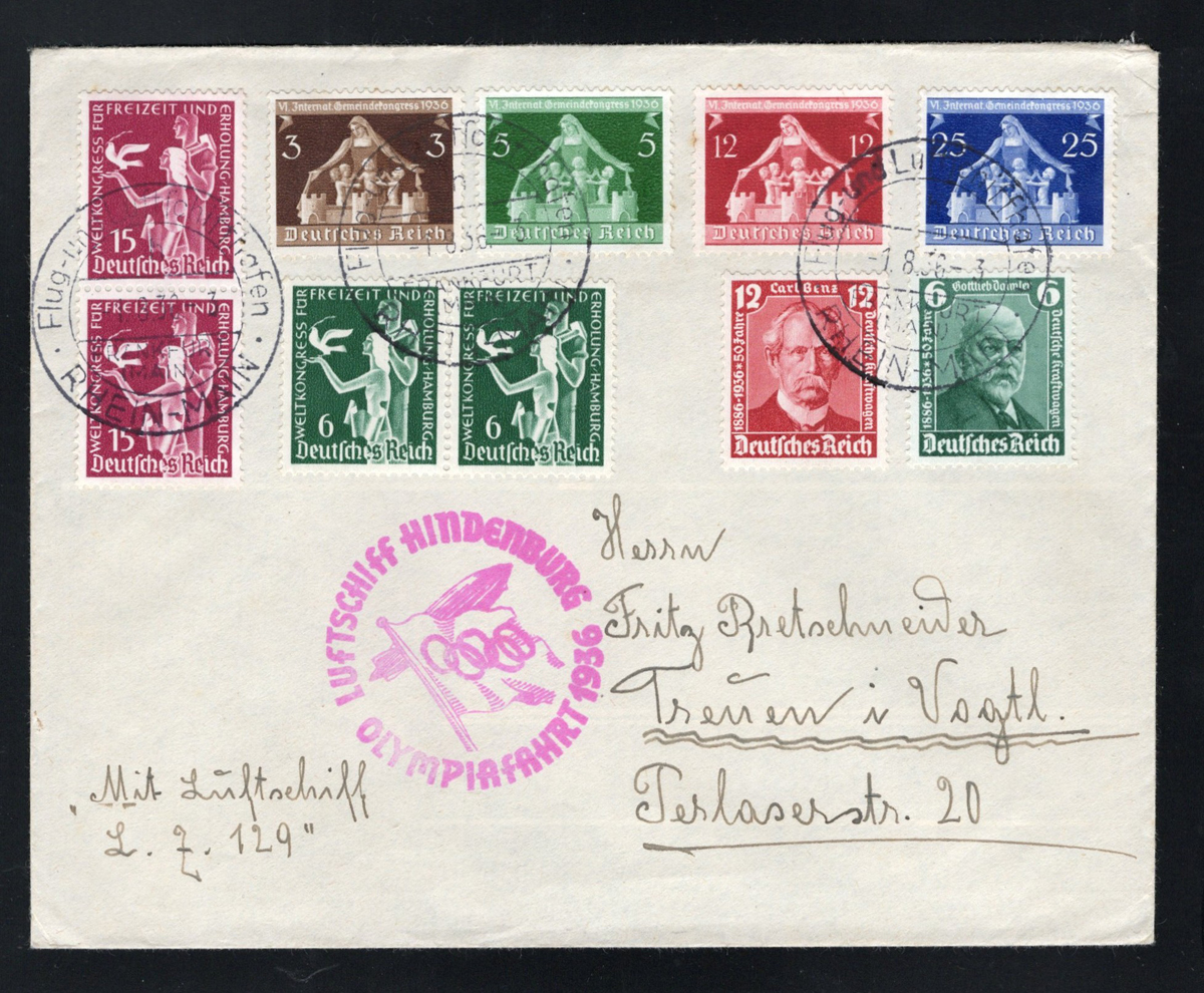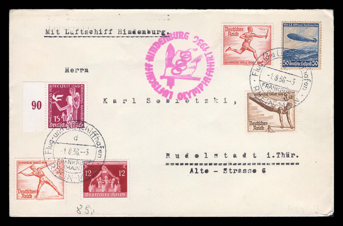 Frankfurt to Frankfurt Hindenburg Flight Cover, with Olympic Games flight cachet and AUG.1 Berlin receiver on back, this cover is franked with three complete sets (Scott #s 470-471, 473-476, 477-478), very fine and attractive.