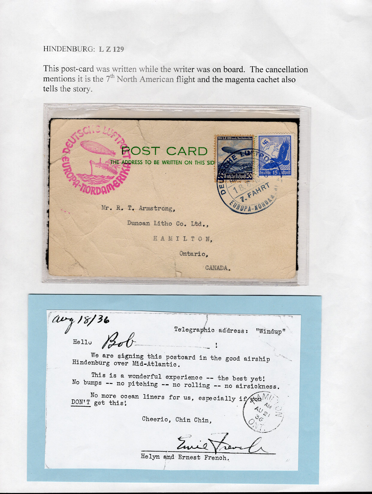 Flown on the Hindenburg Europe to North America Flight, a cover mailed on AUG.14 to United States, another cover AUG.15 to Germany and a postcard on AU.18 (from a passenger on board) to Hamilton, Canada (this one with an interesting message,