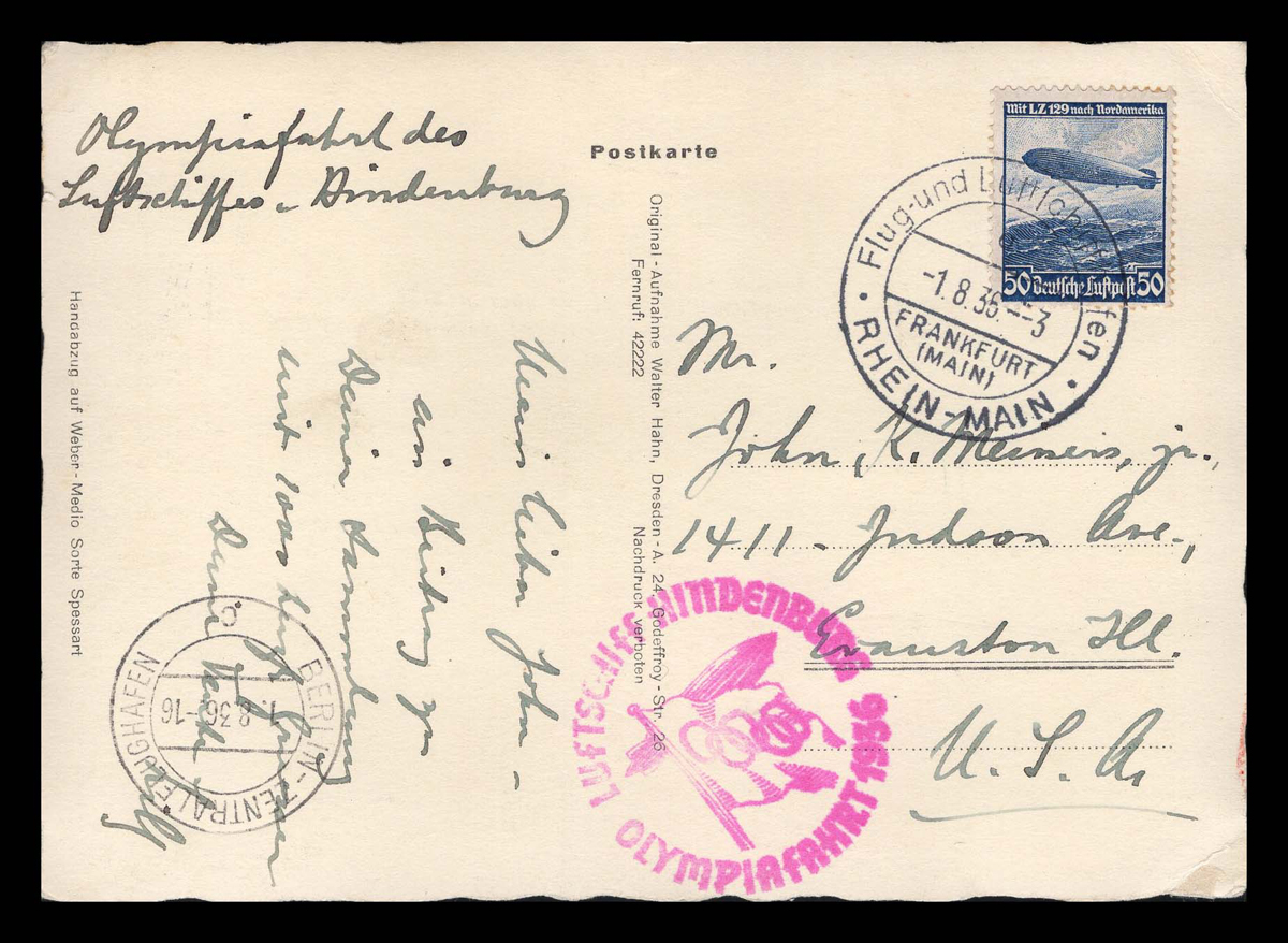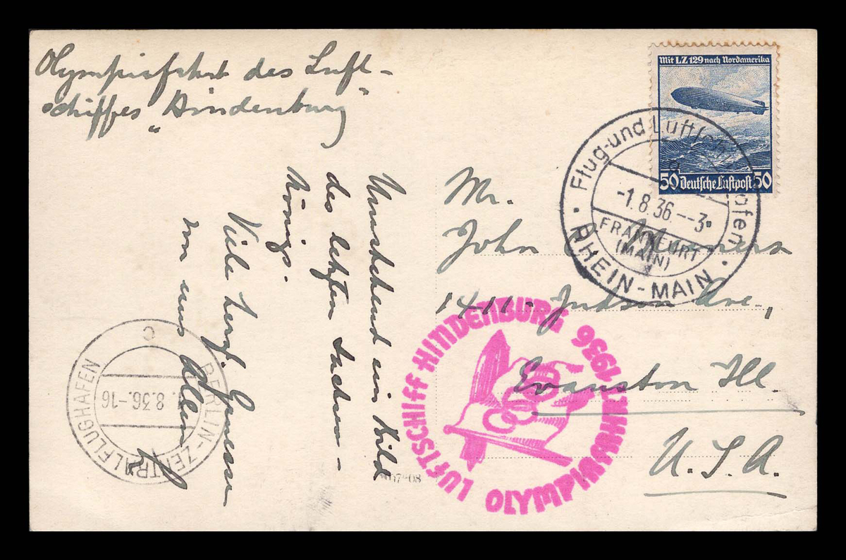 Postcards and 1 Cover from the Frankfurt to Frankfurt Hindenburg Flight, each with an with Olympic Games flight cachet and AUG.1 Berlin receiver, franked with a variety of stamps, includes an uprated Olympic Games illustrated card as well as a