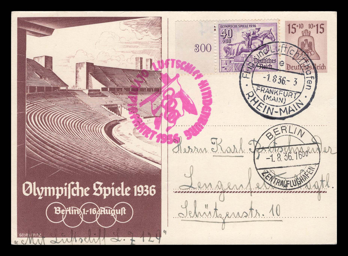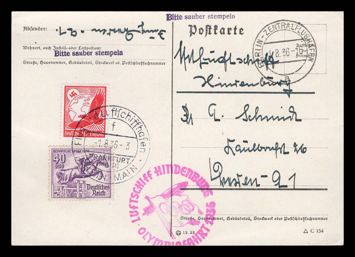 Frankfurt to Frankfurt Hindenburg Flight Olympics Illustrated Card, an uprated special postcard with an with Olympic Games flight cachet and AUG.1 Berlin receiver, franked with 6 Olympic Games stamps (a few have slight perf toning spots), very